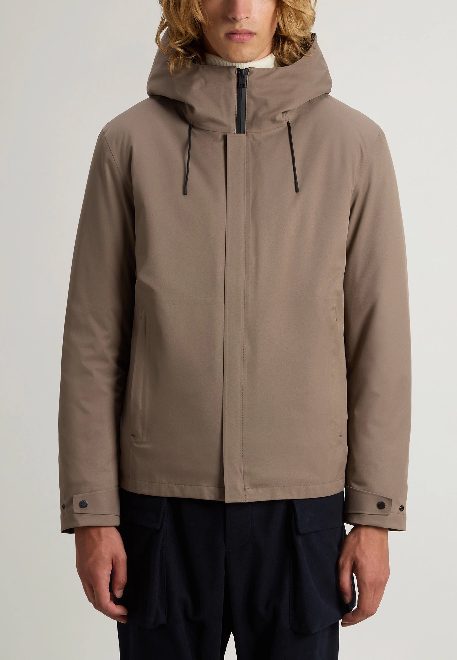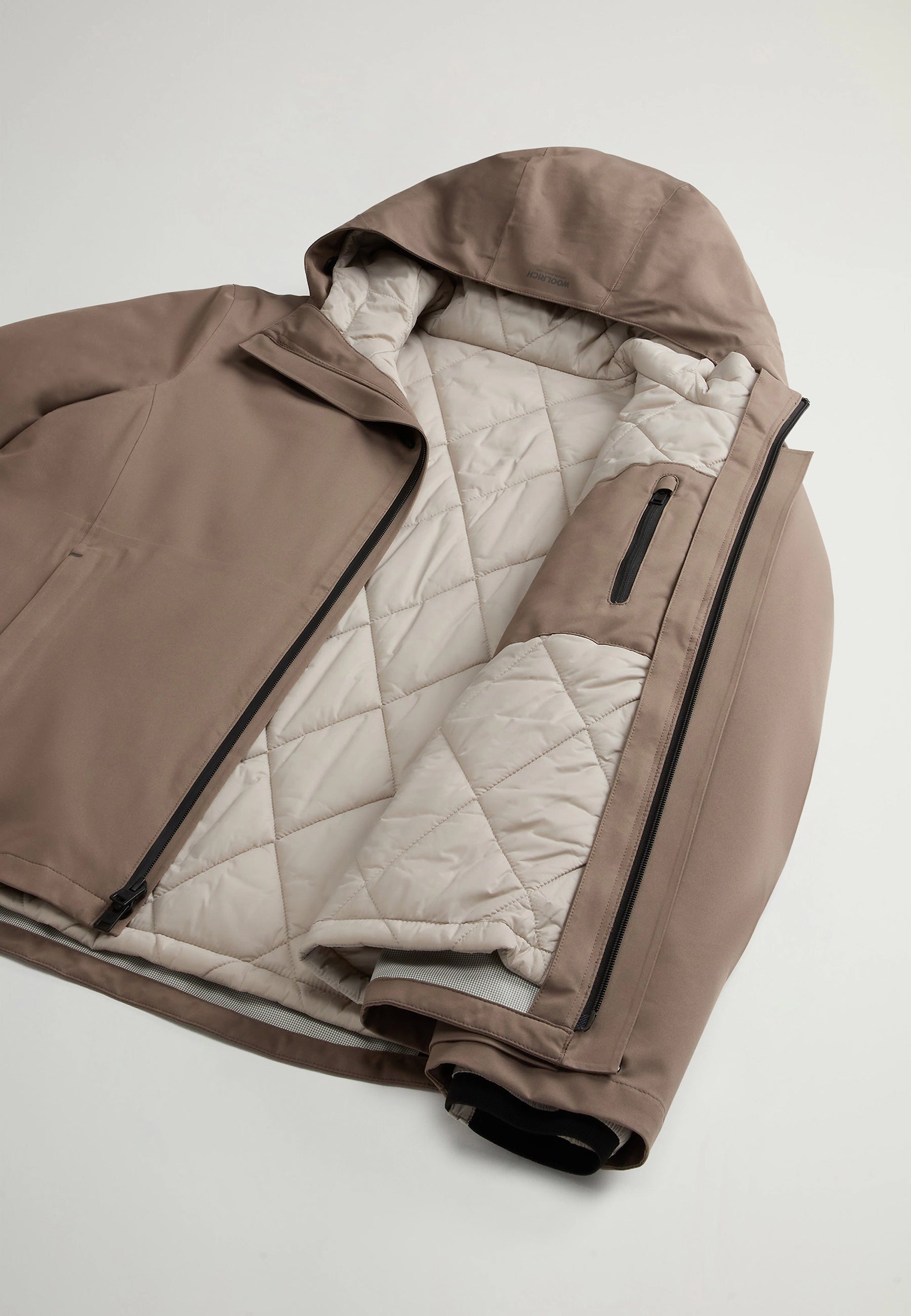 Progettata per garantire massima versatilità e protezione, questa giacca 3 in 1 è realizzata in twill di poliestere a 2,5 strati, idrorepellente, resistente al vento e traspirante. Lo strato esterno è parzialmente nastrato per una protezione extra e presenta cappuccio regolabile, zip bidirezionale impermeabile parzialmente coperta da patta, due tasche con zip, polsini regolabili e dettagli riflettenti sui lati per una maggiore visibilità al buio. Il design include una giacca interna rimovibile, imbottita e dotata di cappuccio, double face con un lato trapuntato e uno liscio a tinta unita. Ha tasche a filetto e tasca interna con zip sul lato trapuntato. È collegata allo strato esterno tramite una zip centrale, un bottone a pressione sul cappuccio e passanti su polsini e collo. I due strati possono essere indossati insieme o separatamente, in base alle condizioni climatiche o allo stile desiderato.