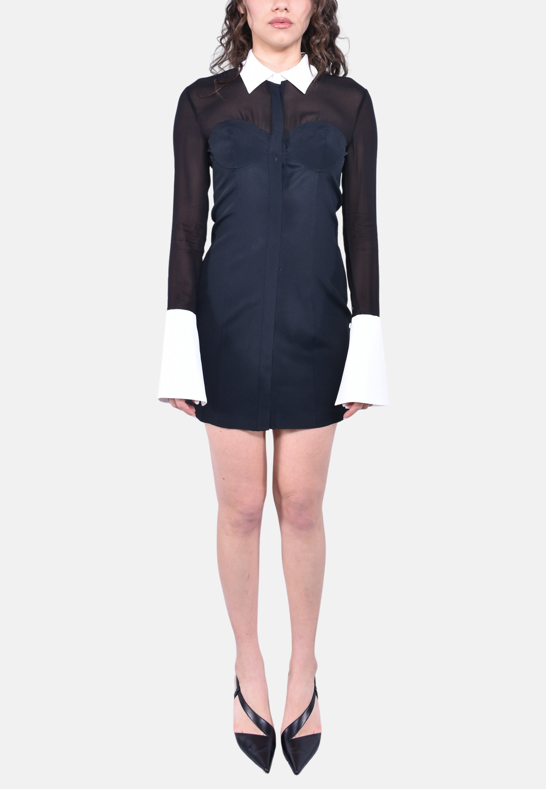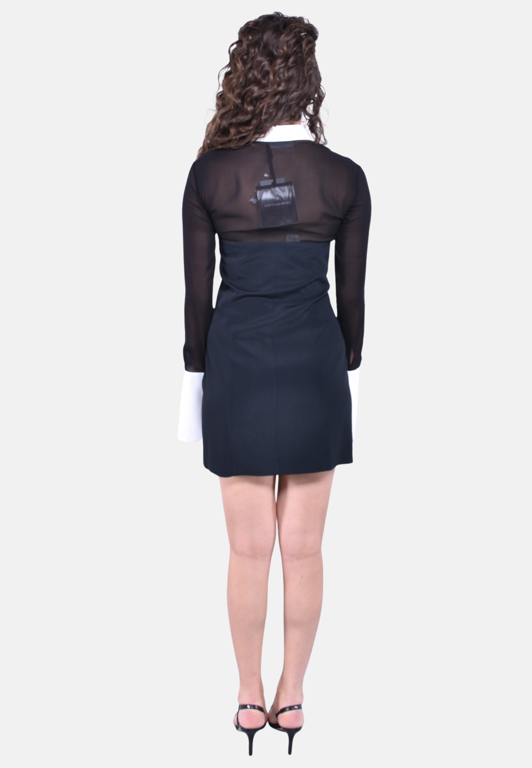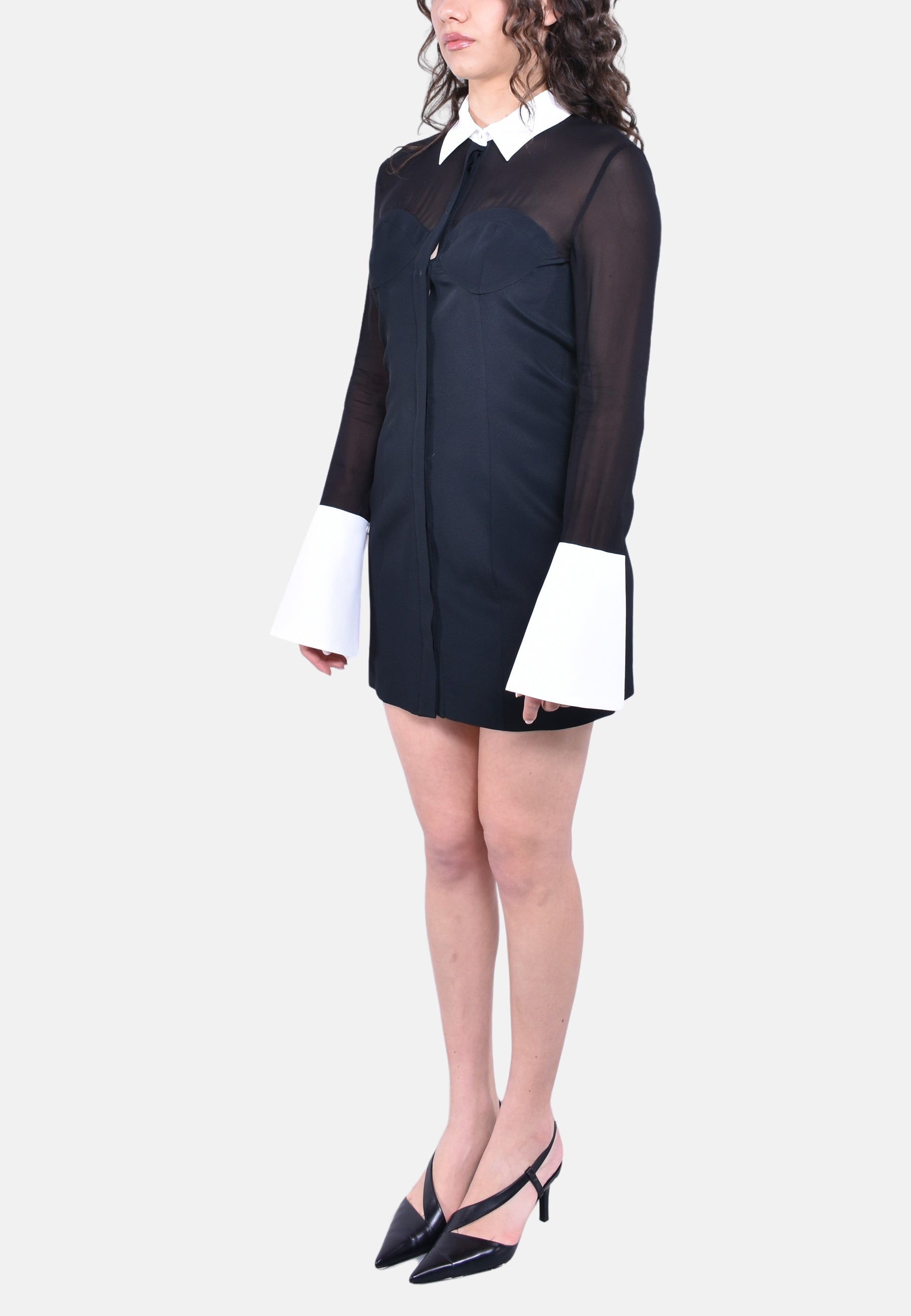 Vestito mini in doppio tessuto, stile camicia a manica lunga, polsini alti, vestibilità fit, bottoncini rivestiti sul centro davanti e chiusura con zip laterale nascosta.