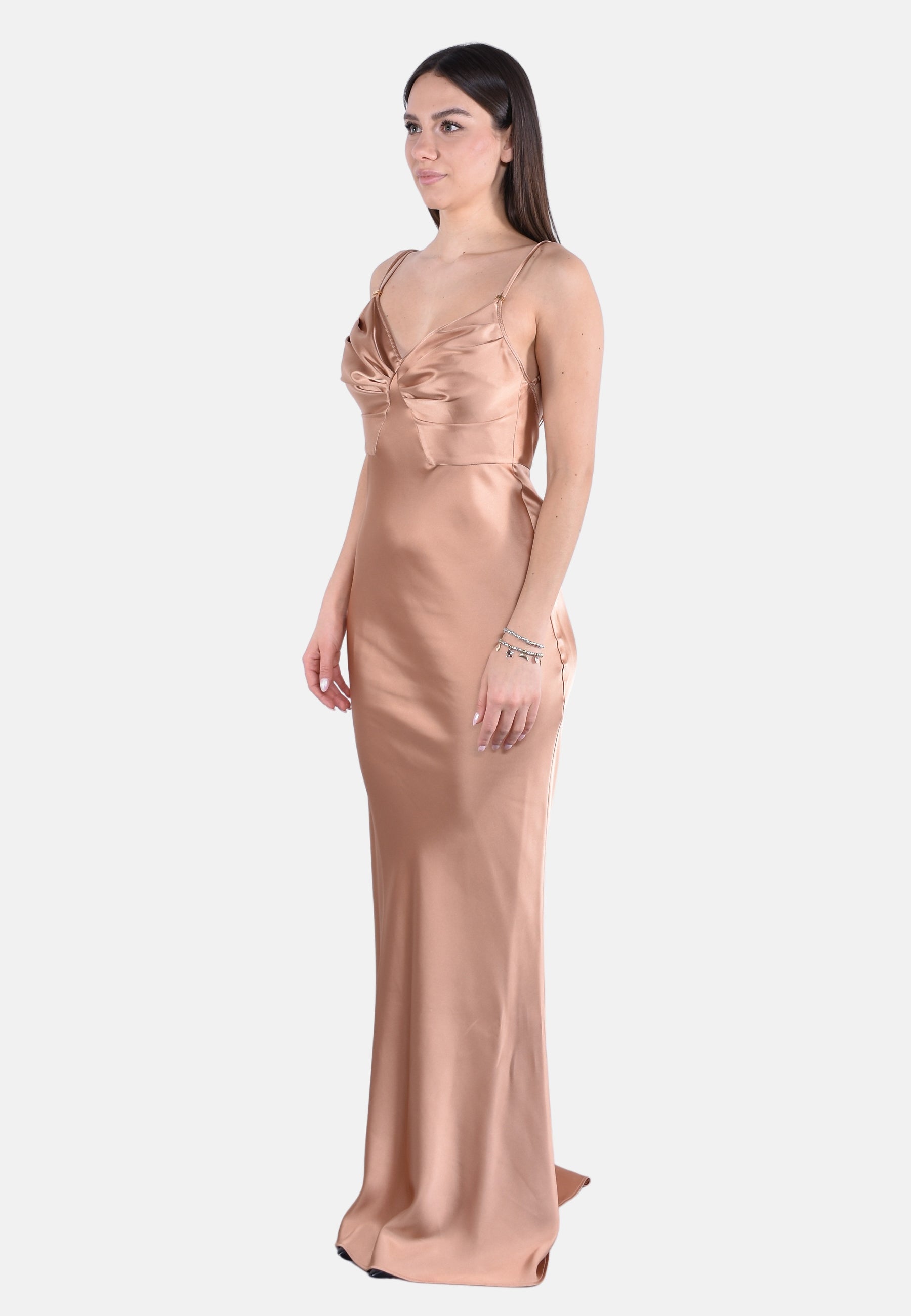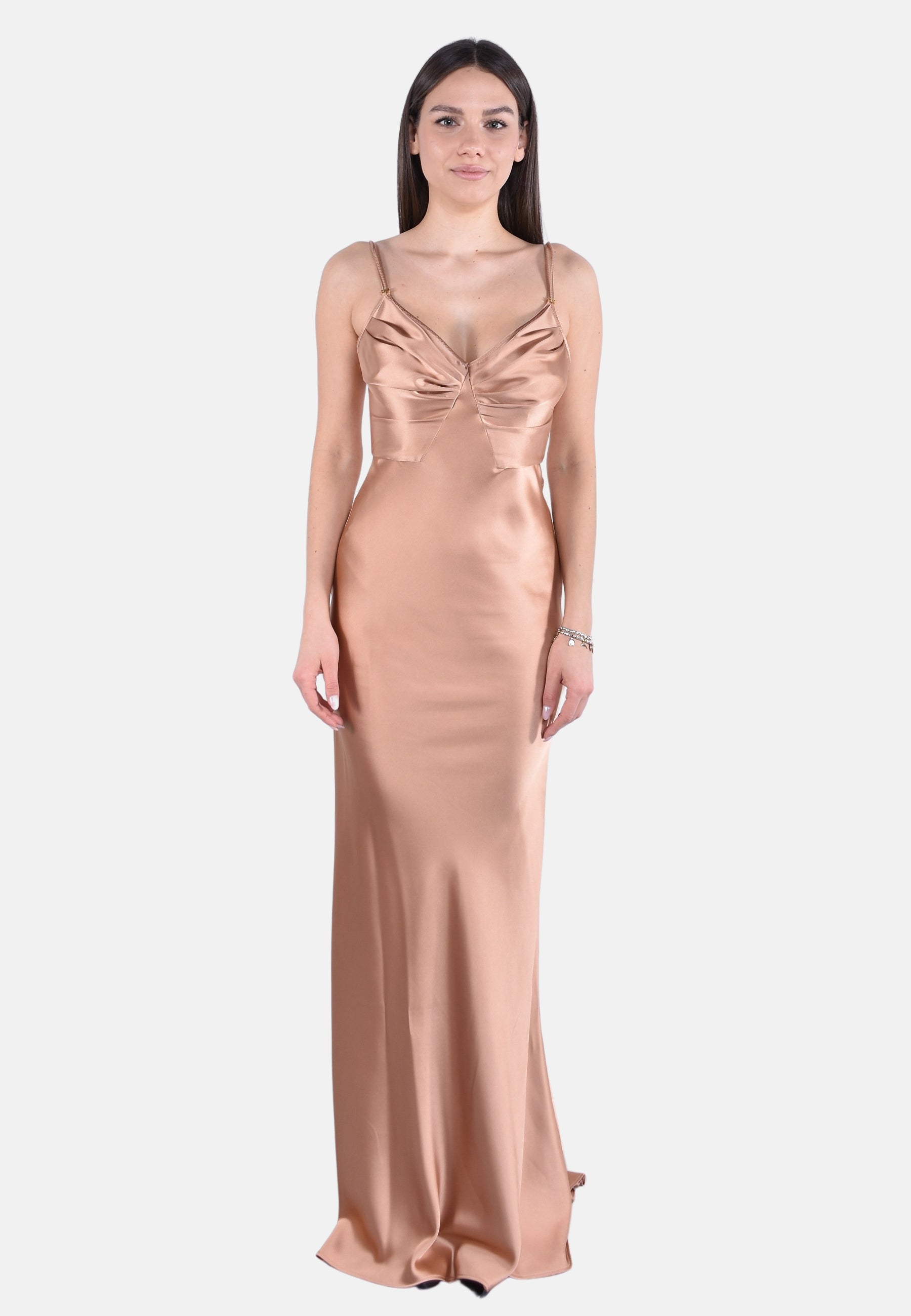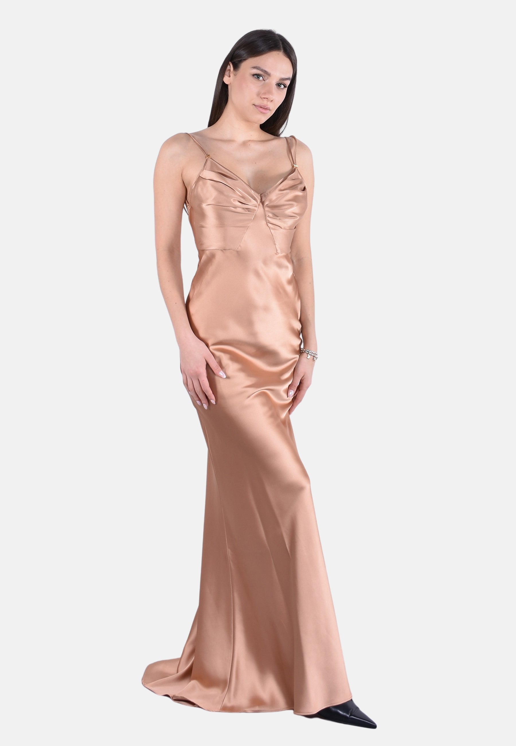 Abito da sera in raso dalla vestibilità slim. Il vestito ha doppie spalline, trattenute dal dettaglio in metallo dorato con logo. Si distingue per le coppe ingentilite da motivi di arricciatura e per la gonna lunga con coda a sirena, per una silhouette d'impatto.