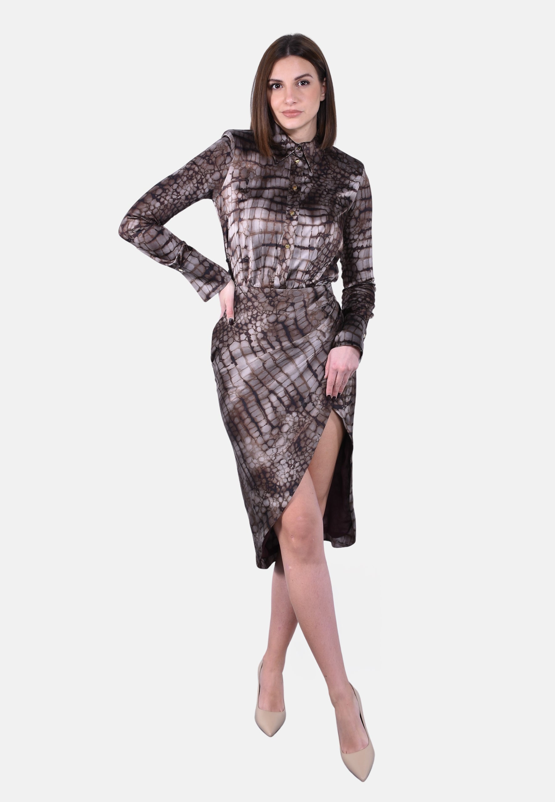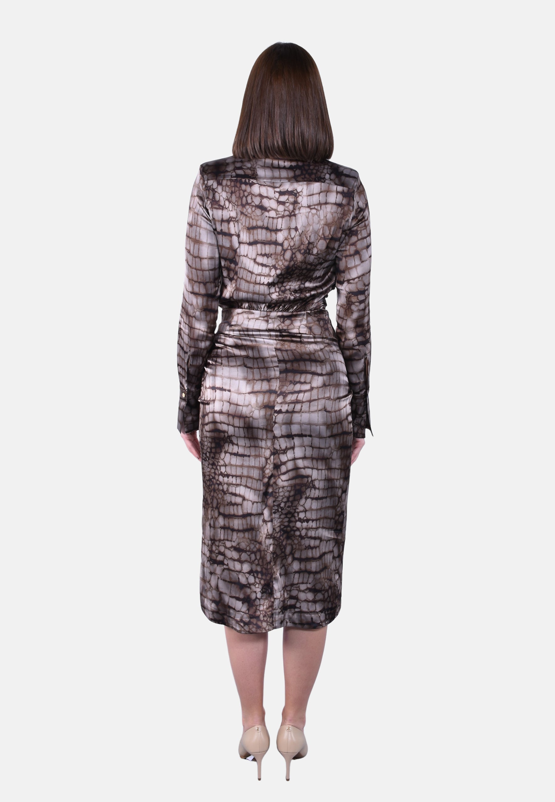 Abito in raso stretch dalla vestibilità regular. Il vestito ha collo a camicia, maniche lunghe e spalle strutturate che regalano una silhouette definita. Protagonista è la stampa all-over a tema alligatore, ispirata a forme e geometrie naturali. Bottoni in metallo per piccole note di luce.