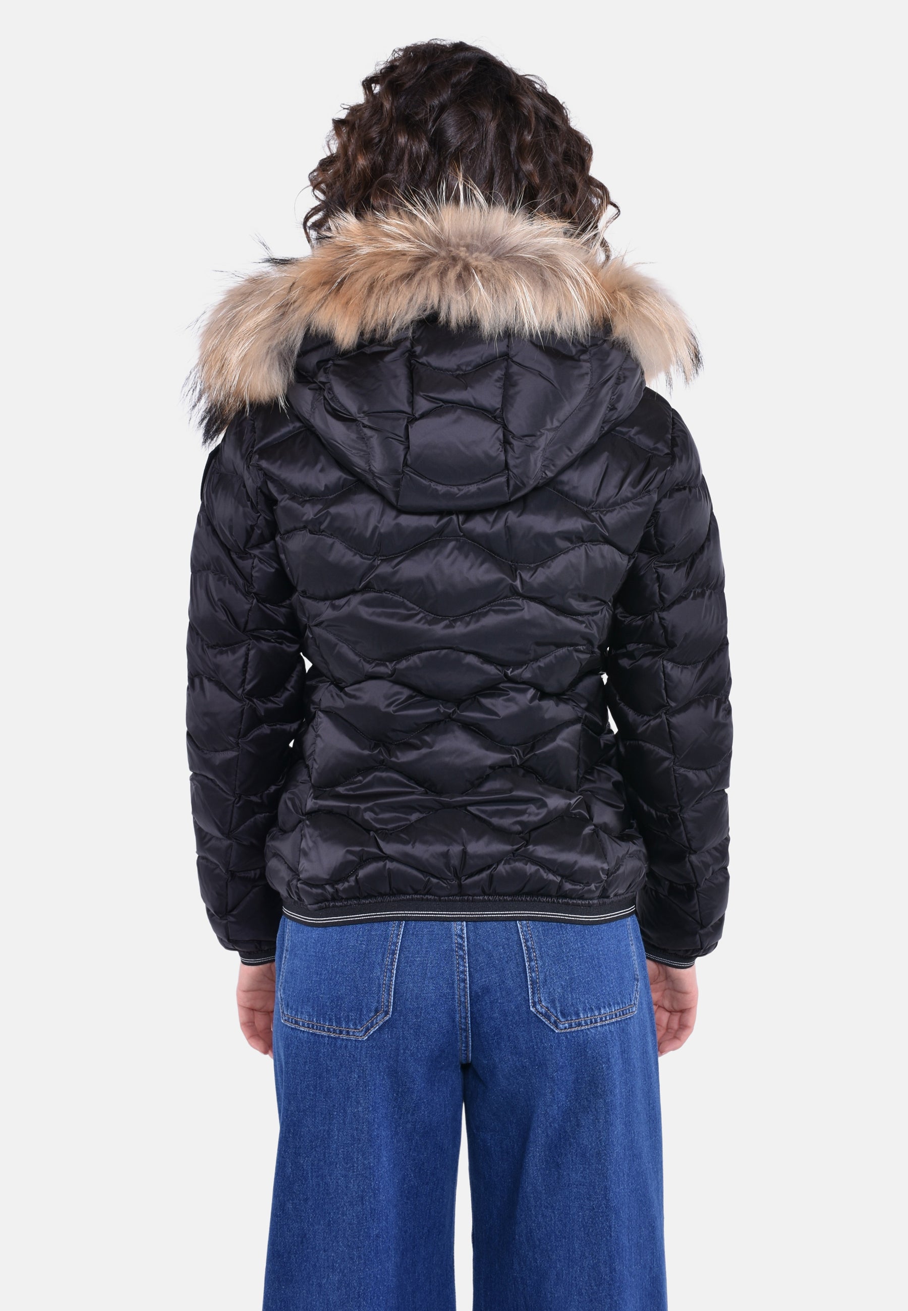 Cappuccio fisso e bordo con vera pelliccia removibile tramite zip.