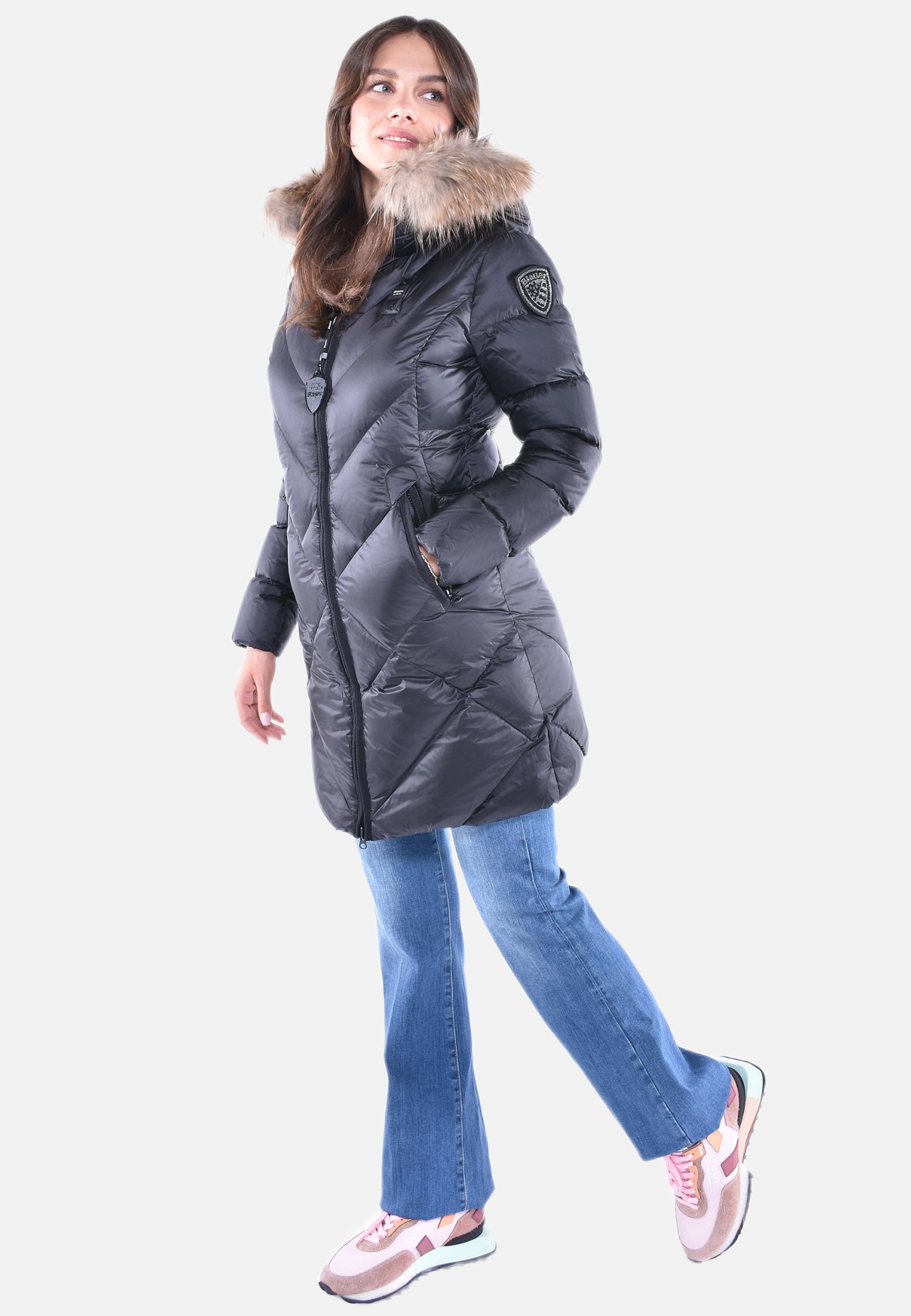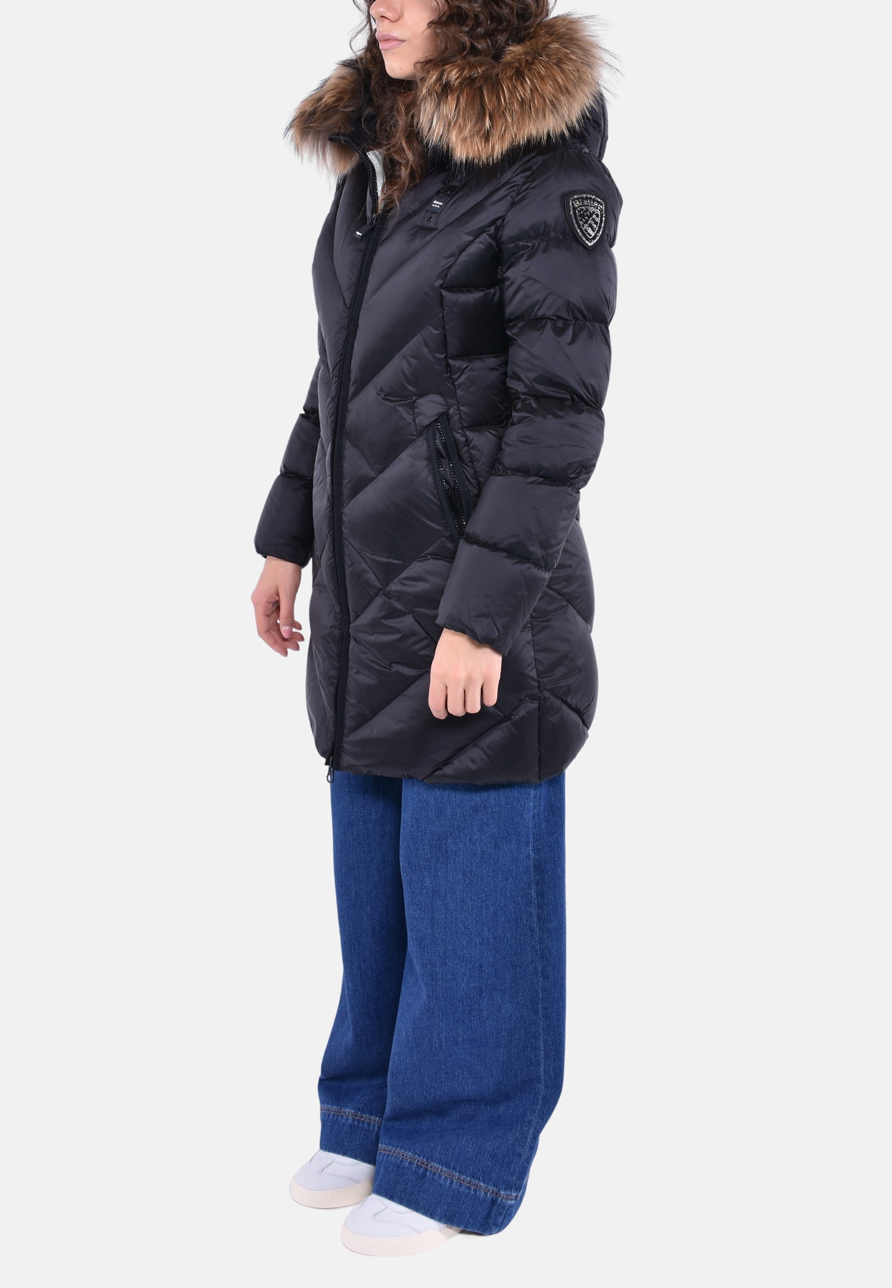 Passante Blauer cucito sul petto a sinistra e patch Blauer staccabile con decoro in Swarovski sulla manica sinistra.