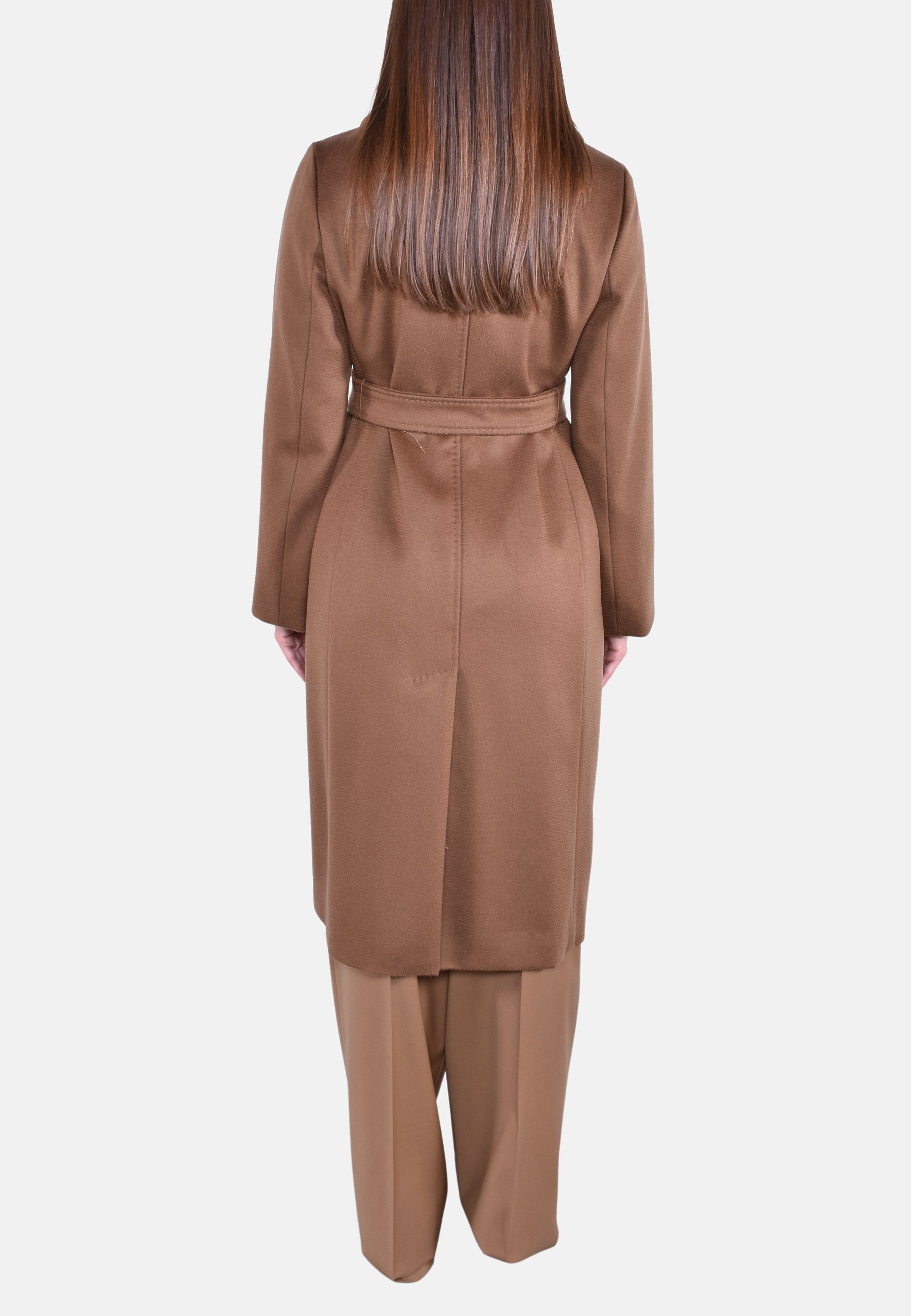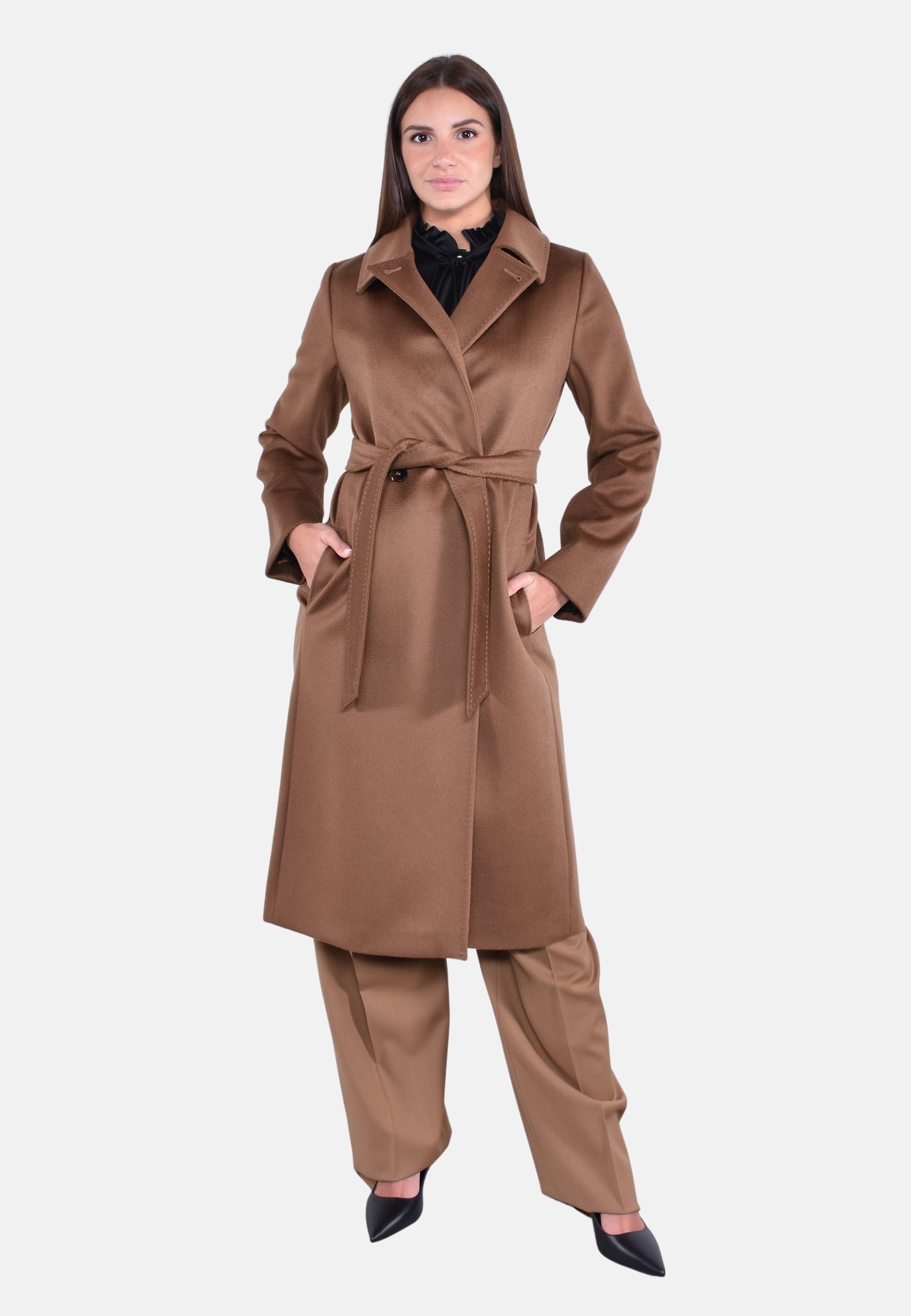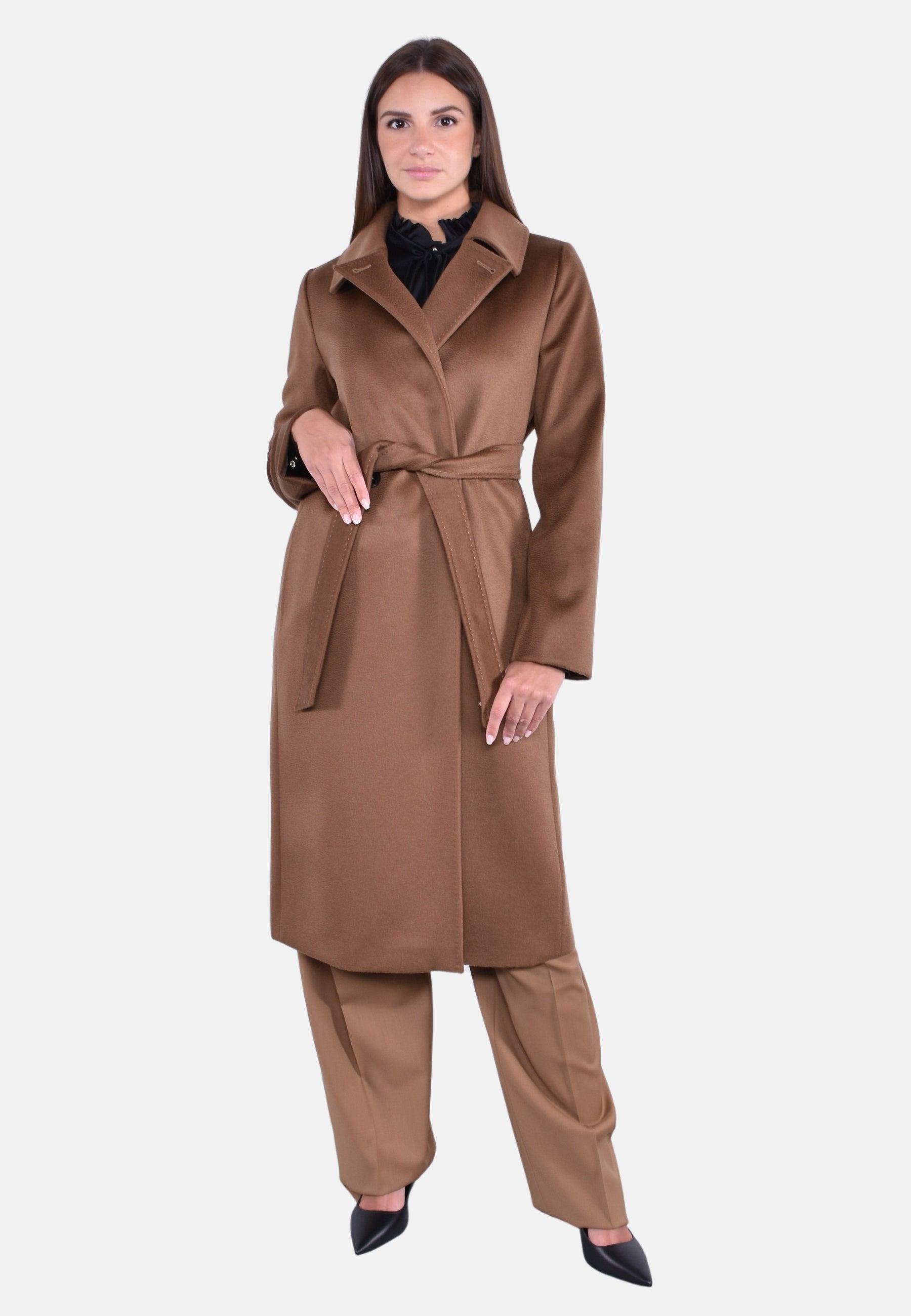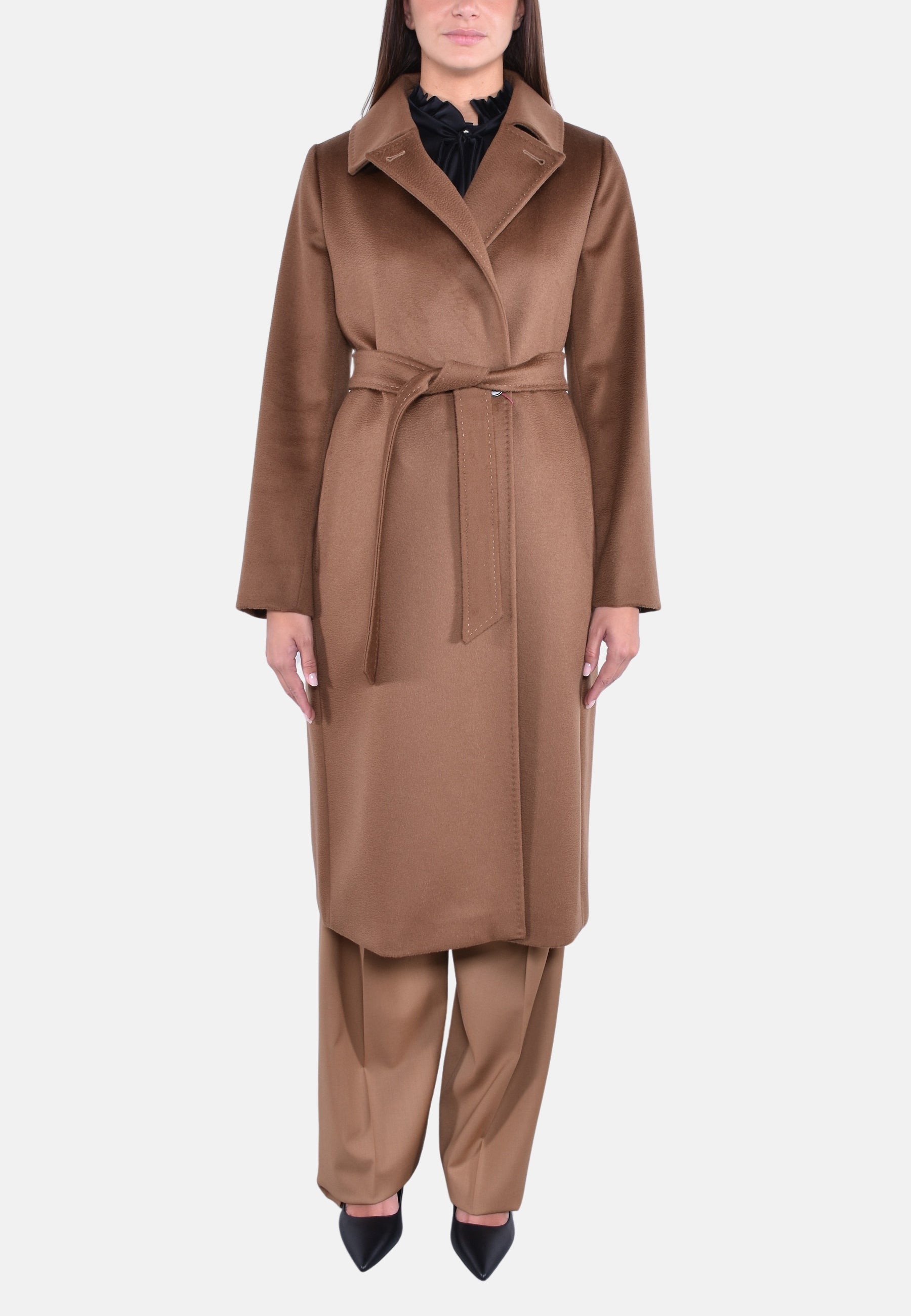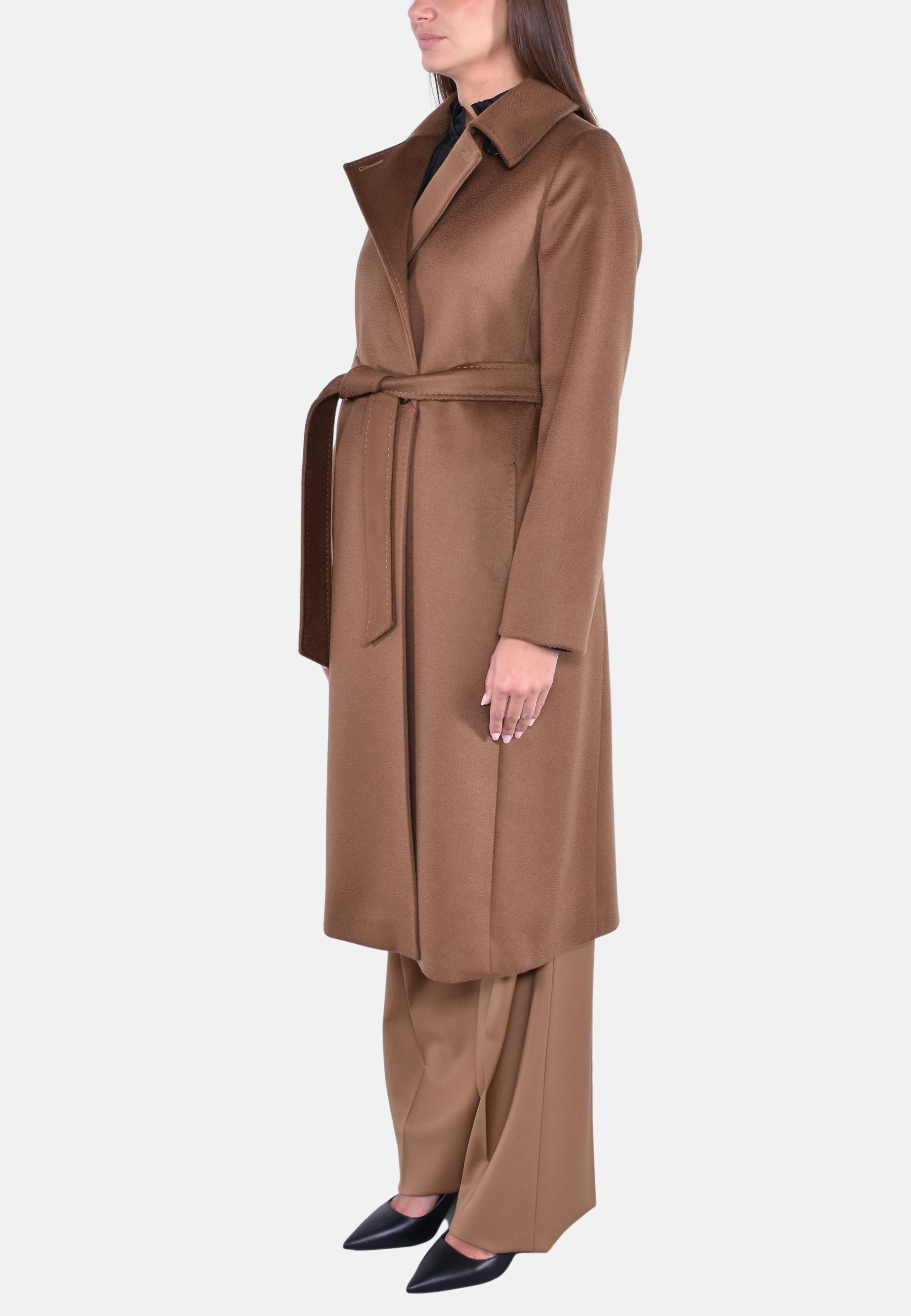 Cappotto doppiopetto lungo d'ispirazione vestaglia realizzato in pregiato drap di pura lana con maniche lunghe, tasche sui fianchi e bottoni nascosti con cintura abbinata in vita. Il design è caratterizzato da colletto a punta doppio uso da portare aperto con rever o chiuso con bottone. Foderato.