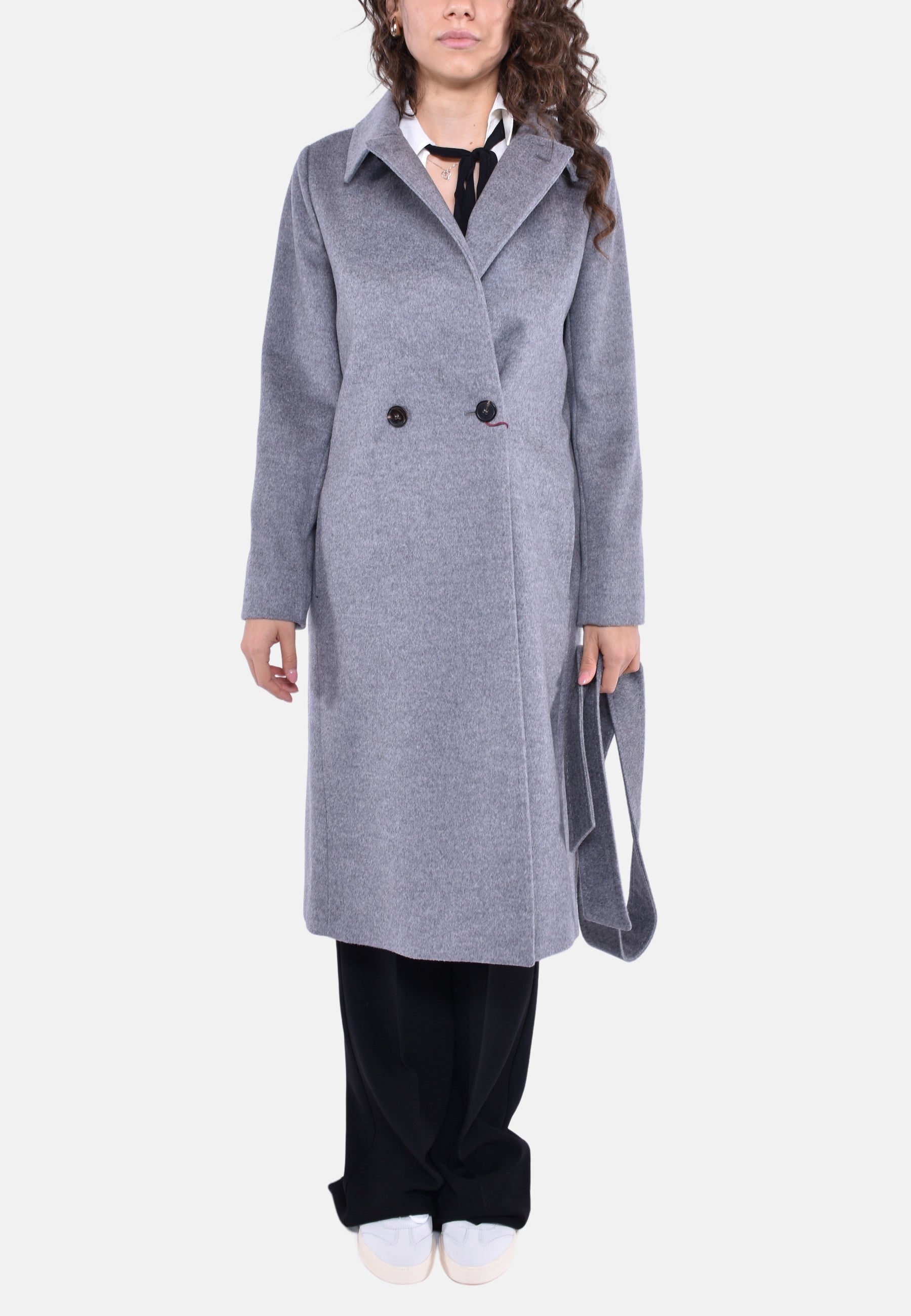Cappotto doppiopetto lungo d'ispirazione vestaglia realizzato in pregiato drap di pura lana con maniche lunghe, tasche sui fianchi e bottoni nascosti con cintura abbinata in vita. Il design è caratterizzato da colletto a punta doppio uso da portare aperto con rever o chiuso con bottone. Foderato.