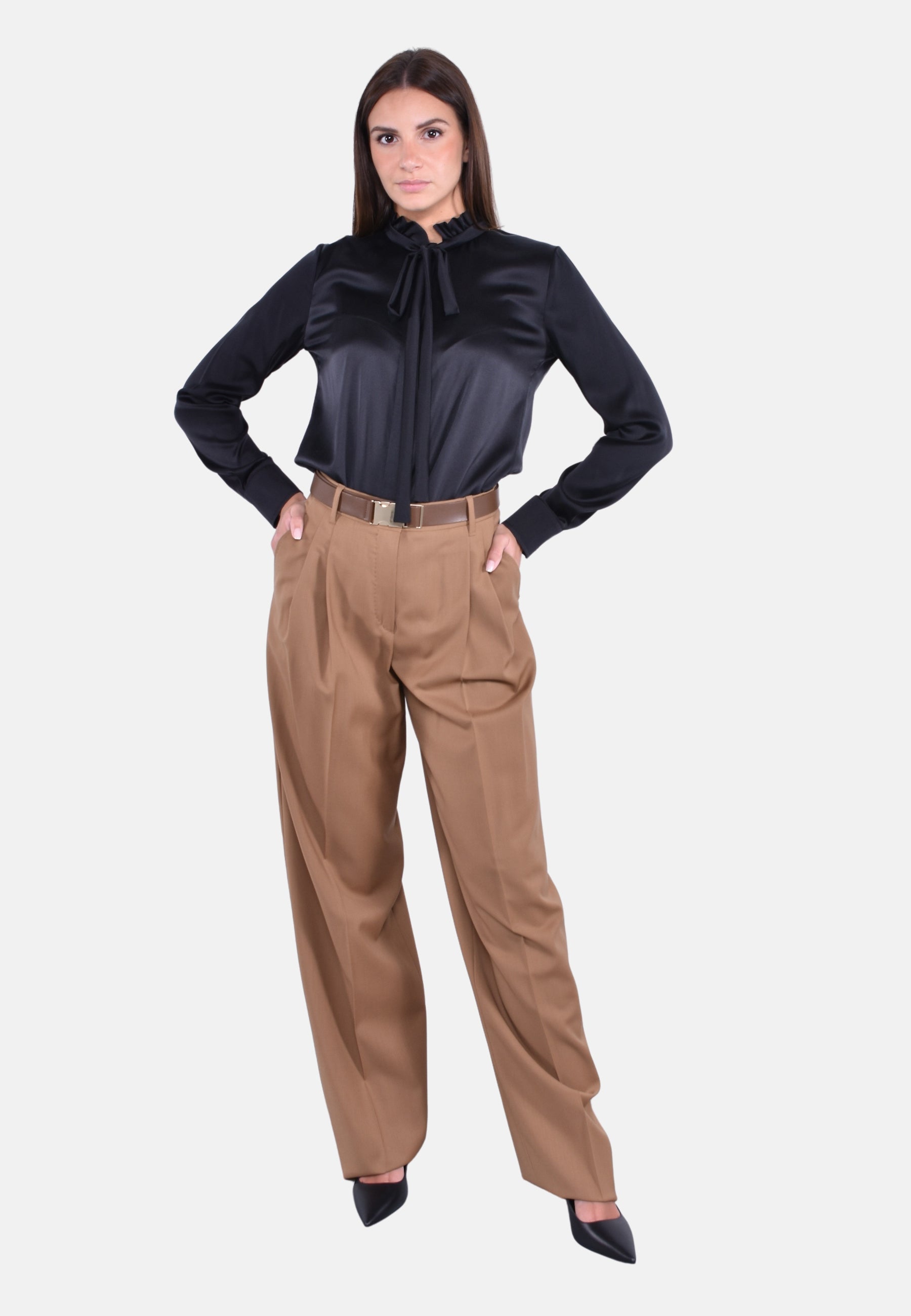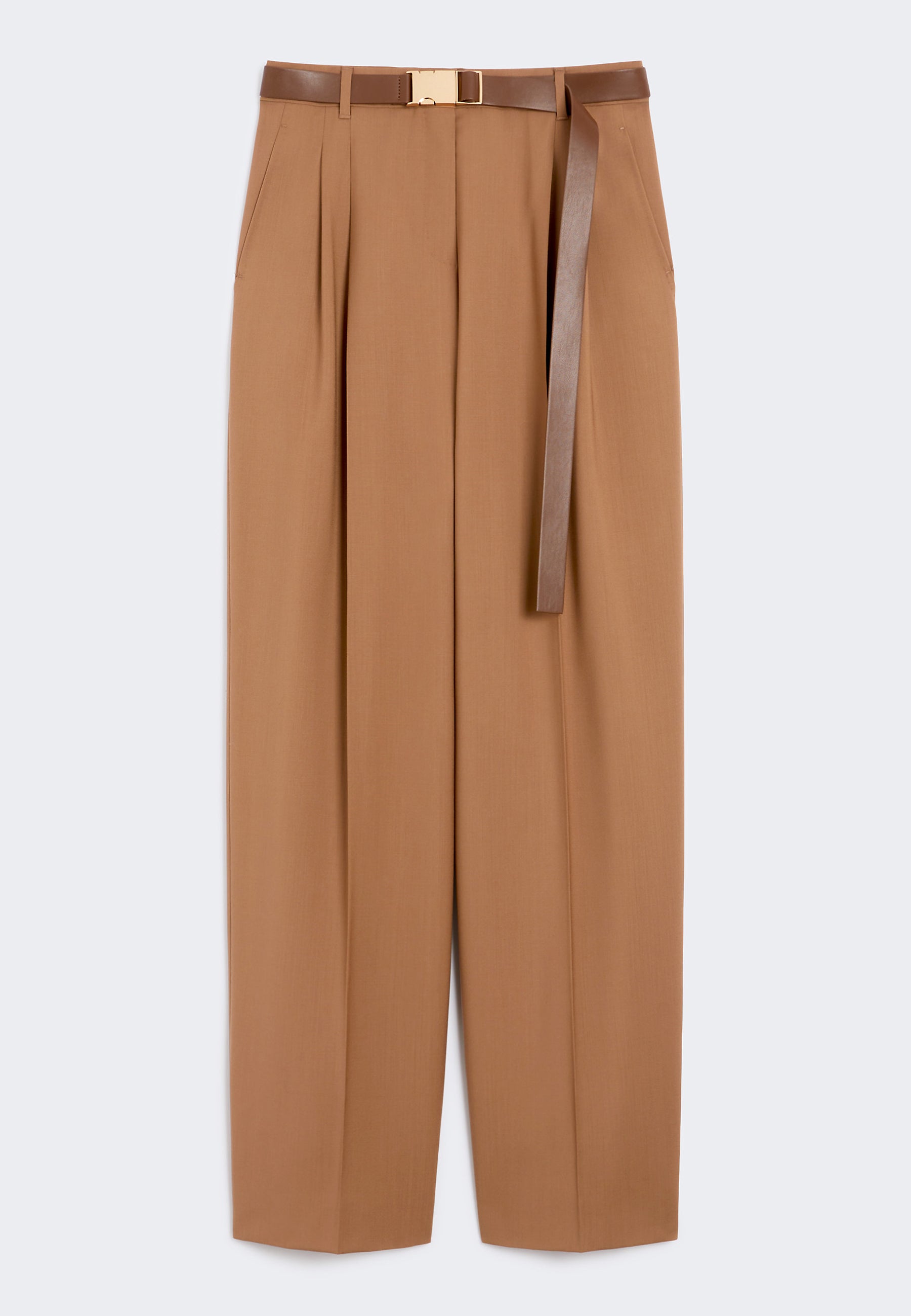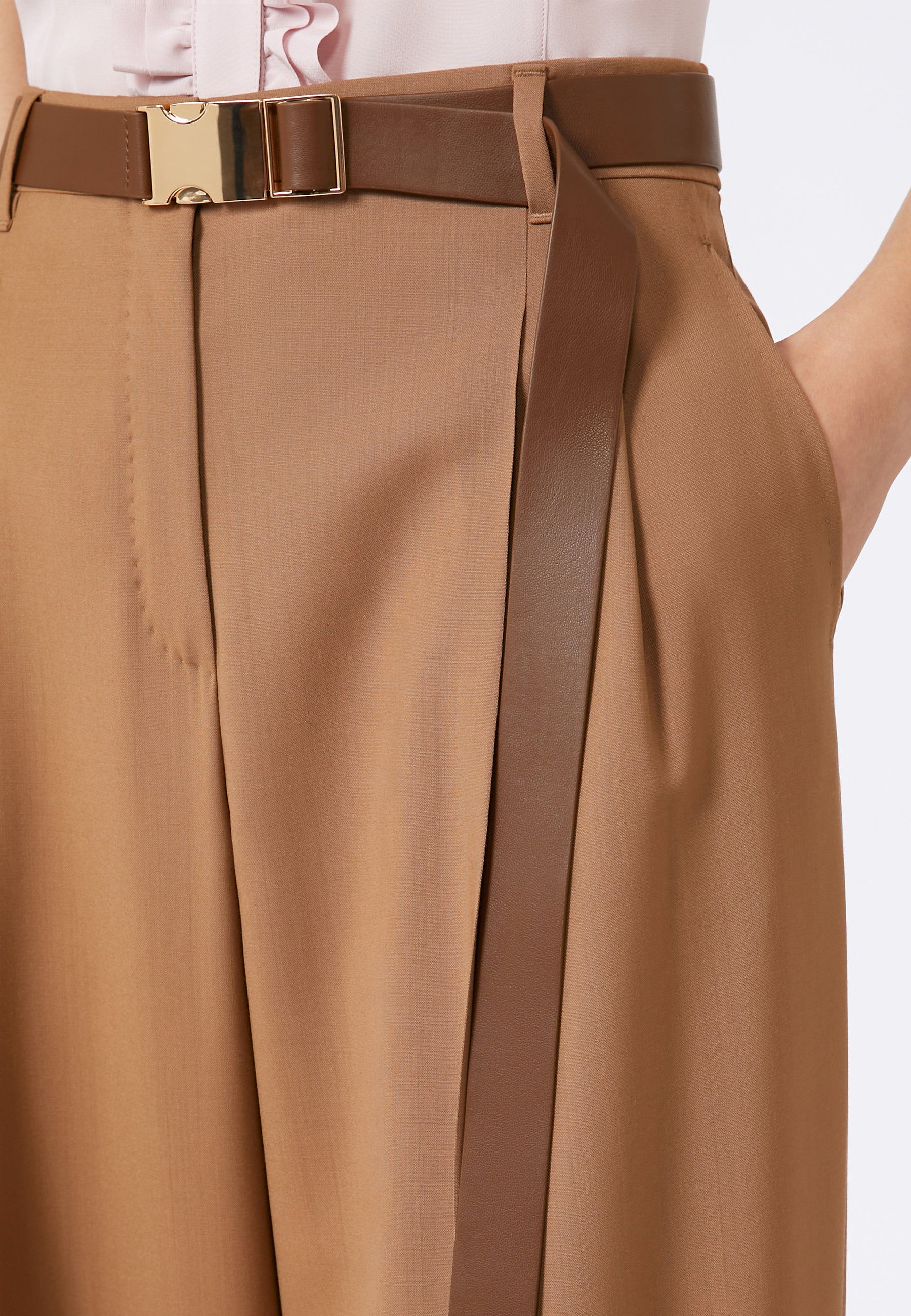 Pantalone con cintura lunga in tessuto spalmato e fibbia in metallo.