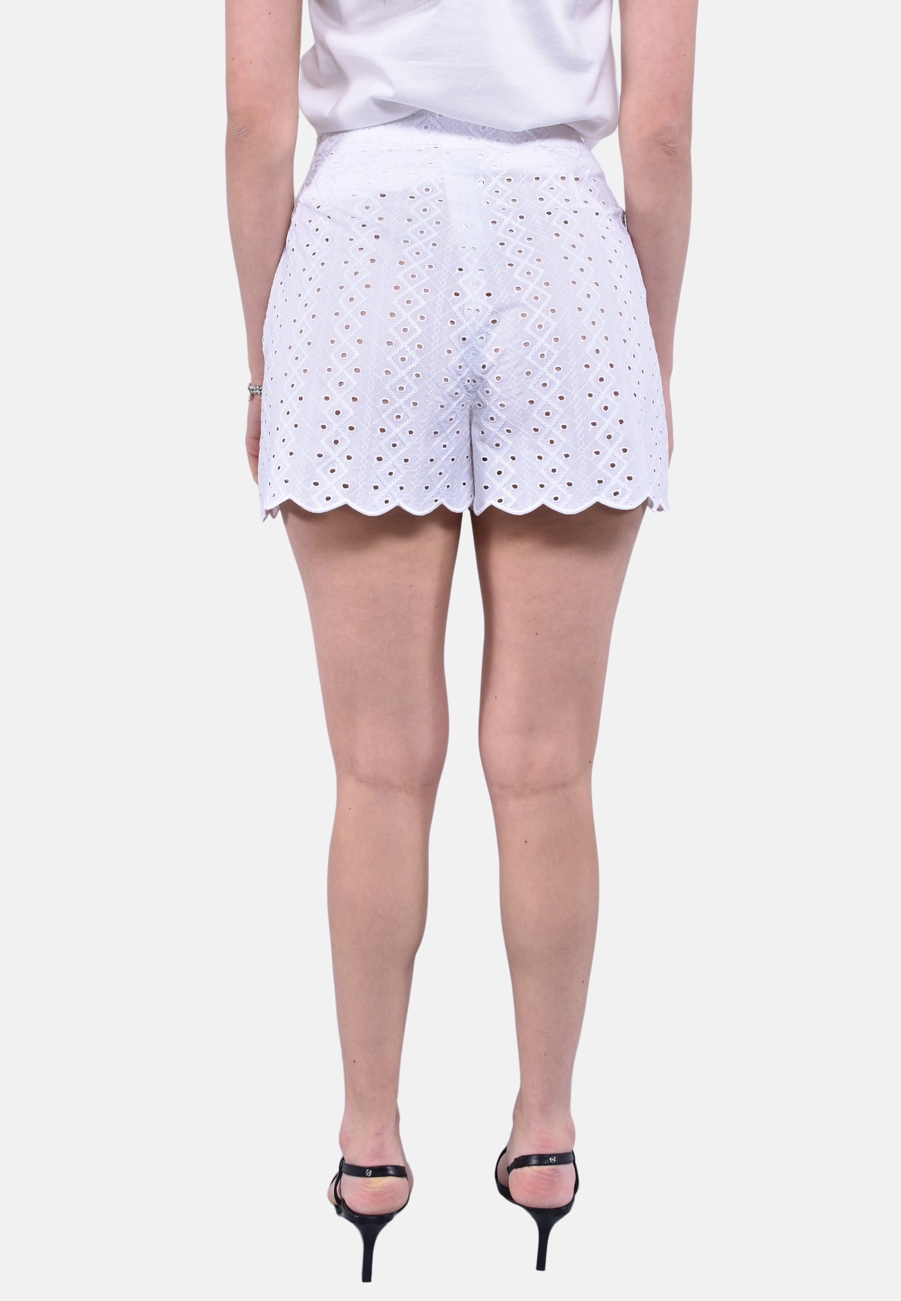 Bermuda in pizzo a vita alta con tasche a filetto laterale e chiusura con zip e bottone rivestito sul centro davanti.