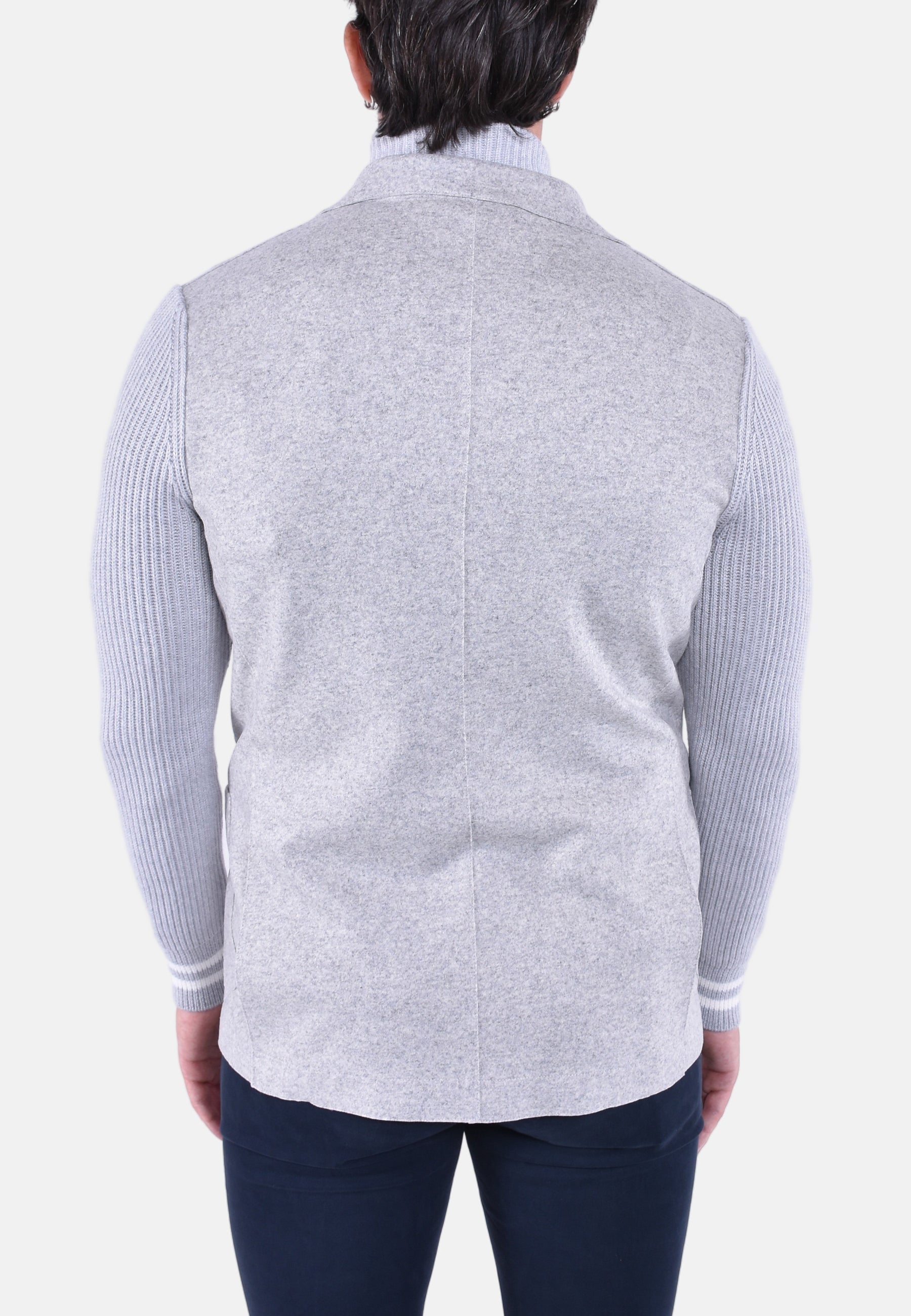 La giacca bi-materica monopetto tre bottoni con tasche a toppa è realizzata in flanella lana e poliestere natural stretch. Il tessuto in jersey, abbinato alla pettorina collo in piedi ed alle maniche in maglia cashwool 100% lana fin. 7, ne esalta il comfort adattandosi a qualsiasi corporatura. Il concetto della giacca con parti in maglia ridisegna il nuovo formale, attribuendo comfort e stile pur mantenendo un aspetto estremamente raffinato e professionale. Il dettaglio degli accessori personalizzati e i bottoni in corno completano il capo, che offre una vestibilità regolare.