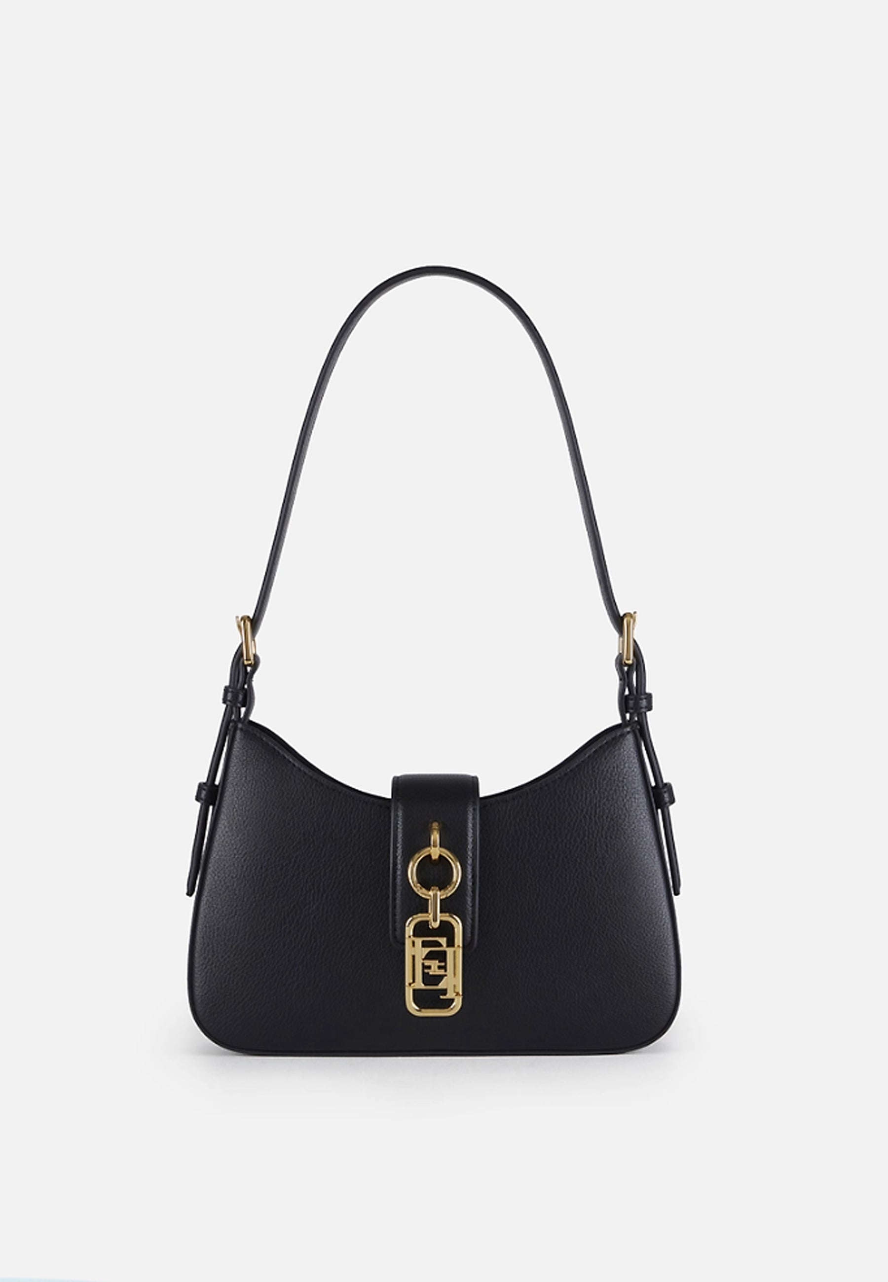 Borsa hobo piccola realizzata in materiale sintetico con texture effetto pelle. L'accessorio ha manico con fibbie e chiusura con linguetta, impreziosita dal dettaglio di charm con logo.