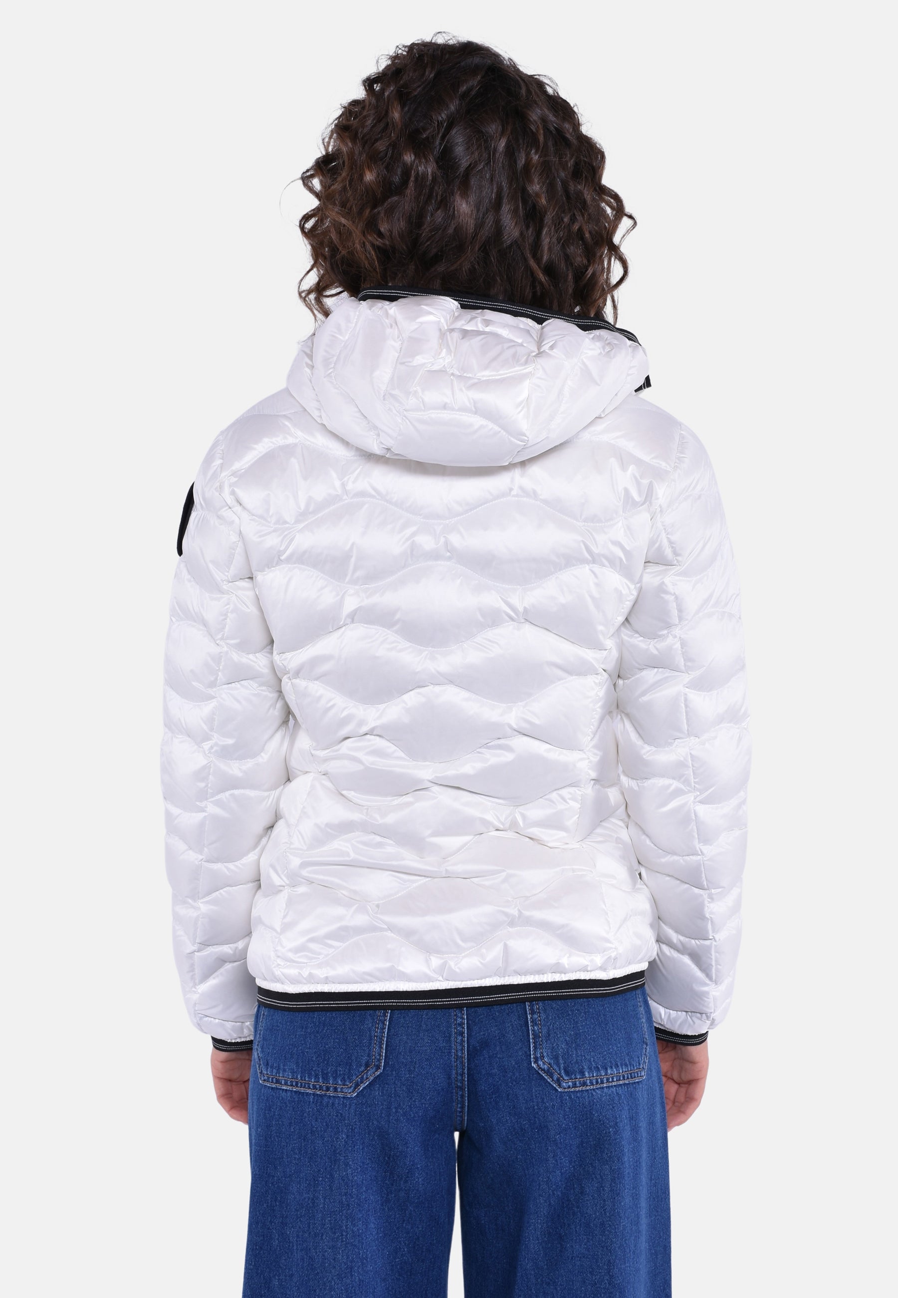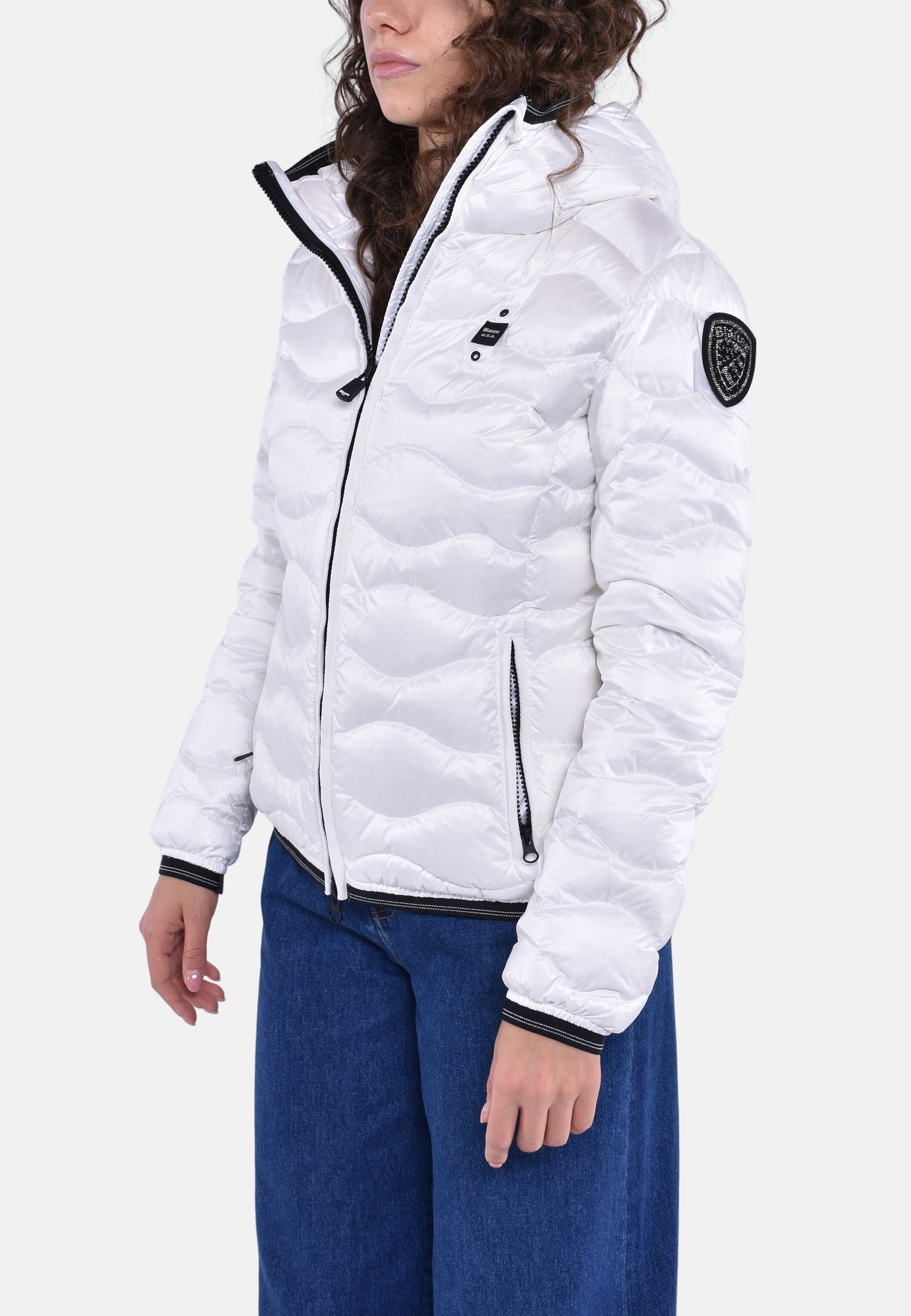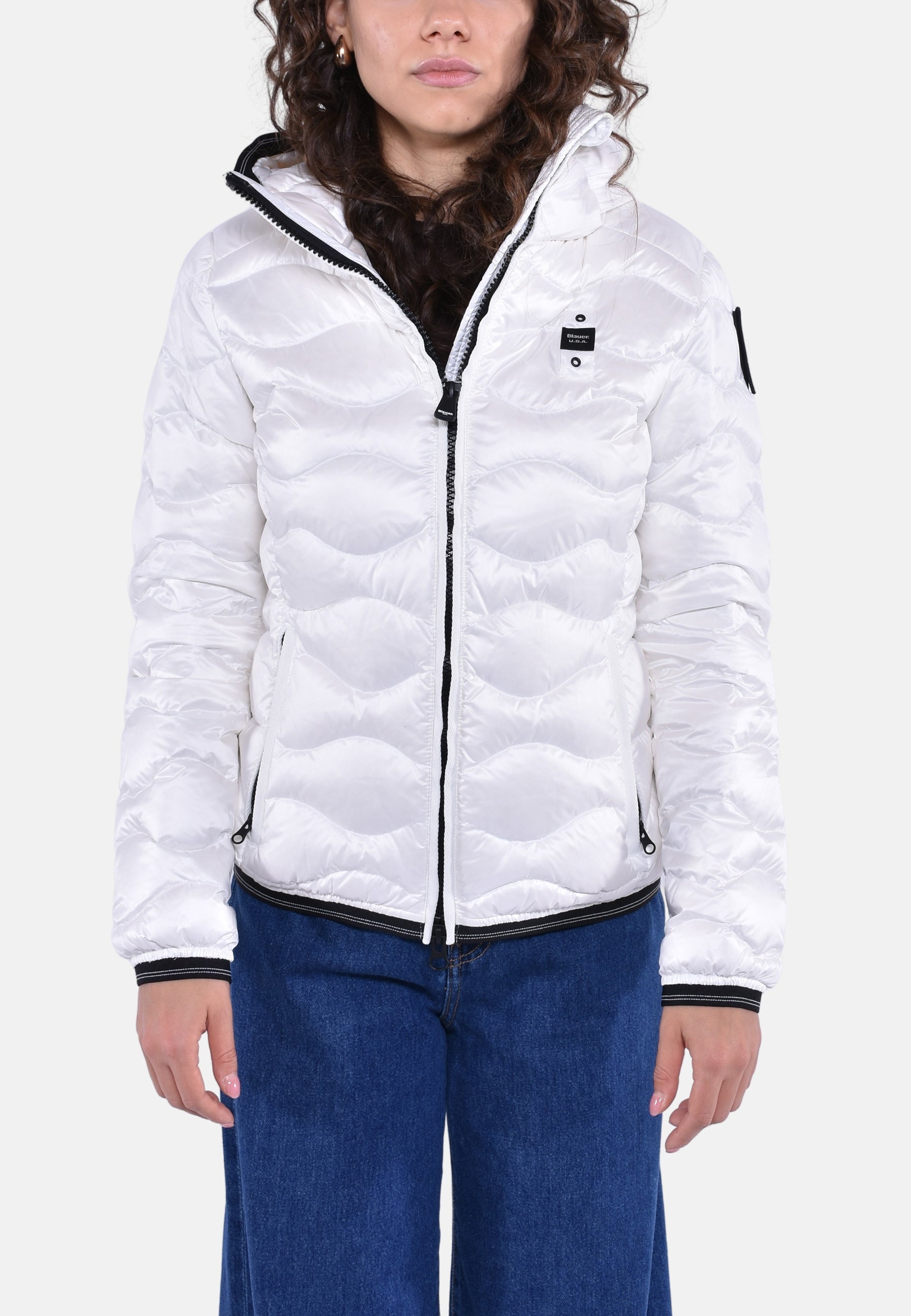 Piumino idrorepellente trapuntato ad onde orizzontali dal taglio svasato. Capo iconico Blauer con imbottitura naturale, calda e non ingombrante.