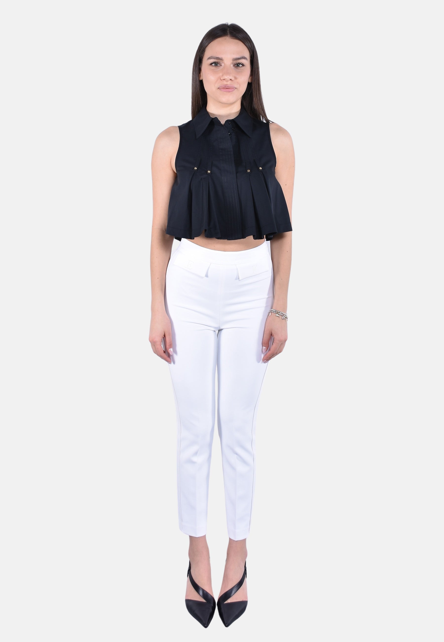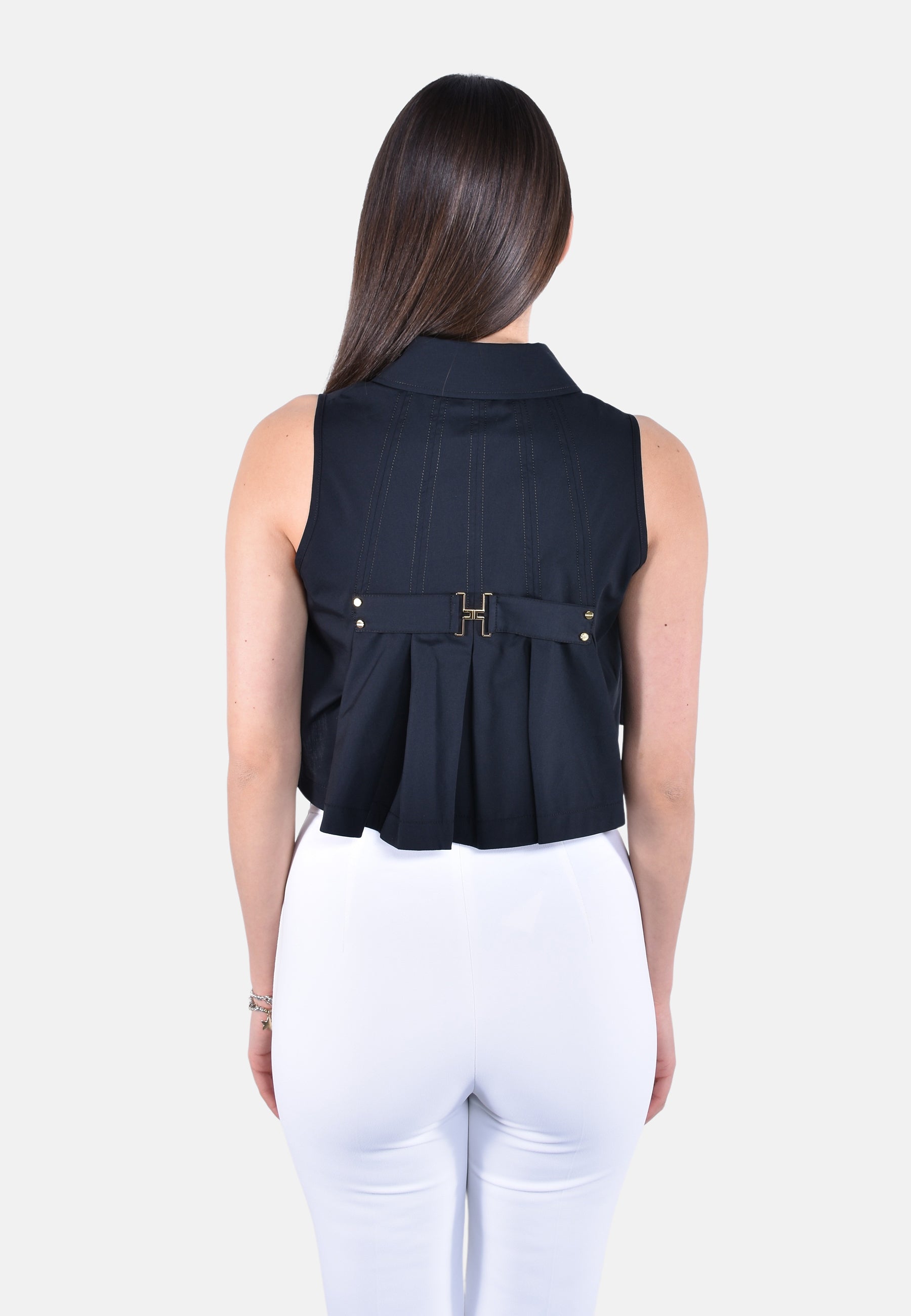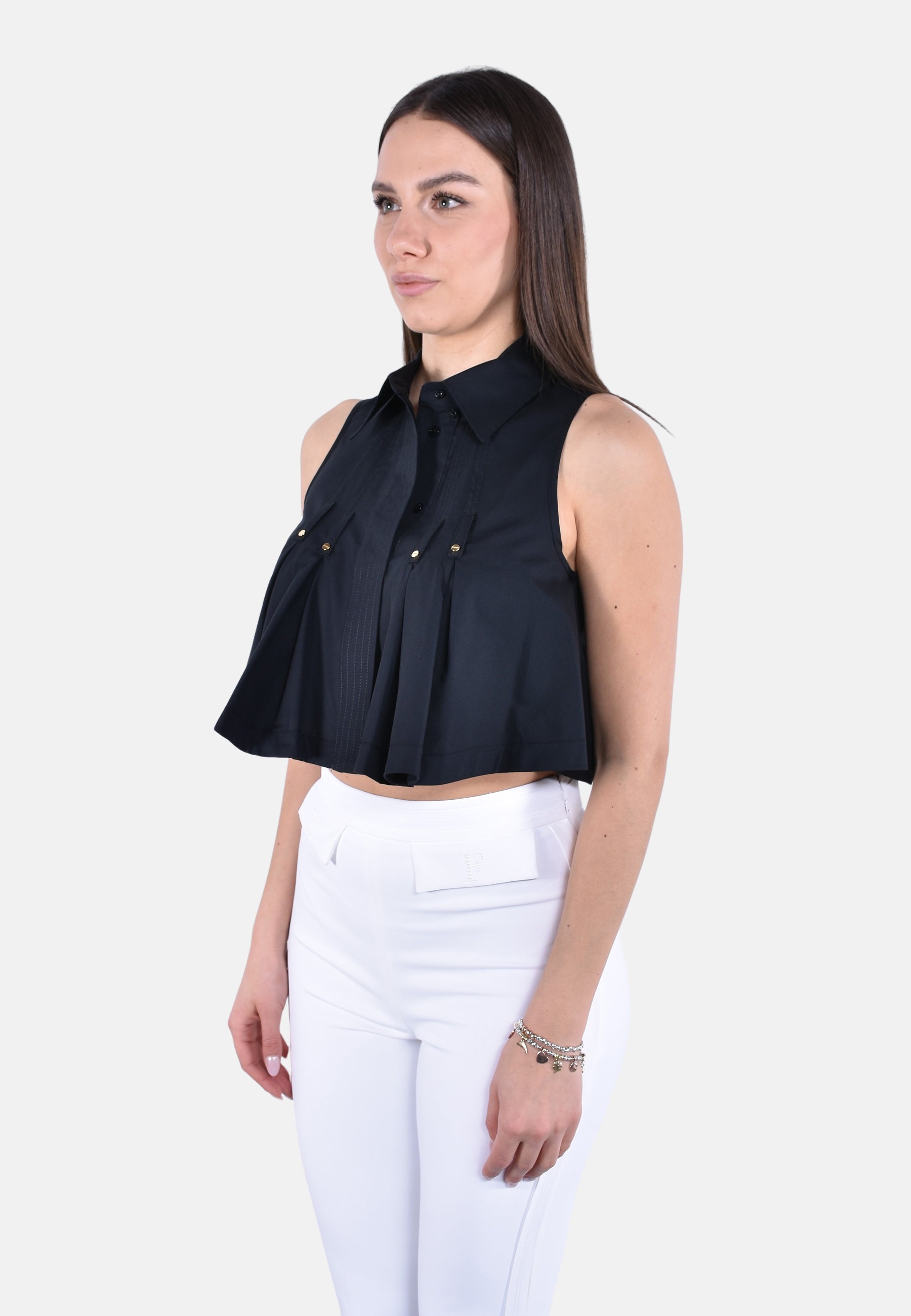 Camicia smanicata in popeline di cotone con colletto alto. Si distingue per i motivi di pieghe sul davanti, impreziosite da rivetti in metallo dorato. Il retro è arricchito dalla martingala con dettaglio logo. Vestibilità regular.
