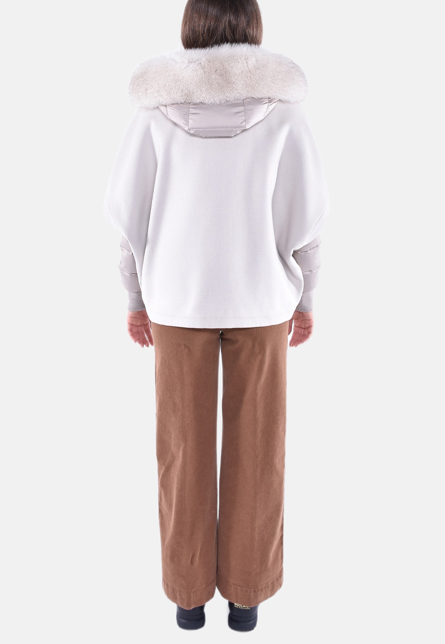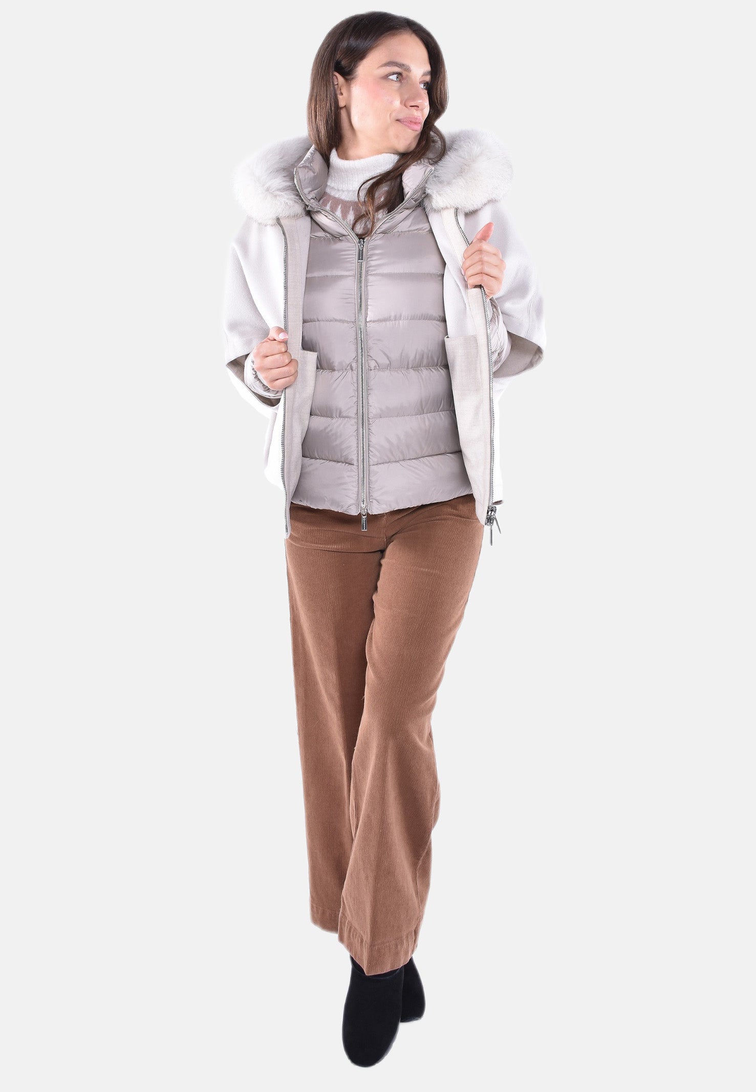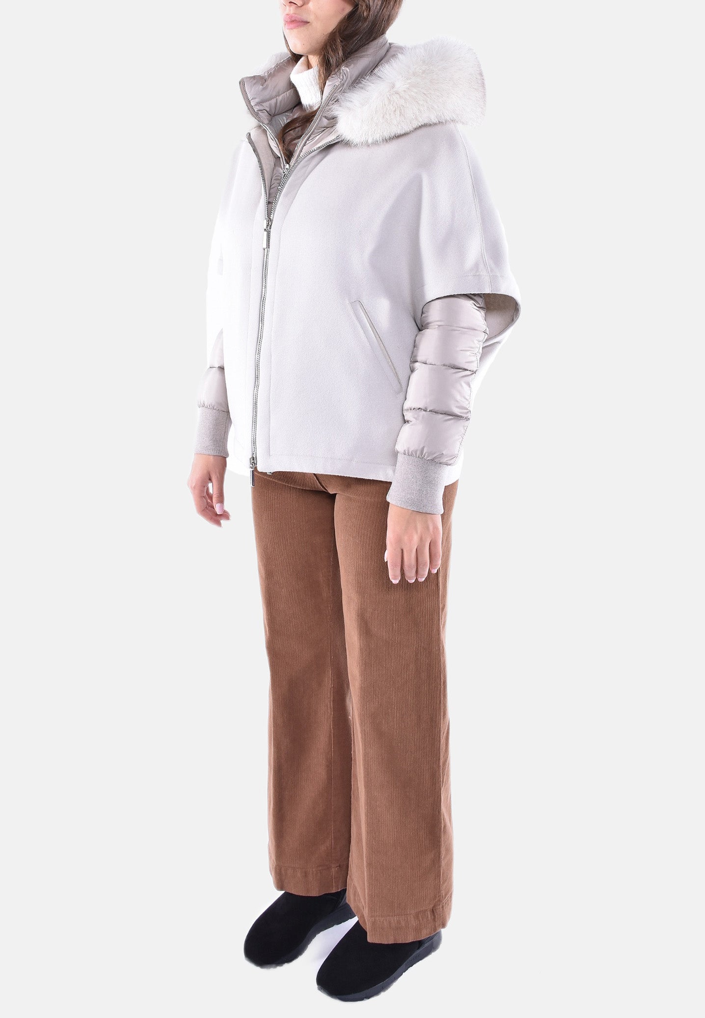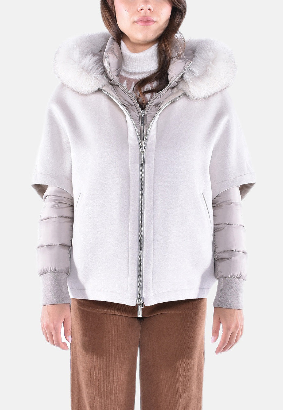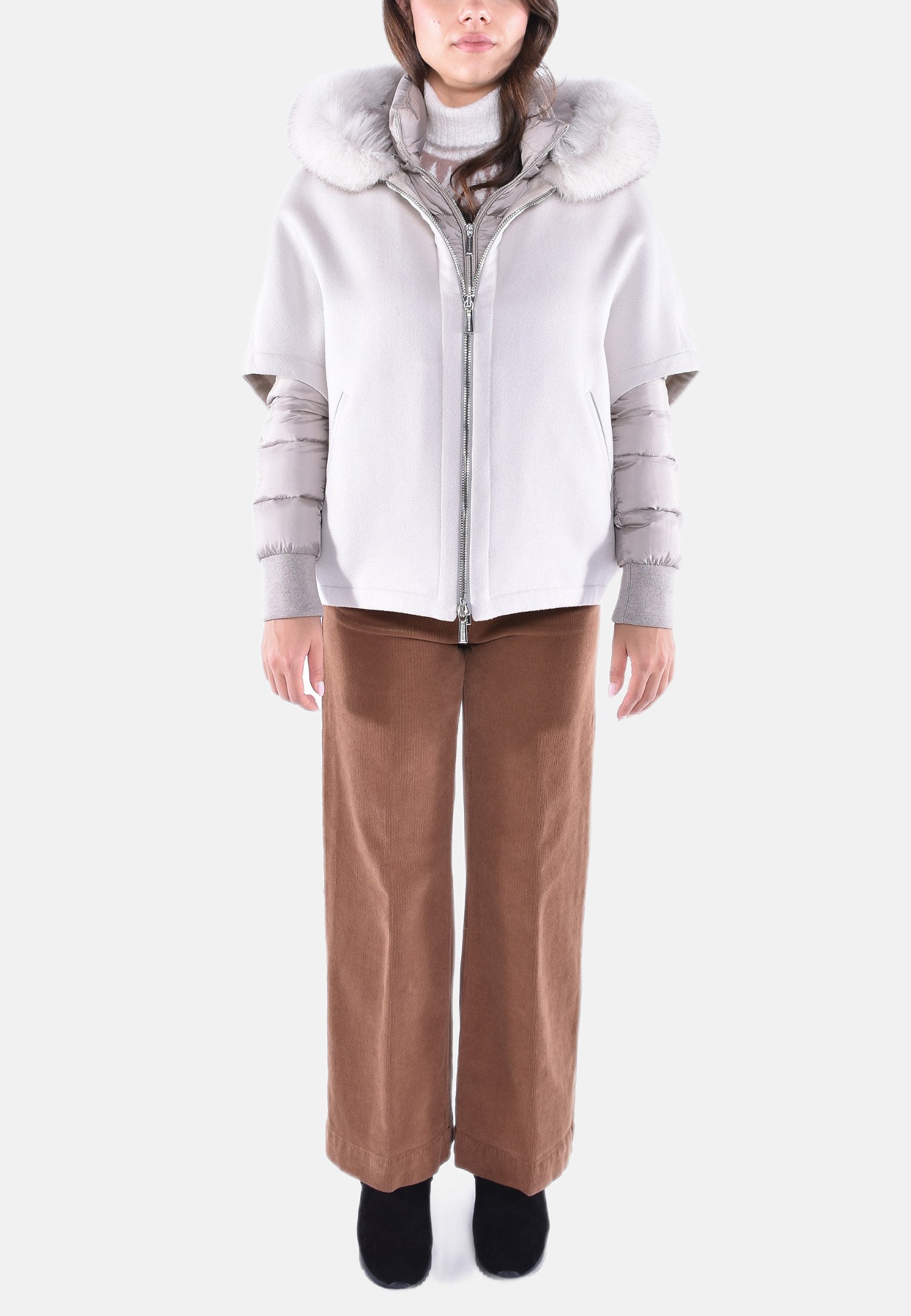 Cappa corta in calda lana double misto cachemire con collo in maglia abbinata a giacca interna staccabile trapuntata in finissima piuma d’oca con maglia tubolare per polsi e elegante cappuccio rifinito con bordo in vera volpe, realizzata in finissimo nylon 20 denari con delicate sfumature cangianti.