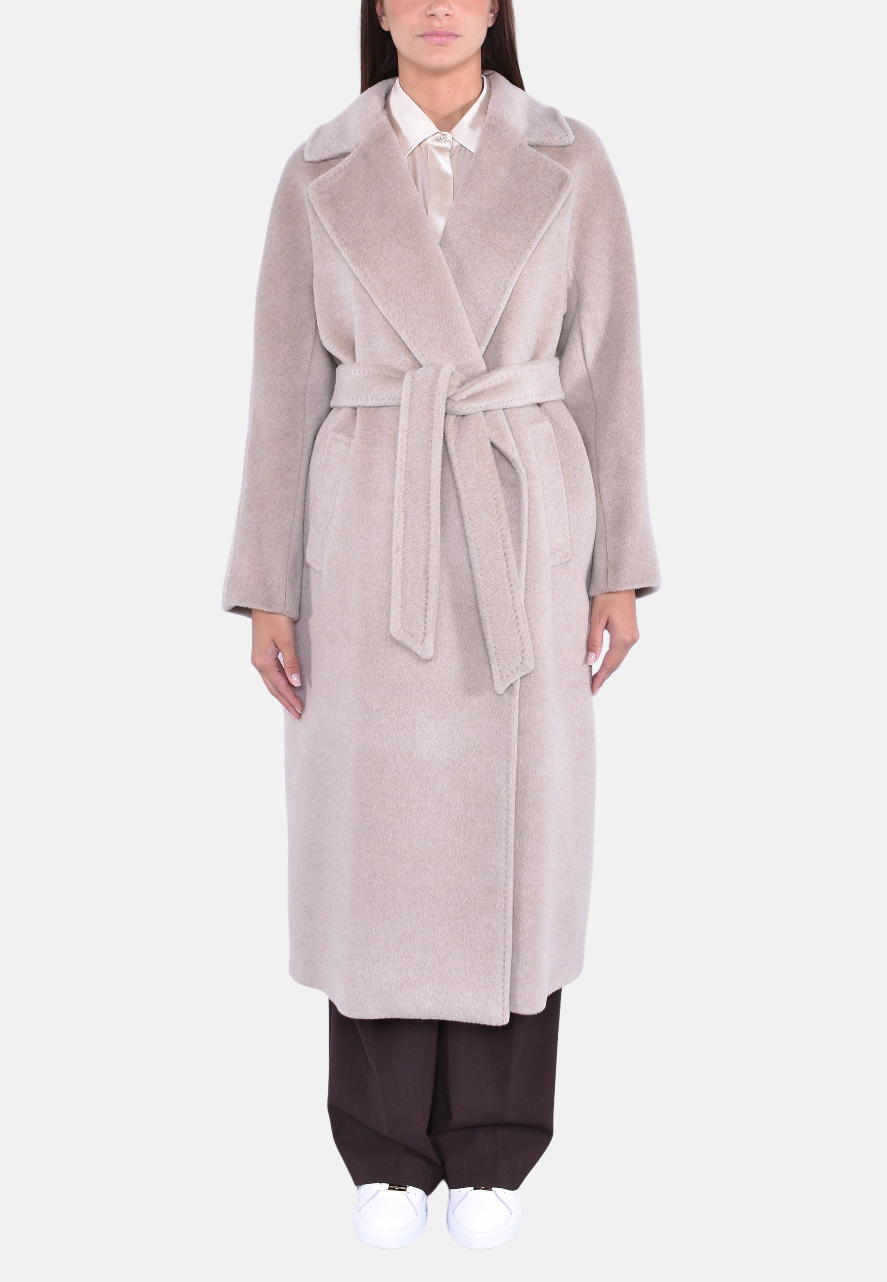 Cappotto lungo dalla silhouette a vestaglia con cintura abbinata in vita.