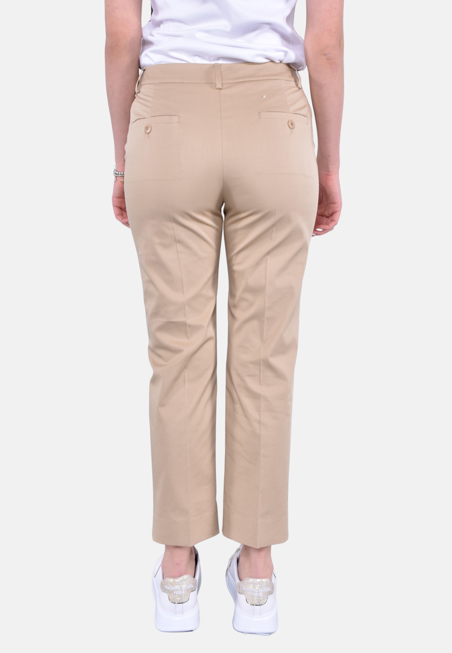 Pantalone a sigaretta in gabardina di cotone stretch, caratterizzato da una silhouette slim fit con taglio cropped alla caviglia. Il modello presenta piega stirata, passanti per cintura, tasche alla francese sui fianchi e tasche a filetto sul retro. Chiusura con listino alto in vita, zip con patta e gancetto.