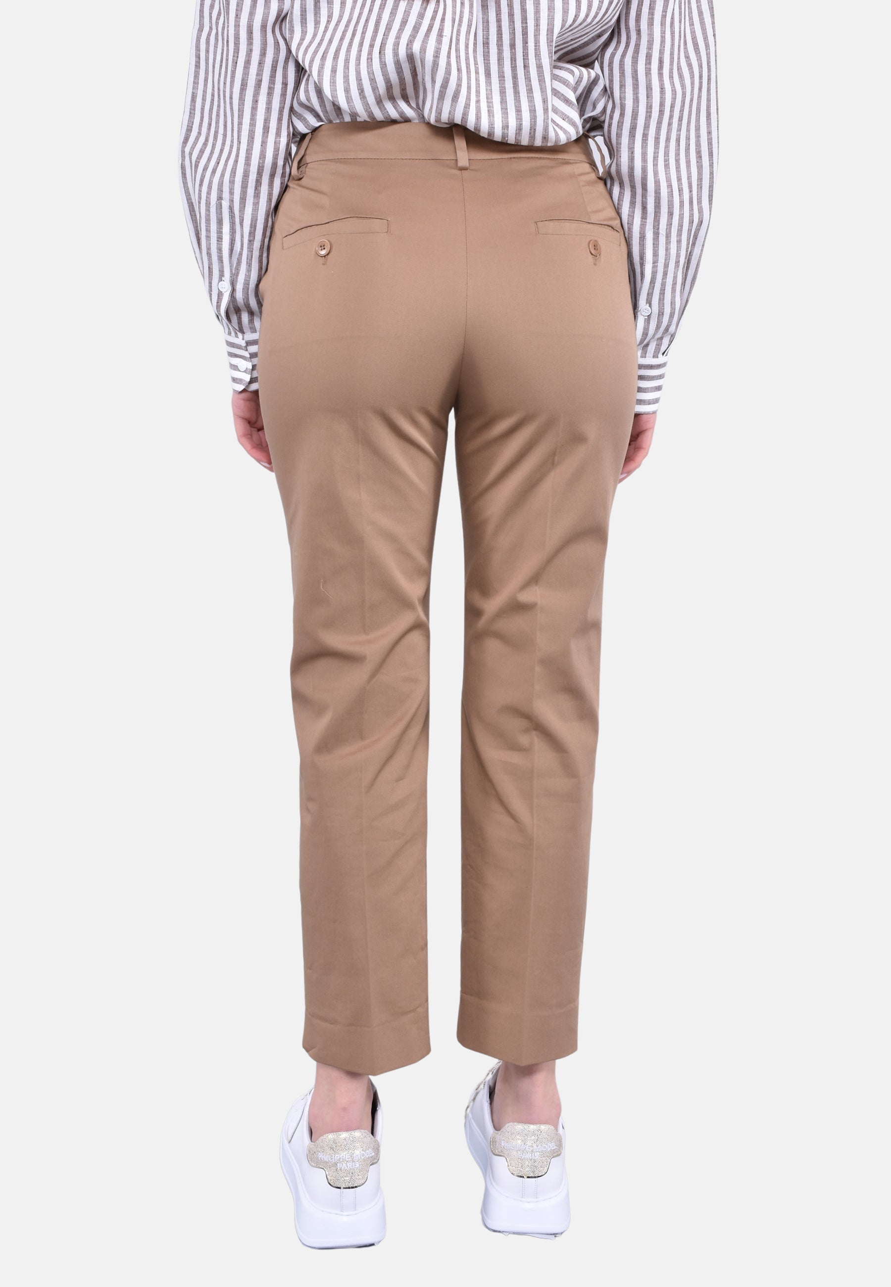 Pantalone a sigaretta in gabardina di cotone stretch, caratterizzato da una silhouette slim fit con taglio cropped alla caviglia. Il modello presenta piega stirata, passanti per cintura, tasche alla francese sui fianchi e tasche a filetto sul retro. Chiusura con listino alto in vita, zip con patta e gancetto.