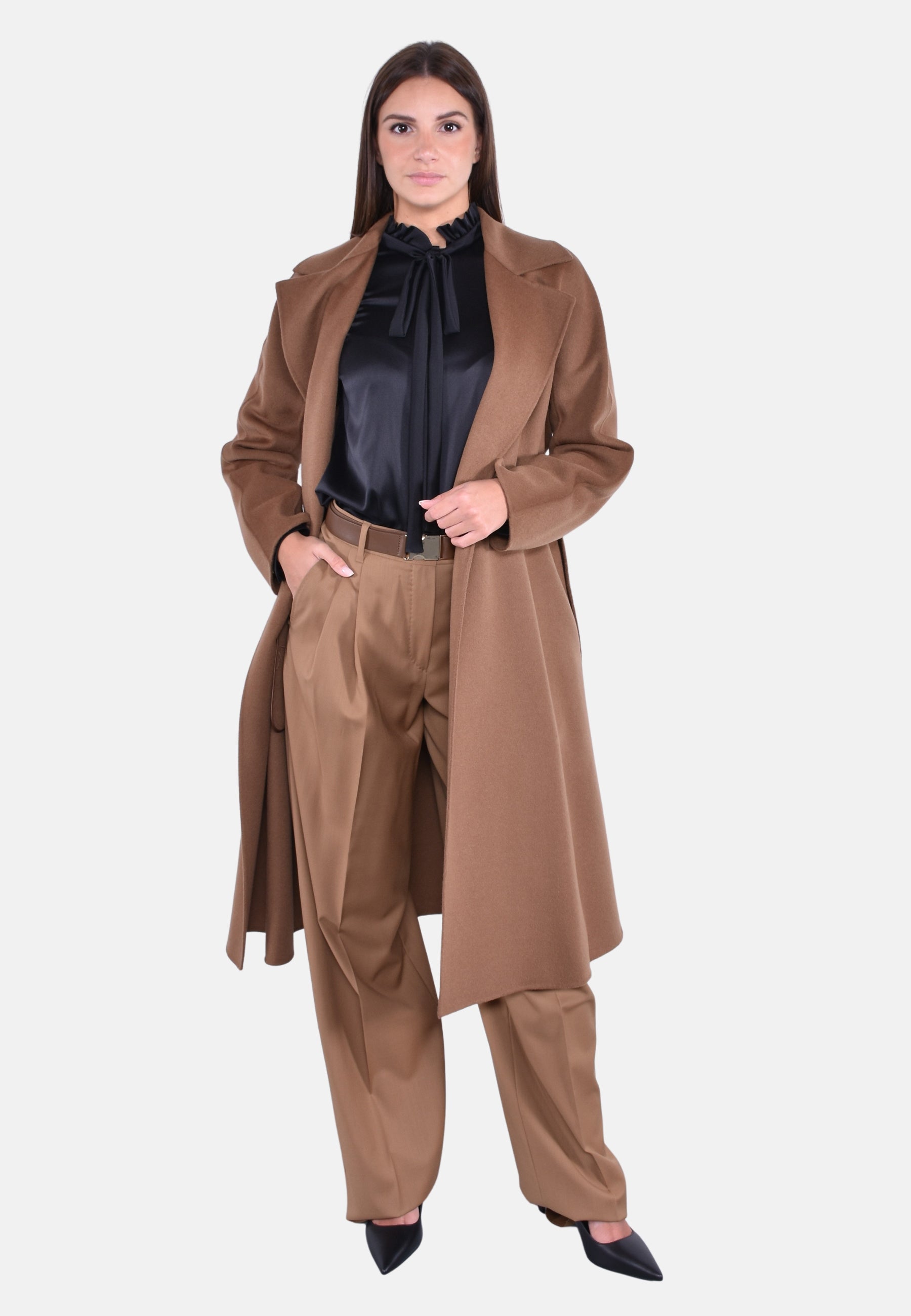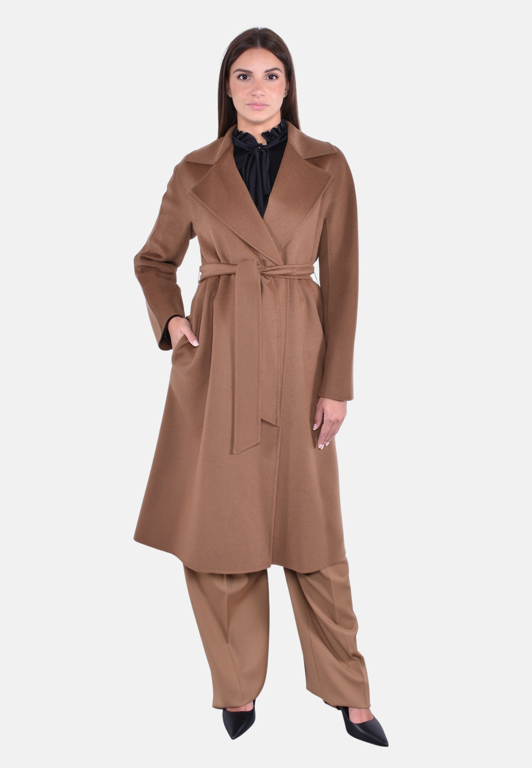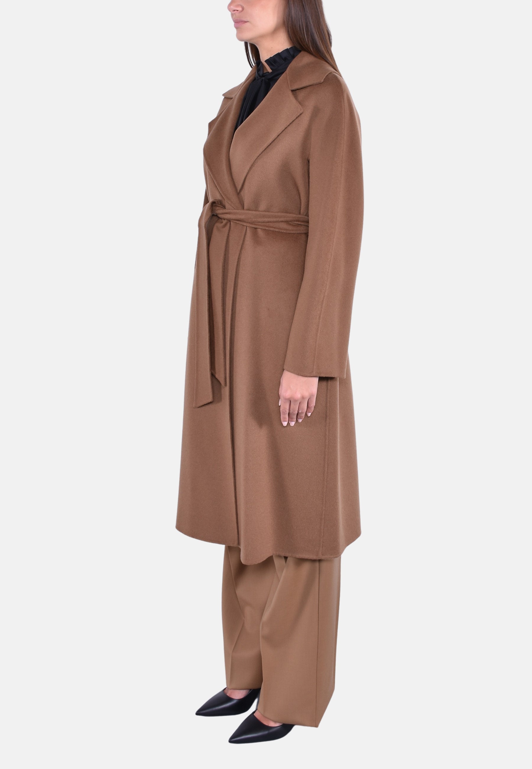 Cappotto midi a vestaglia con cintura abbinata per evidenziare la silhouette.
