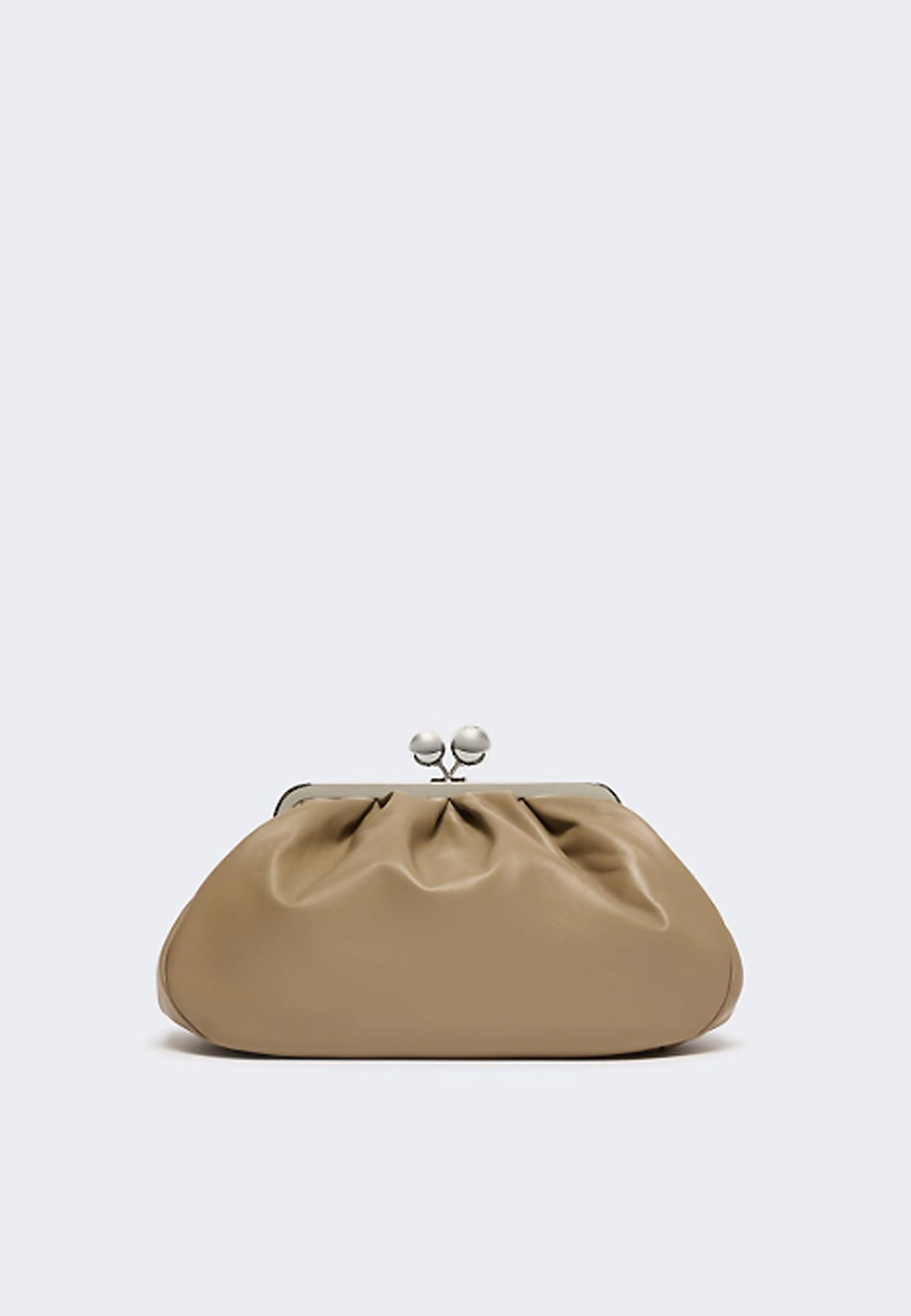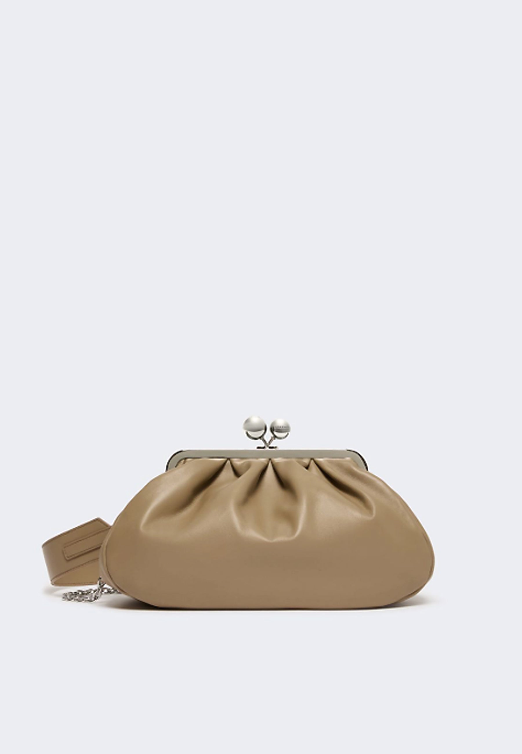 Pasticcino Bag Medium dalla forma destrutturata. Tracolla lunga a catena con spallaccio in pelle e tracolla corta in pelle, entrambe rimovibili con ganci a scomparsa, da portare a mano o crossbody.