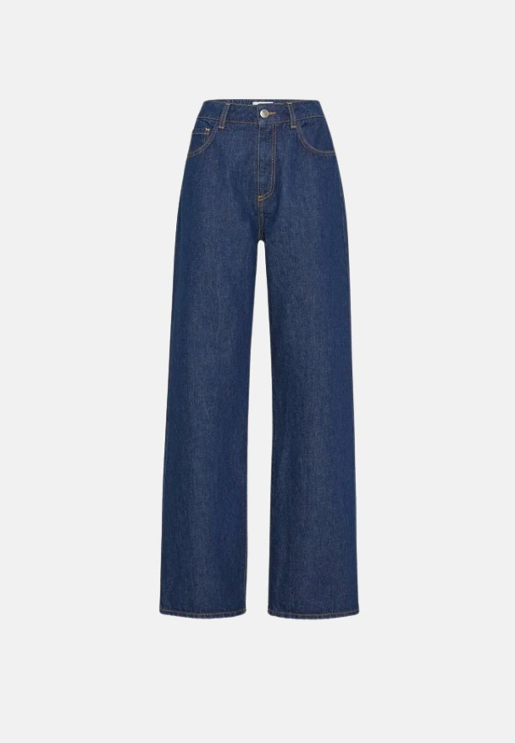 Pantalone modello palazzo a vita alta, cinque tasche, lavaggio denim scuro con impunture color tabacco scuro.