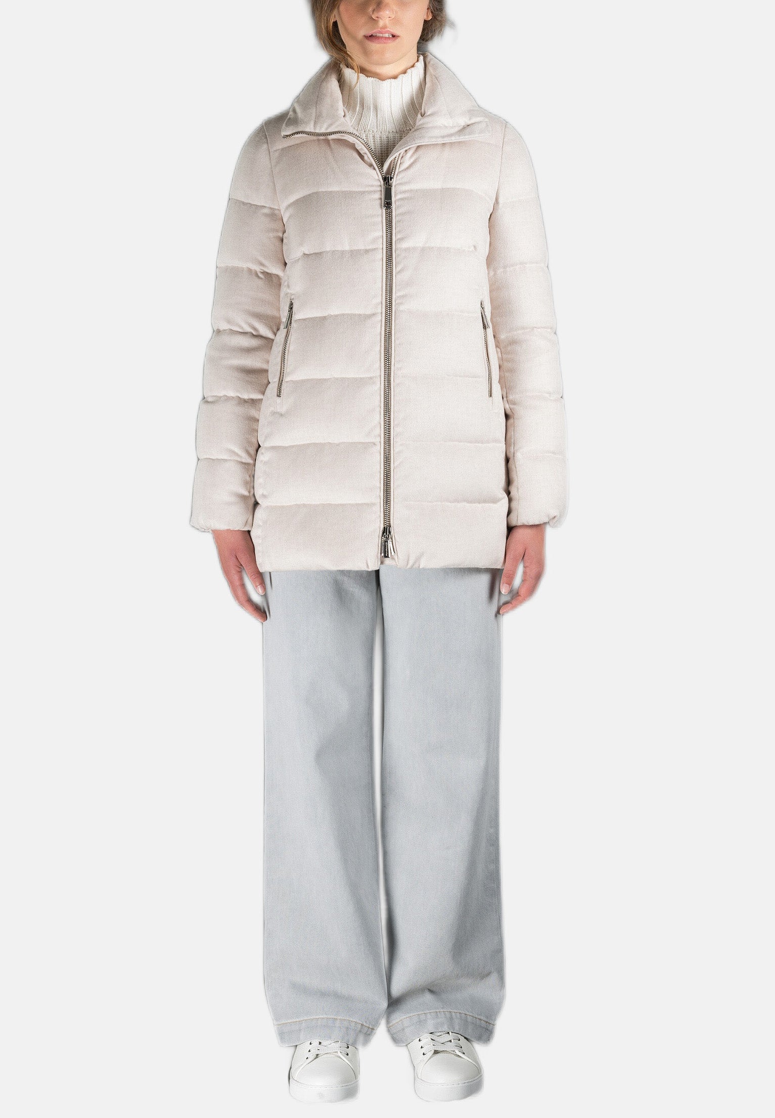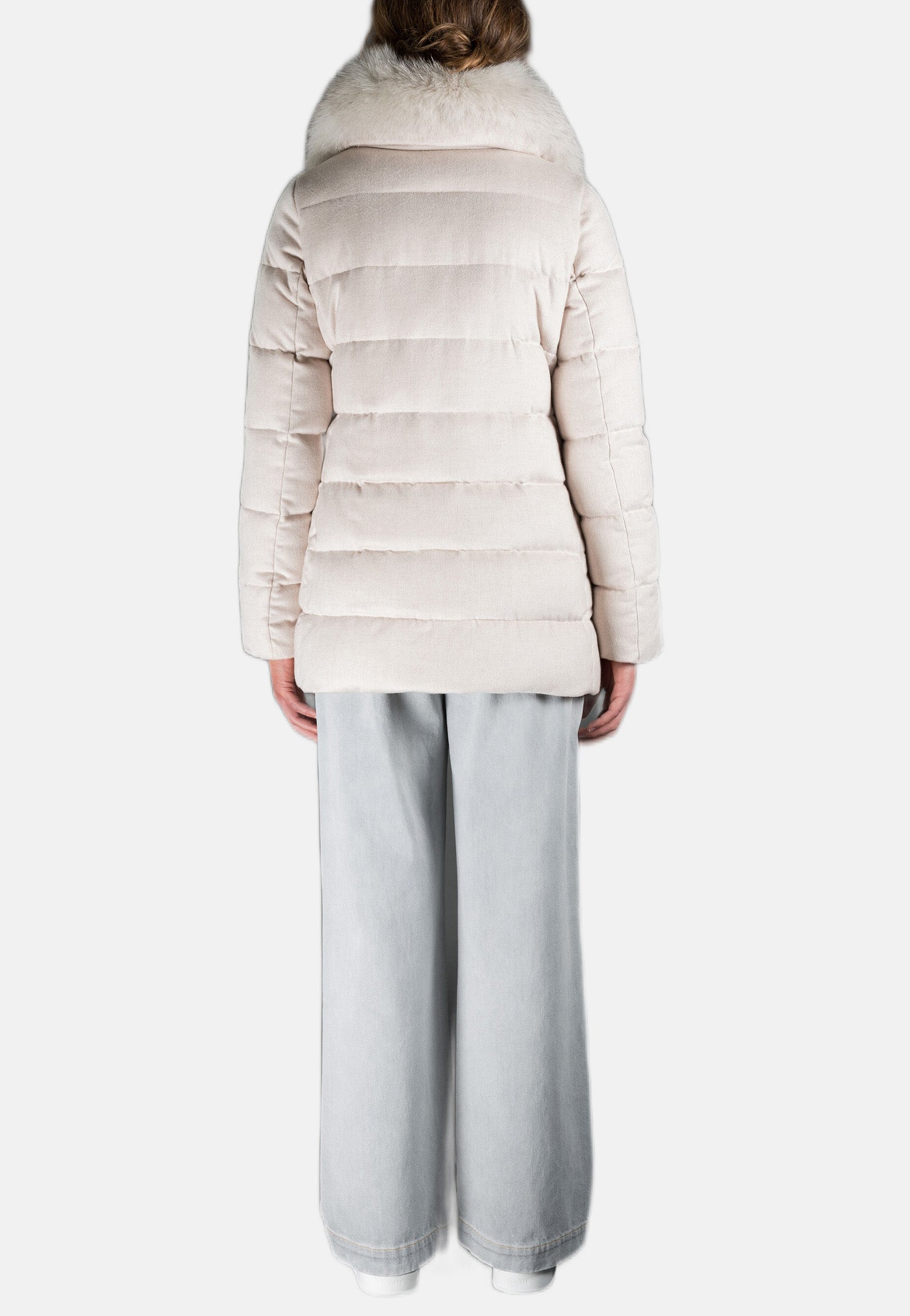 Cappottino dalla raffinata linea a trapezio realizzato in pregiata flanella australiana extrafine mista a cashmere, imbottito in finissima piuma d’oca e trapuntato a boudin.