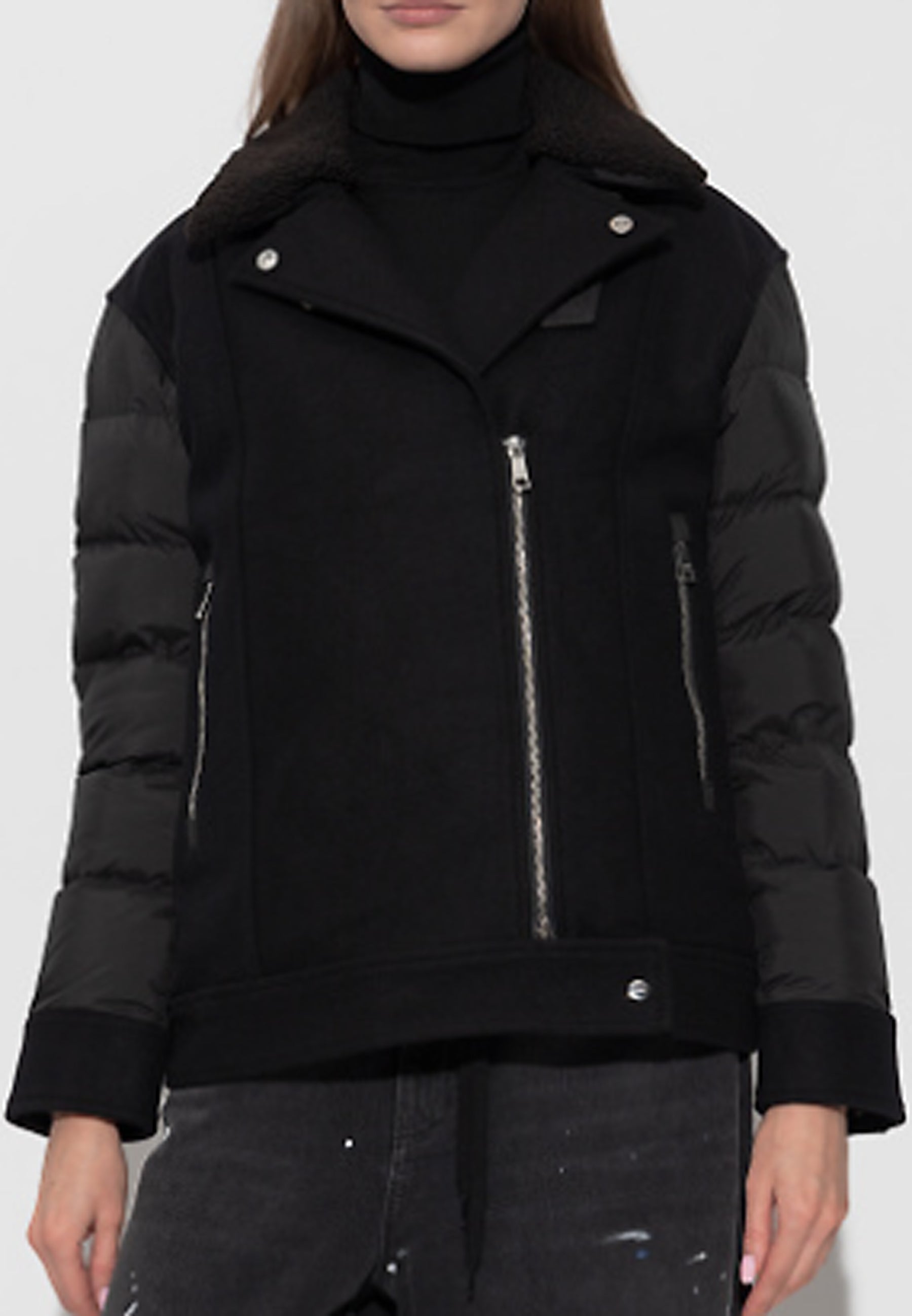 La parte anteriore della giacca presenta una superficie liscia con cuciture che ne modellano delicatamente la silhouette. Le maniche e la schiena sono realizzate in materiale trapuntato lucido, mentre la parte anteriore è impreziosita da una cerniera diagonale in metallo e due tasche verticali con cerniera. Il classico motivo da giacca biker è completato da un colletto oversize in pelliccia sintetica e da eleganti bottoni a pressione.
