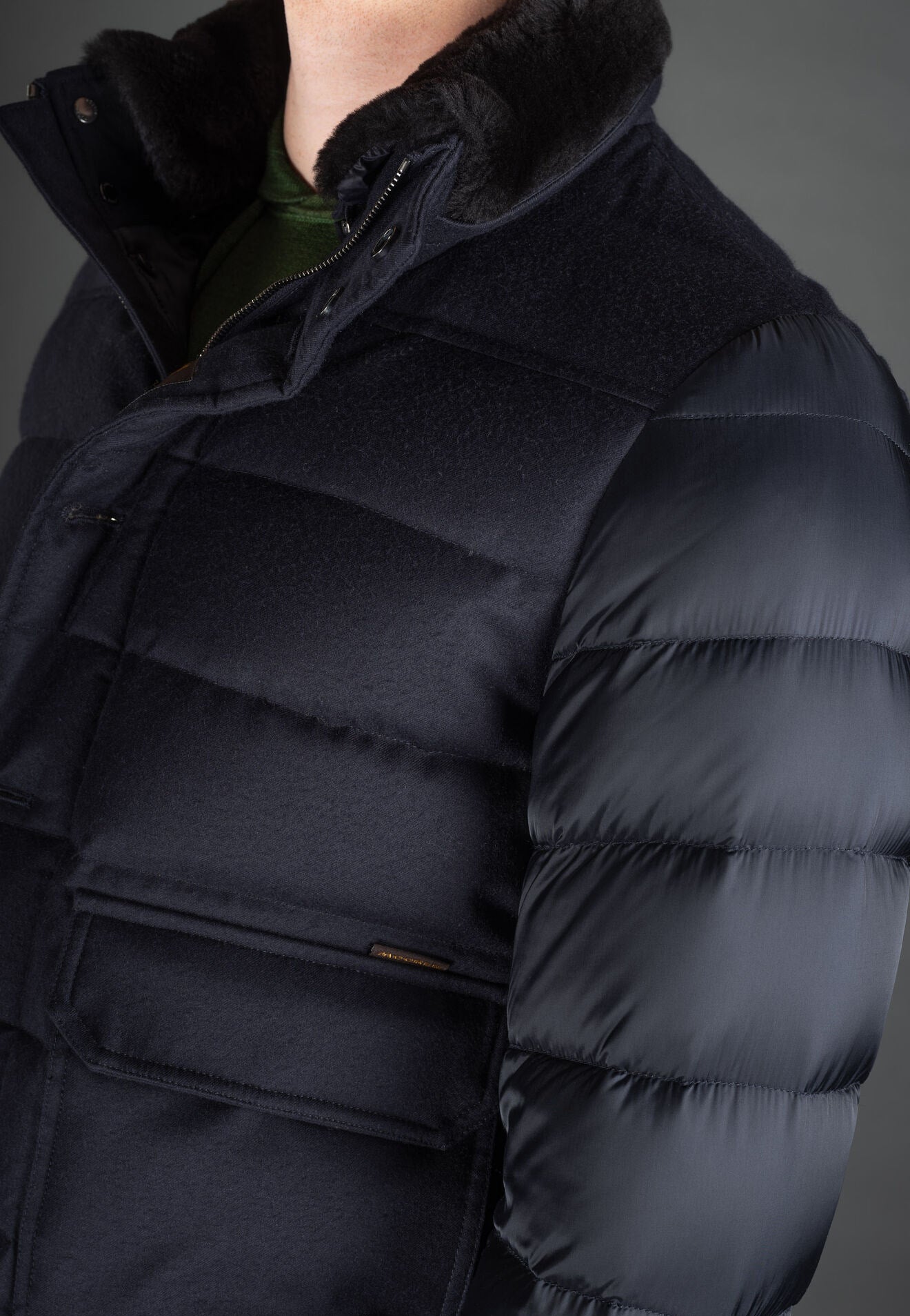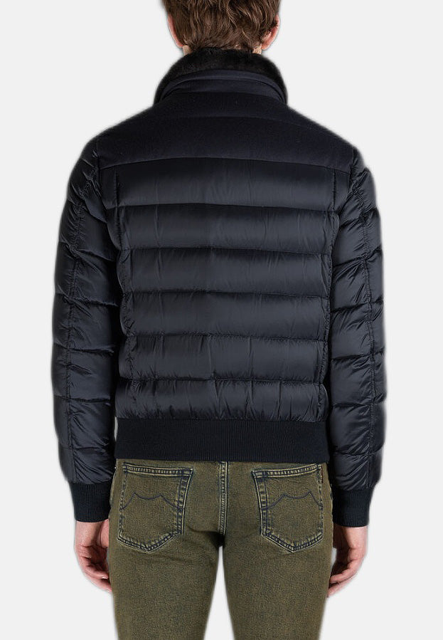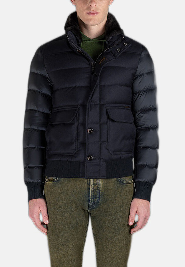 Bomber imbottito in piuma d’oca e trapuntato a boudin. Chiusura frontale con zip in metallo spazzolata e abbottonatura ad asola con bottoni in corno. Il collo è impreziosito da pelliccia removibile. Polsi e fondo sono realizzati in morbida maglia. Tasche a toppa chiuse da pattina con entrata laterale sui fianchi. Interno foderato e trapuntato sul lato schiena, con comode tasche porta valori.