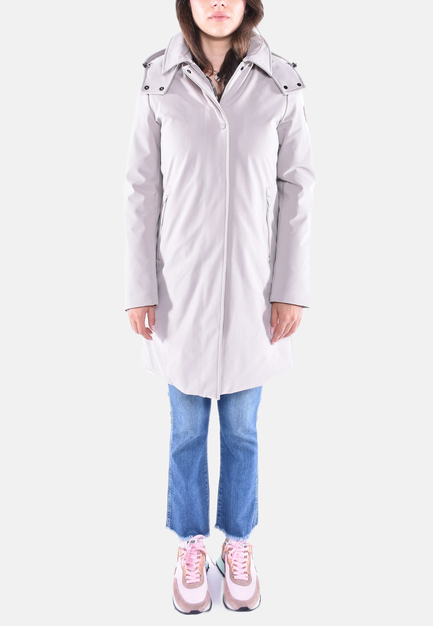 Giubbino in tessuto impermeabile e antivento. Imbottito in piuma d'anatra e con trapuntatura Chevron all'interno, ha un cappuccio staccabile con due bottoni a pressione e il colletto a punta. La chiusura con zip bidirezionale e bottoni a pressione è nascosta da una patta con due bottoni visibili per mantenere una linea minimal.