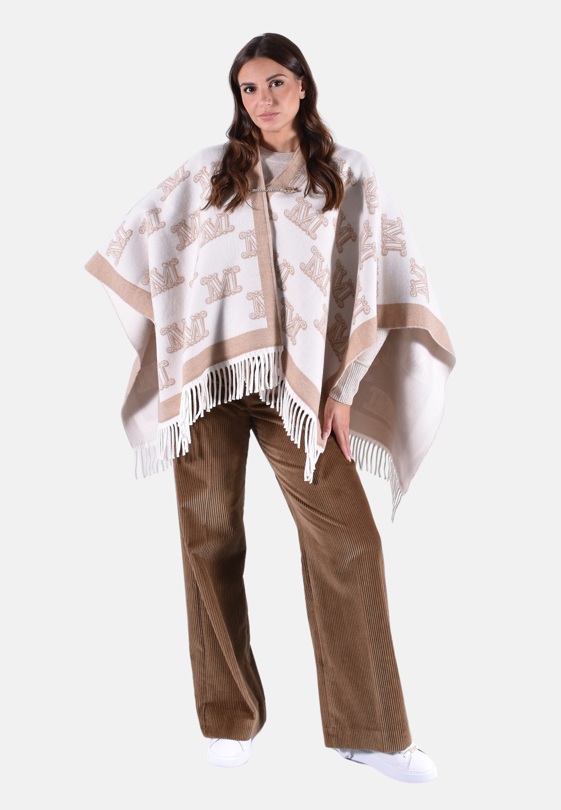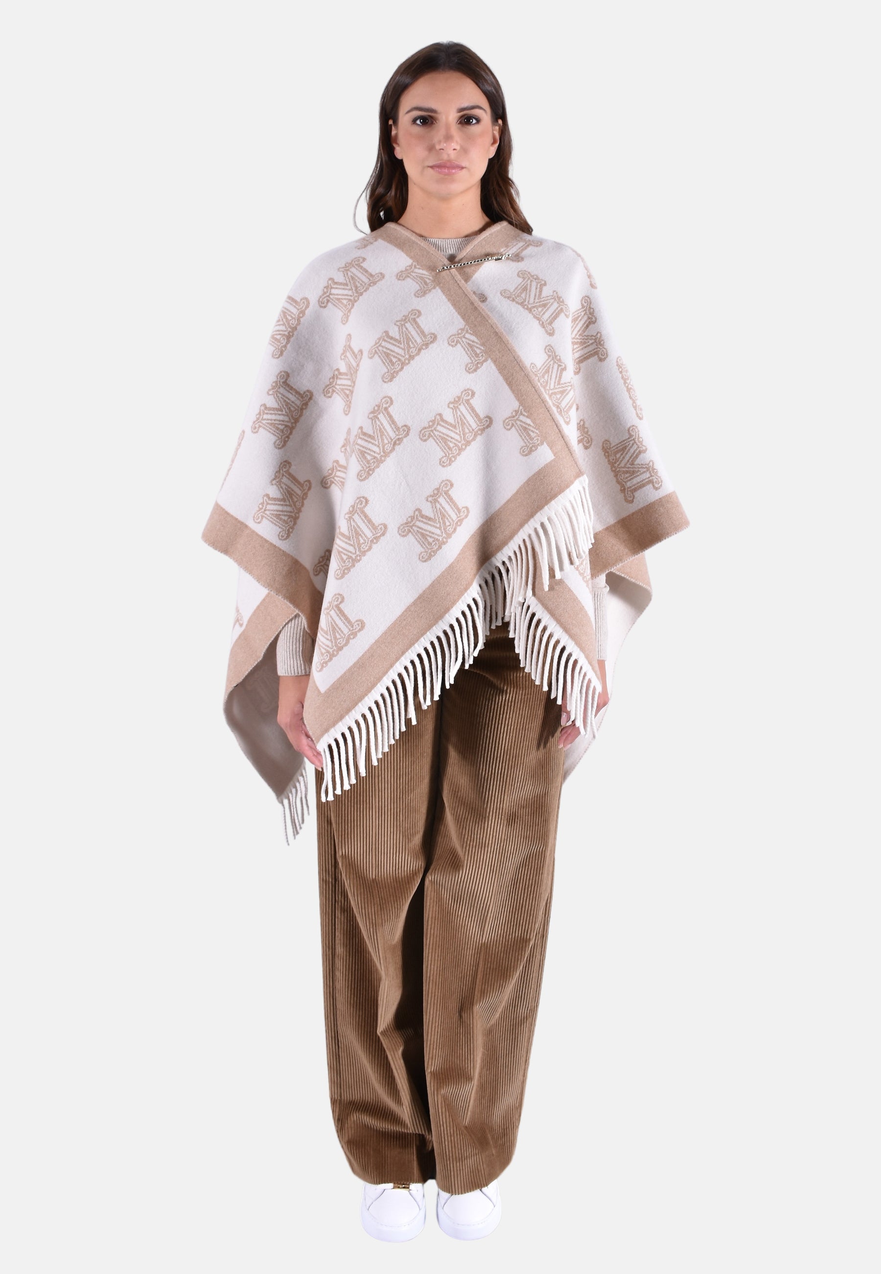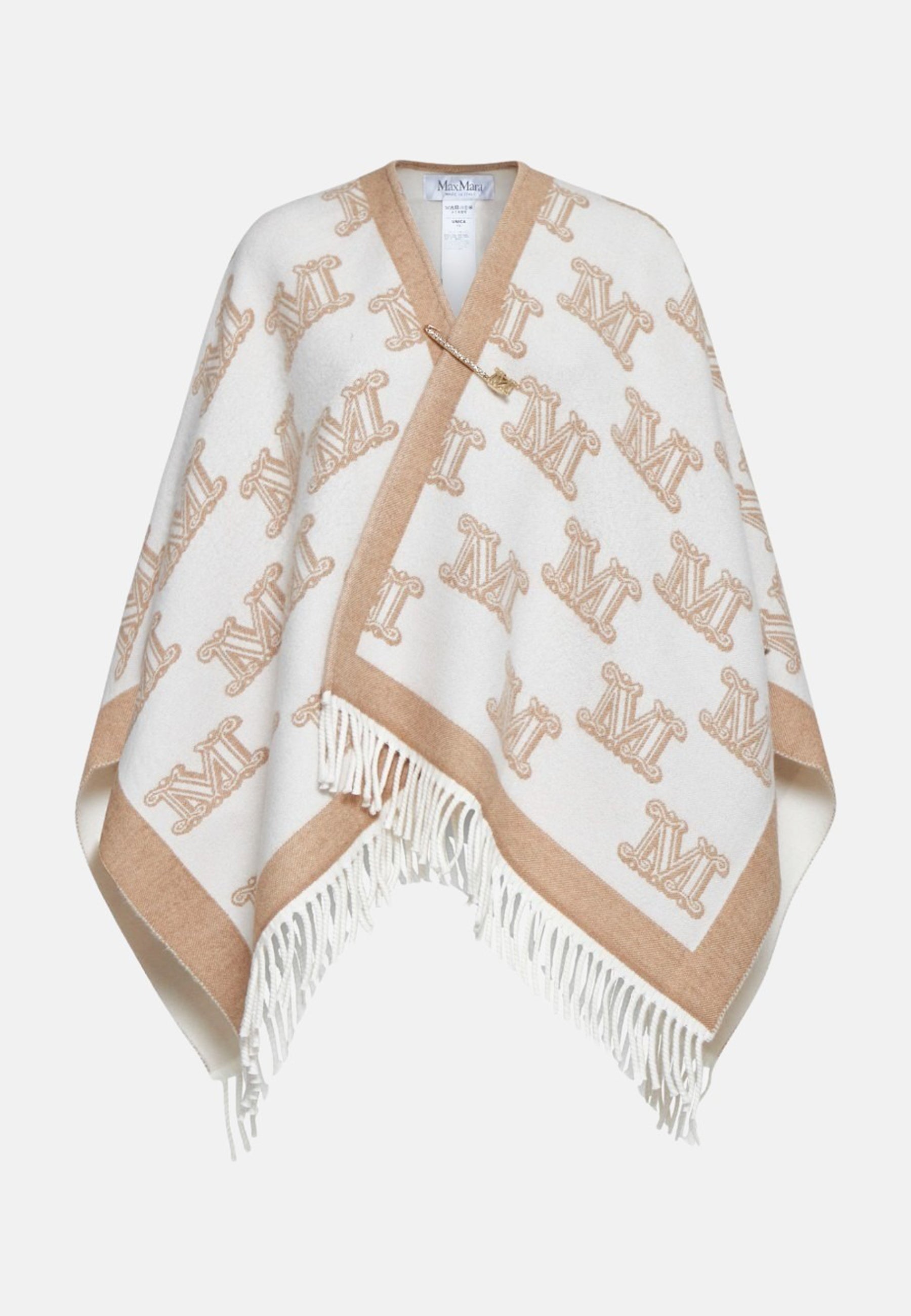 Poncho Frine in lana vergine firmato Max Mara con logo Monogram beige su fondo avorio, finiture a frange e spilla in metallo dorato con logo e strass.