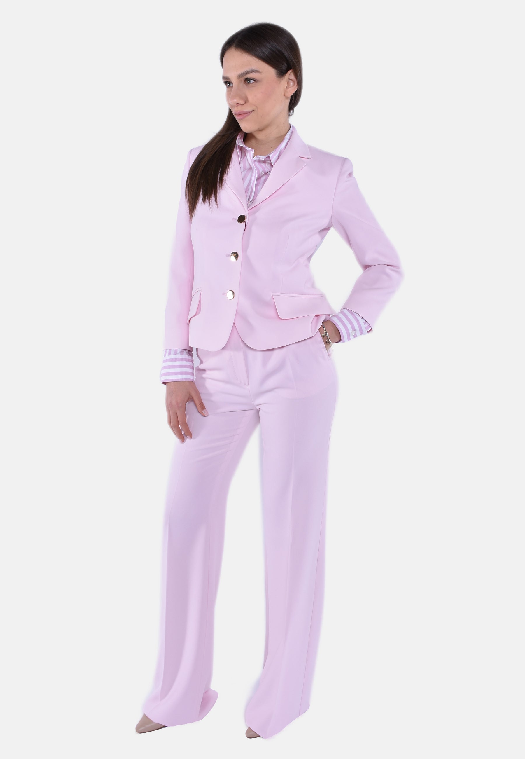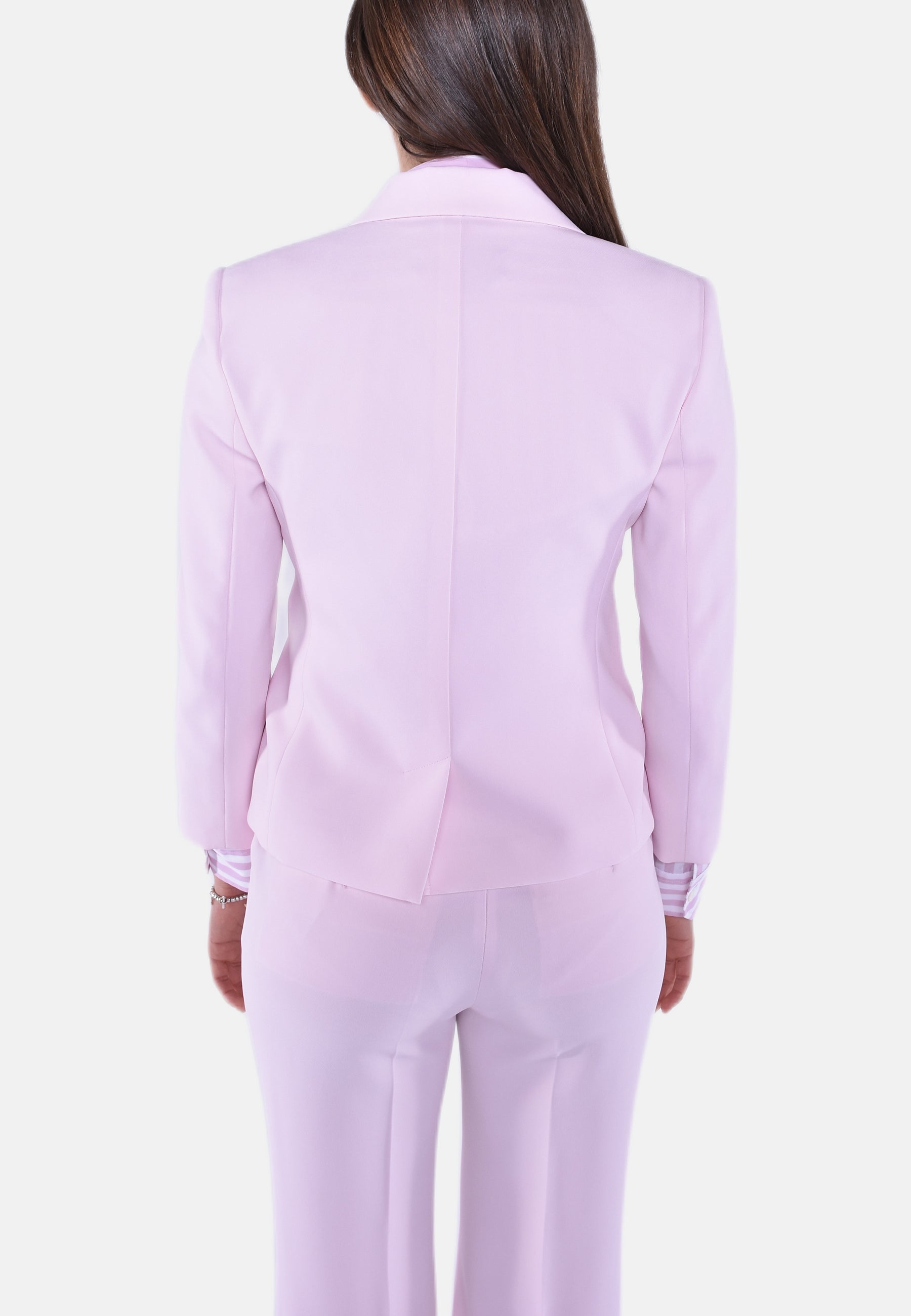 Giacca monopetto in elegante cady pesante, caratterizzata da una silhouette femminile e accostata in vita, con piccolo spacco centrale sul retro. Modello foderato collo a rever, maniche lunghe a giro e tasche con patta applicata sul davanti. La cintura abbinata permette di evidenziare il punto vita. Chiusura con tre bottoni.