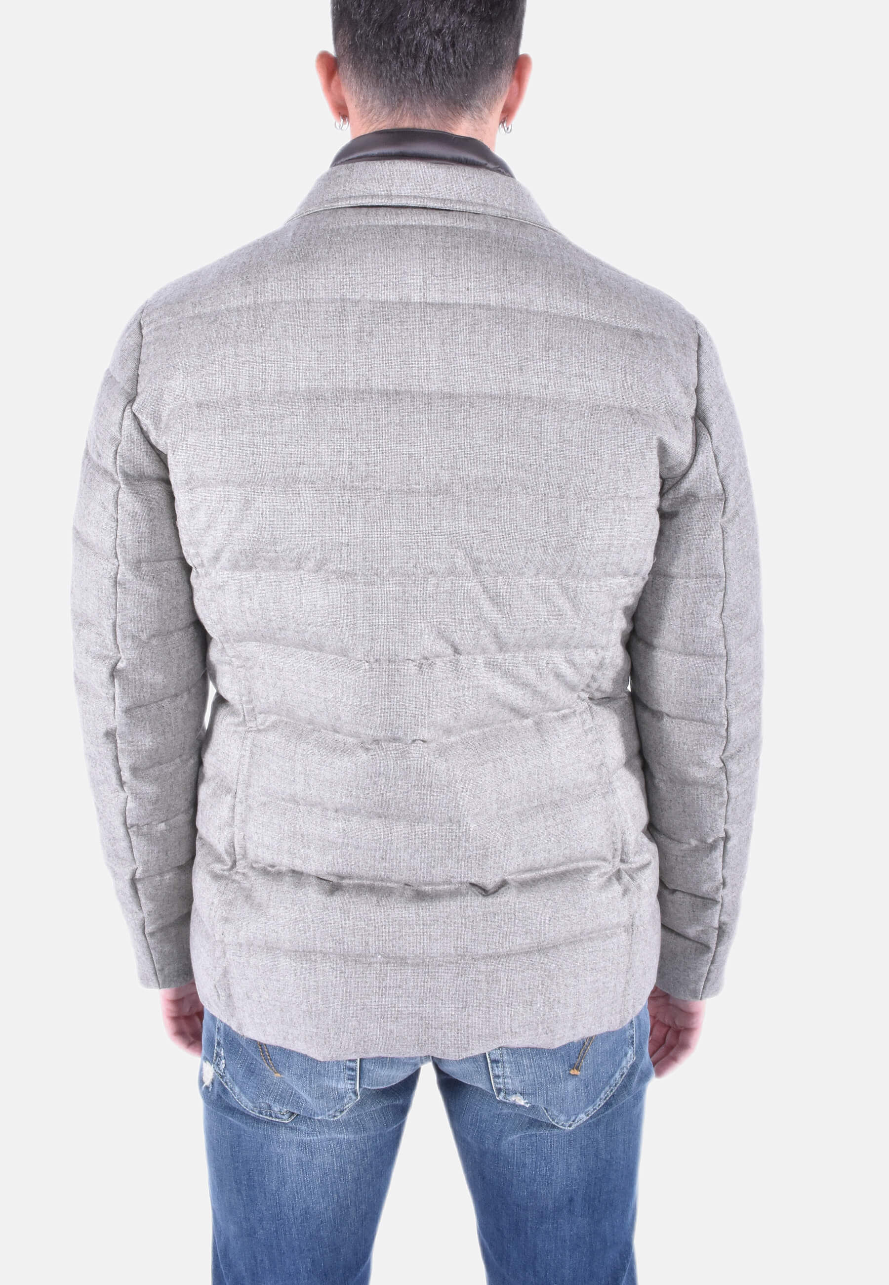 Giacca dalla linea dritta imbottita in piuma e trapuntata a boudin. Realizzata in morbida flanella di lana in micro fantasia.