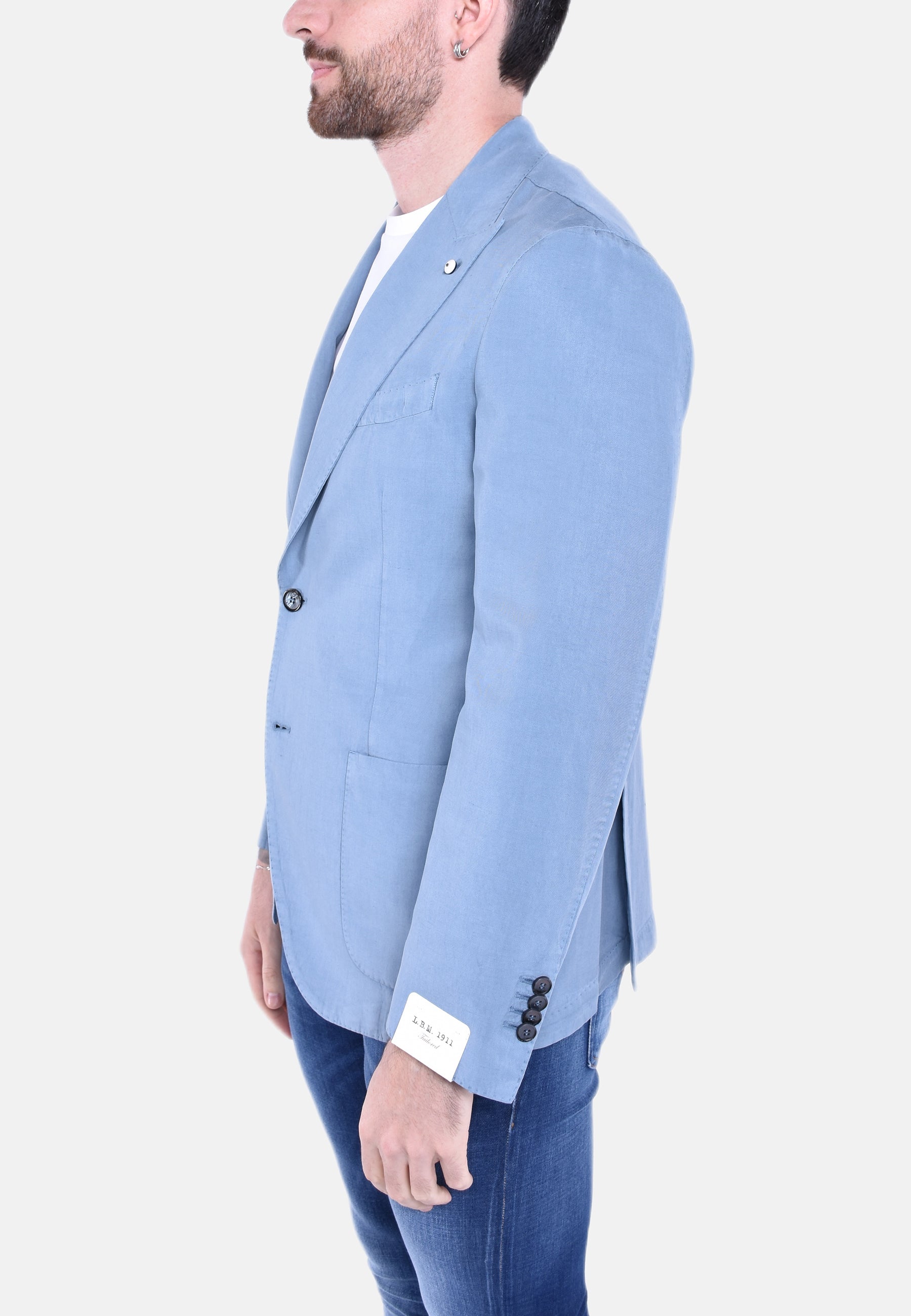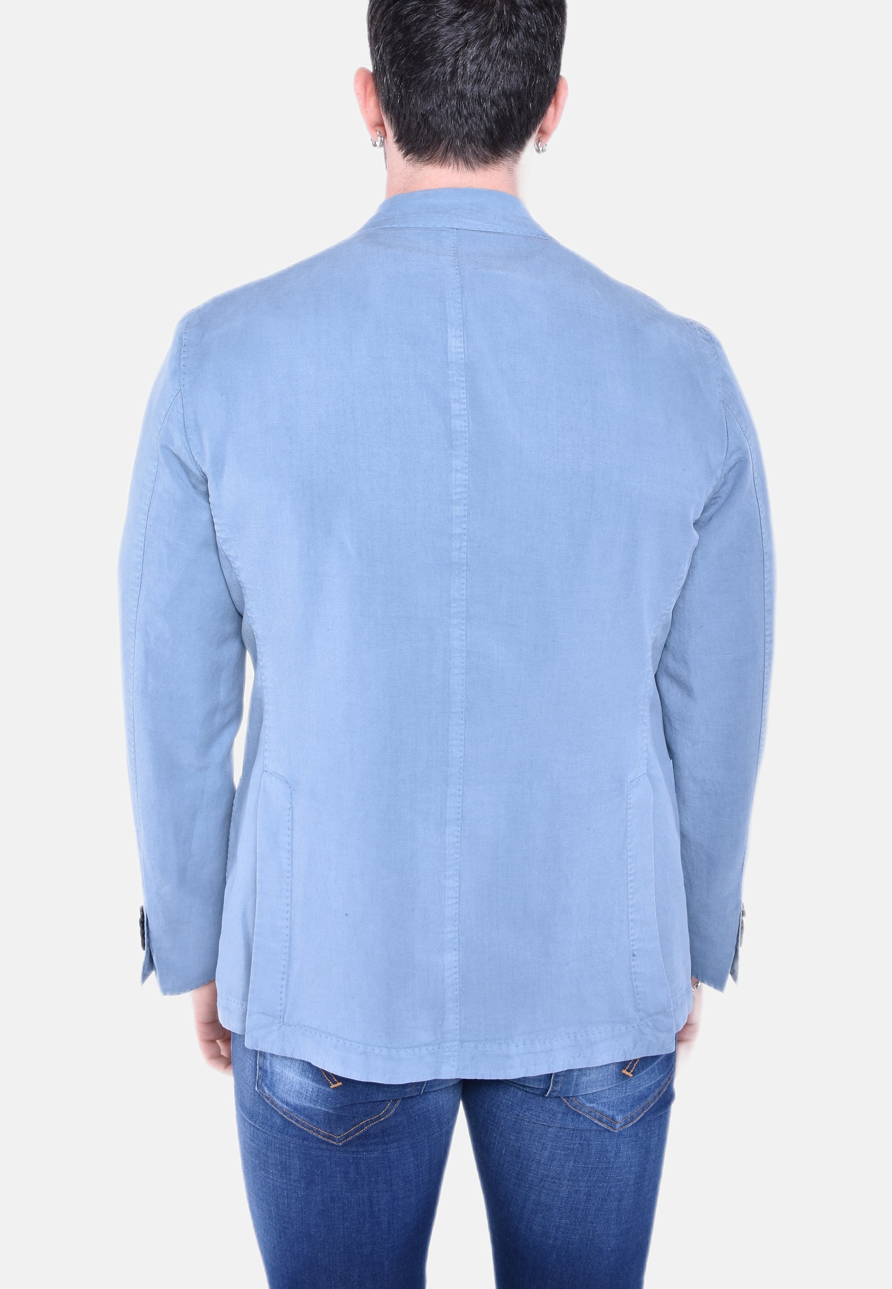 Giacca monopetto da uomo nella fresca nuance dell'azzurro realizzata in una preziosa mischia di cotone e lino. Lo stile contemporaneo di questo blazer, lavato in capo, è dato dal rever classico unito al taschino sul petto a barchetta e alle tasche a toppa.