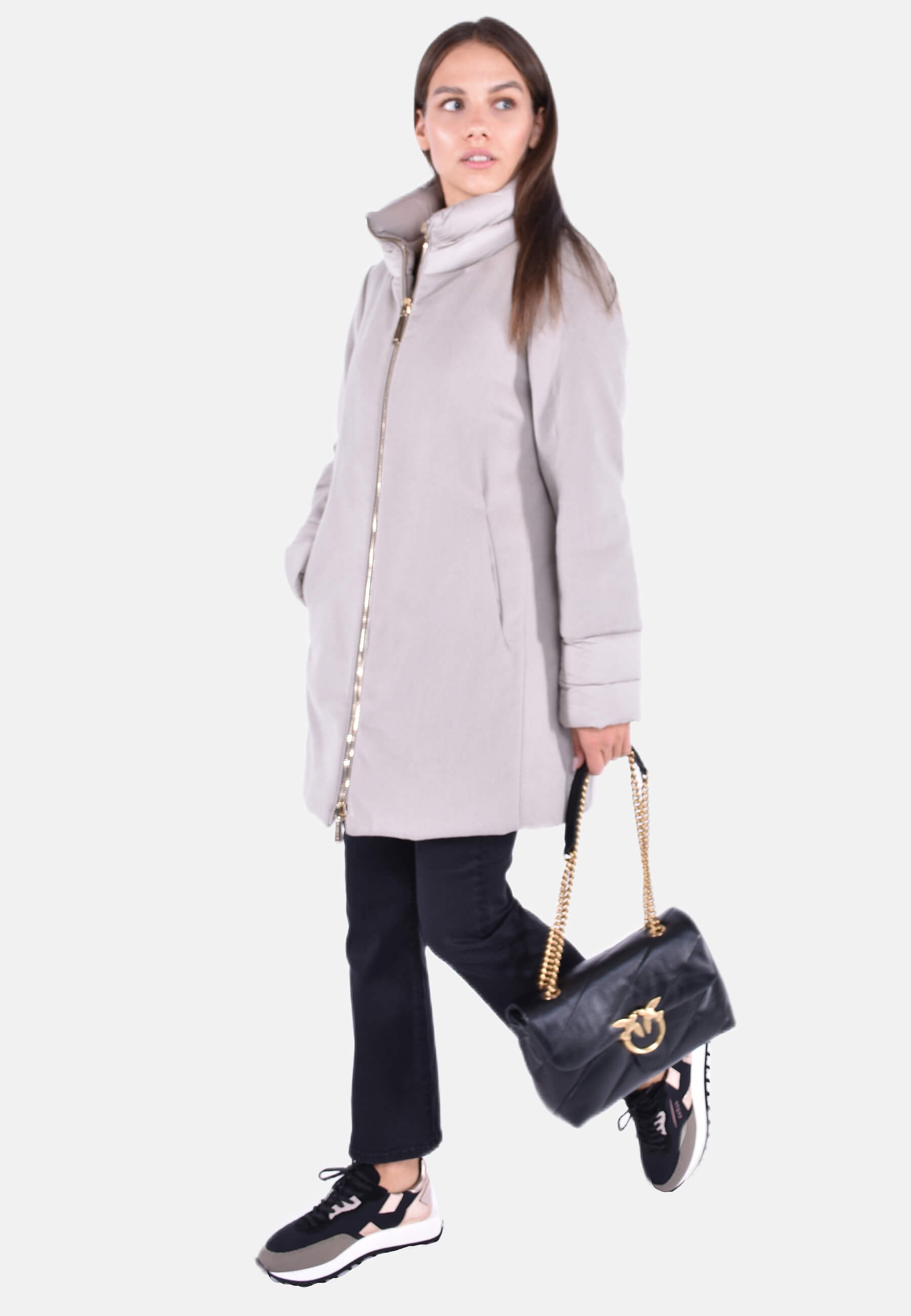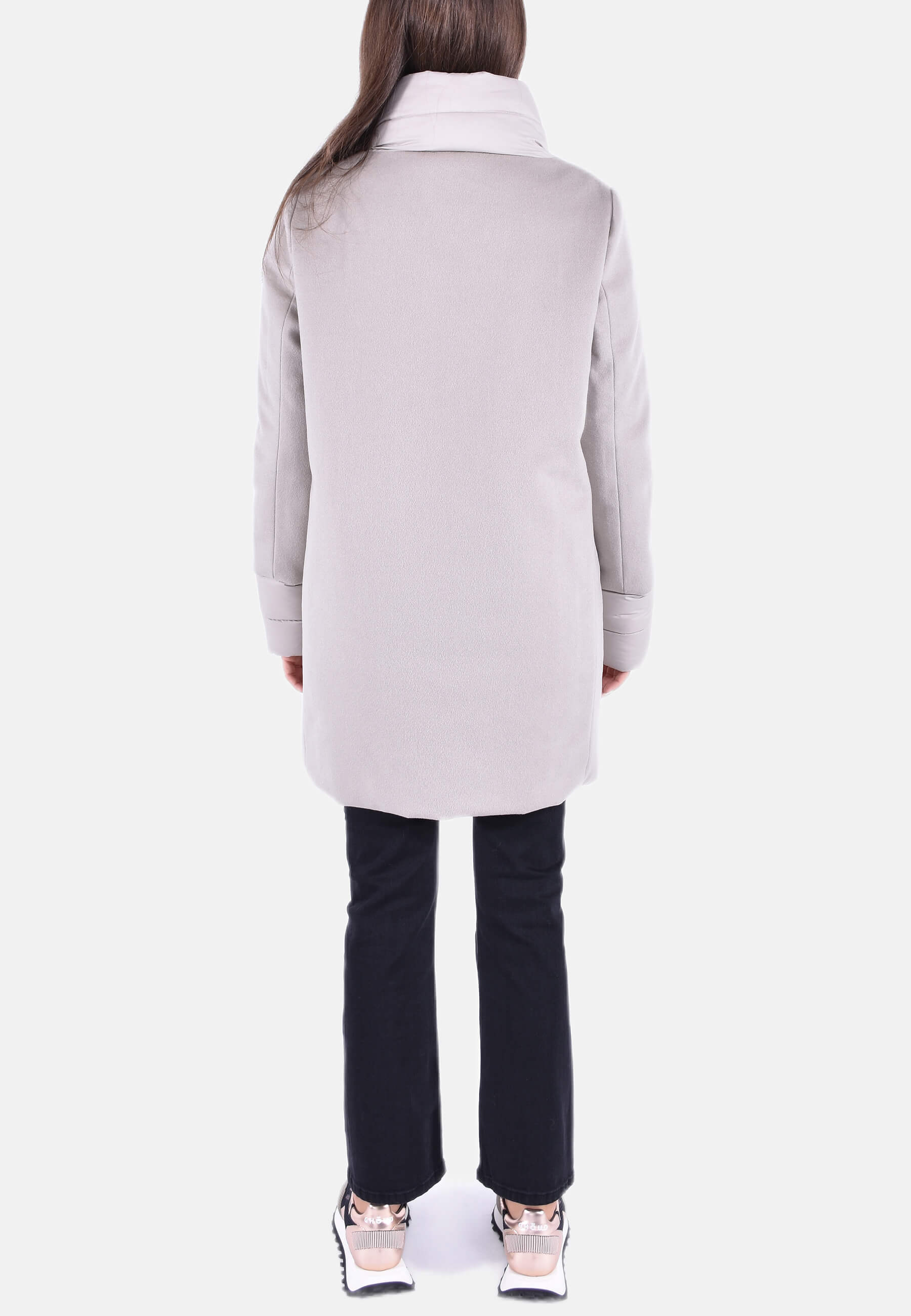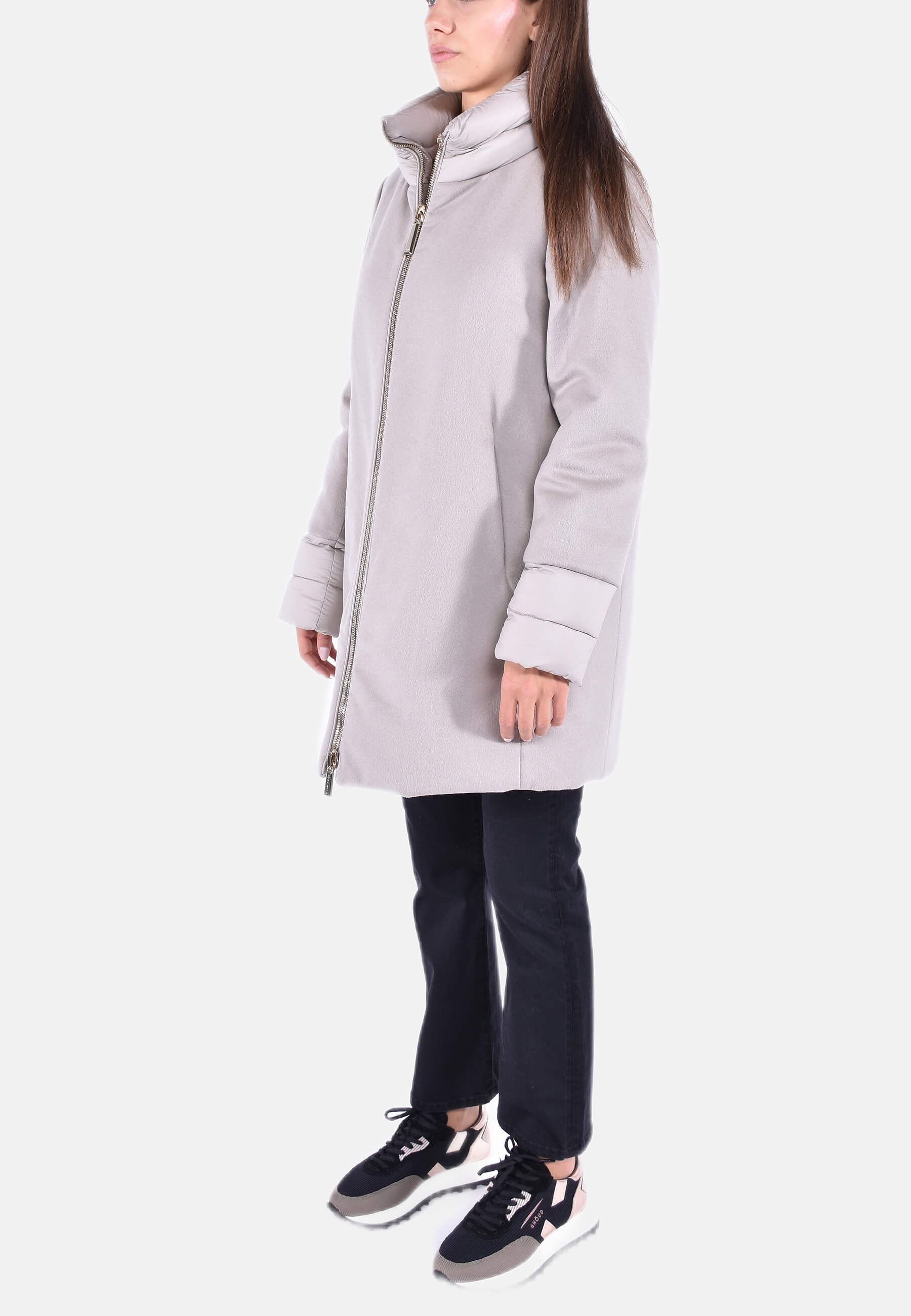 Cappotto in lana e cashmere. Modello della siluette ampia con chiusura con zip. Collo a cratere ultraleggero opaco. Imbottitura in piuma d'oca a iniezione diretta, cerniera a doppia corsa, polsini in tessuto garzato, tasche laterali a filetto.