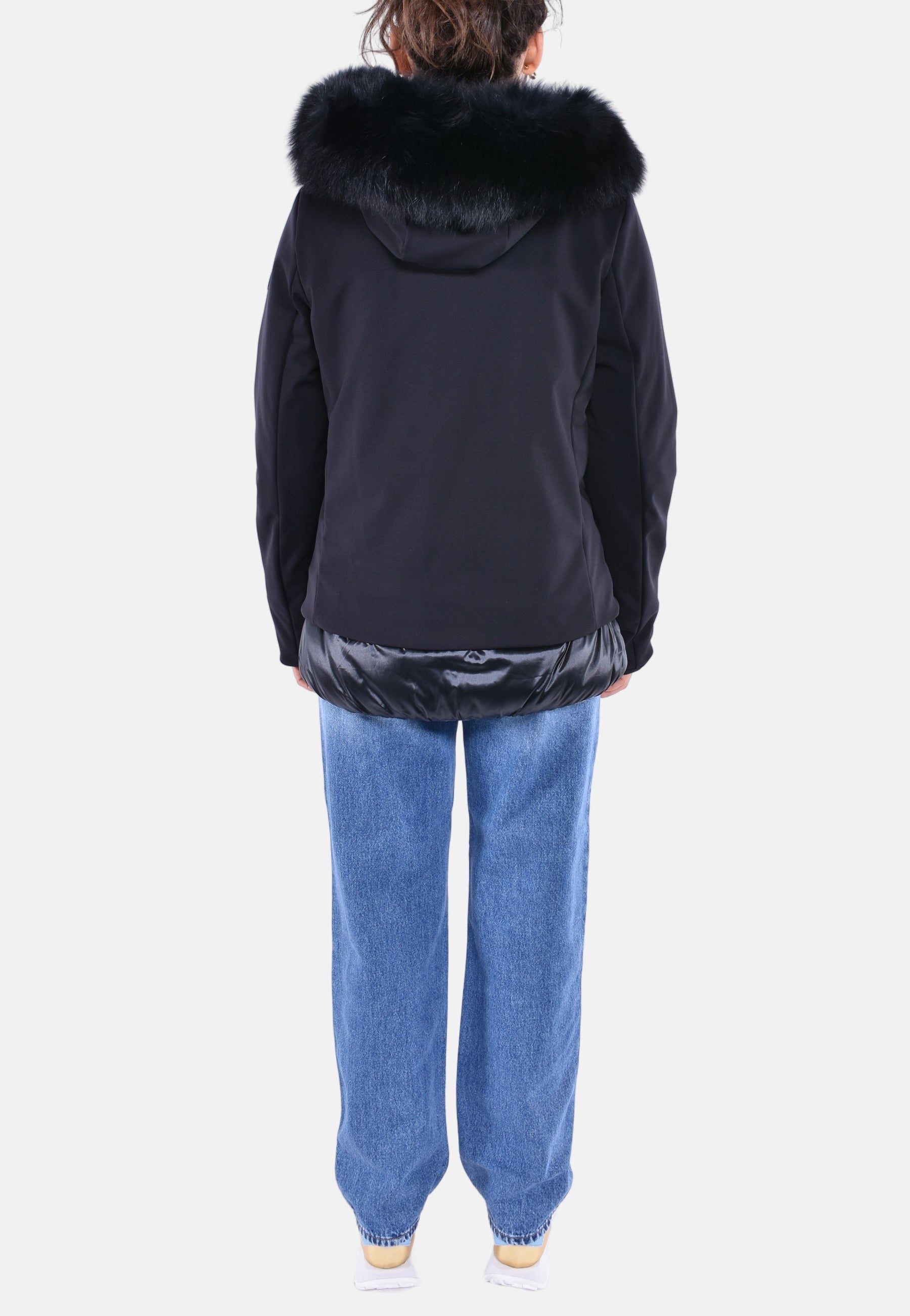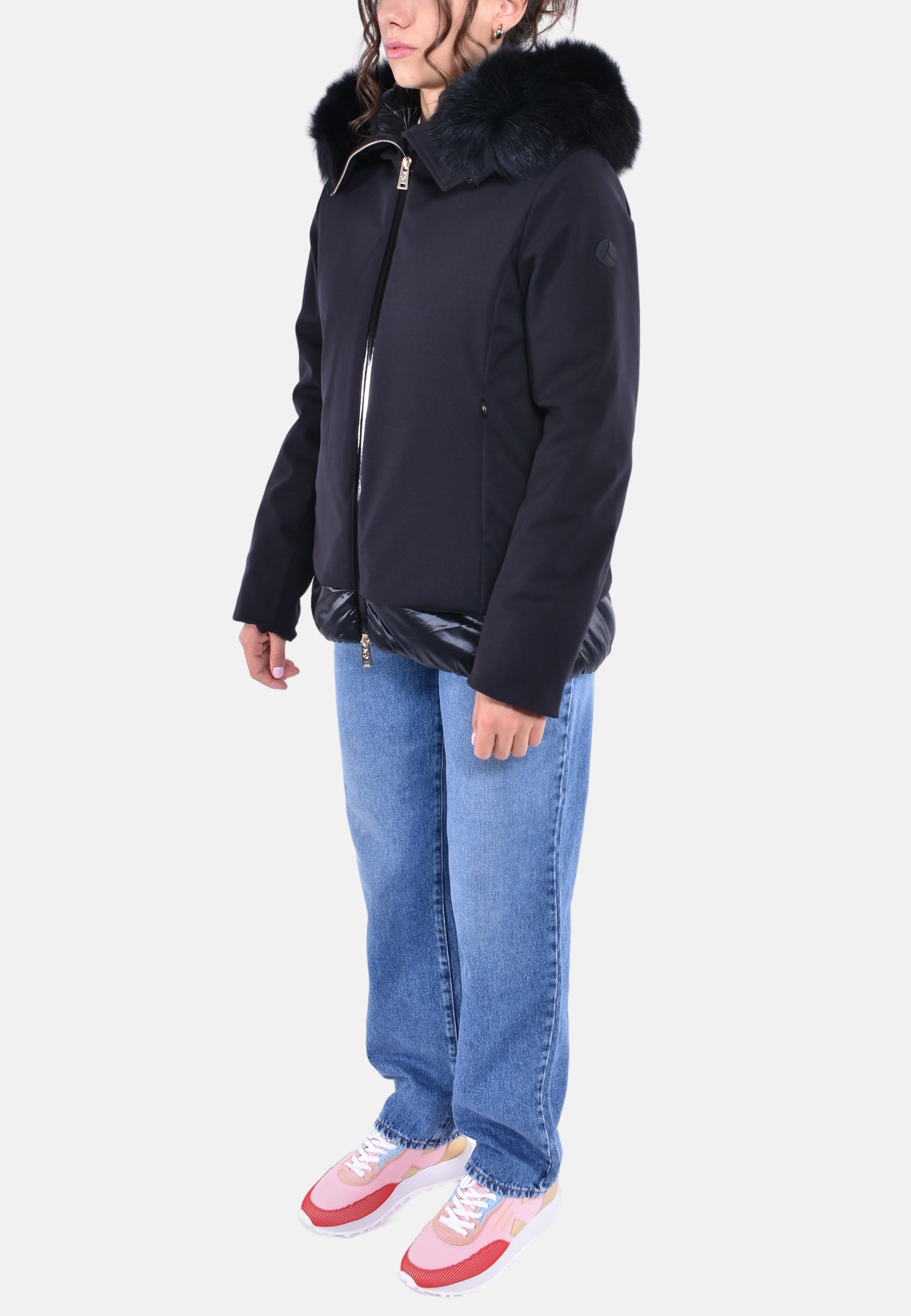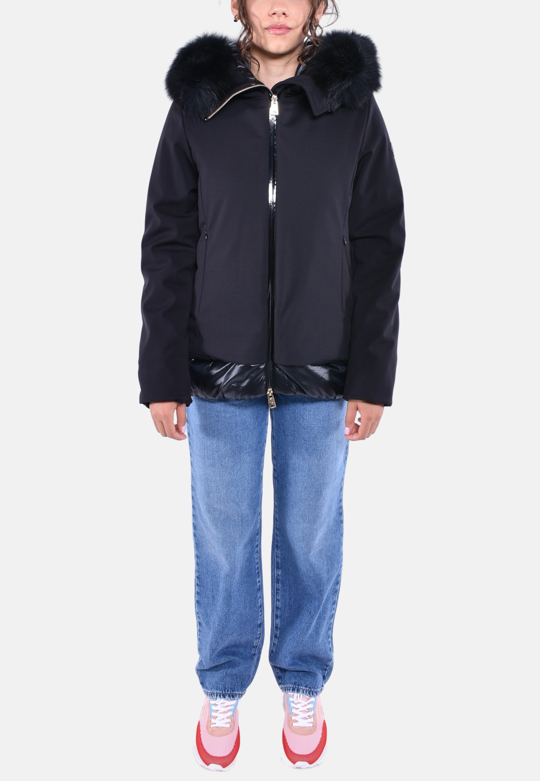 Giacca in tessuto tecnico idrorepellente imbottita internamente in materiale ecologico con zip tono su tono e oro. Tasche davanti nascoste a scomparsa. Cappuccio con pelliccia staccabile.