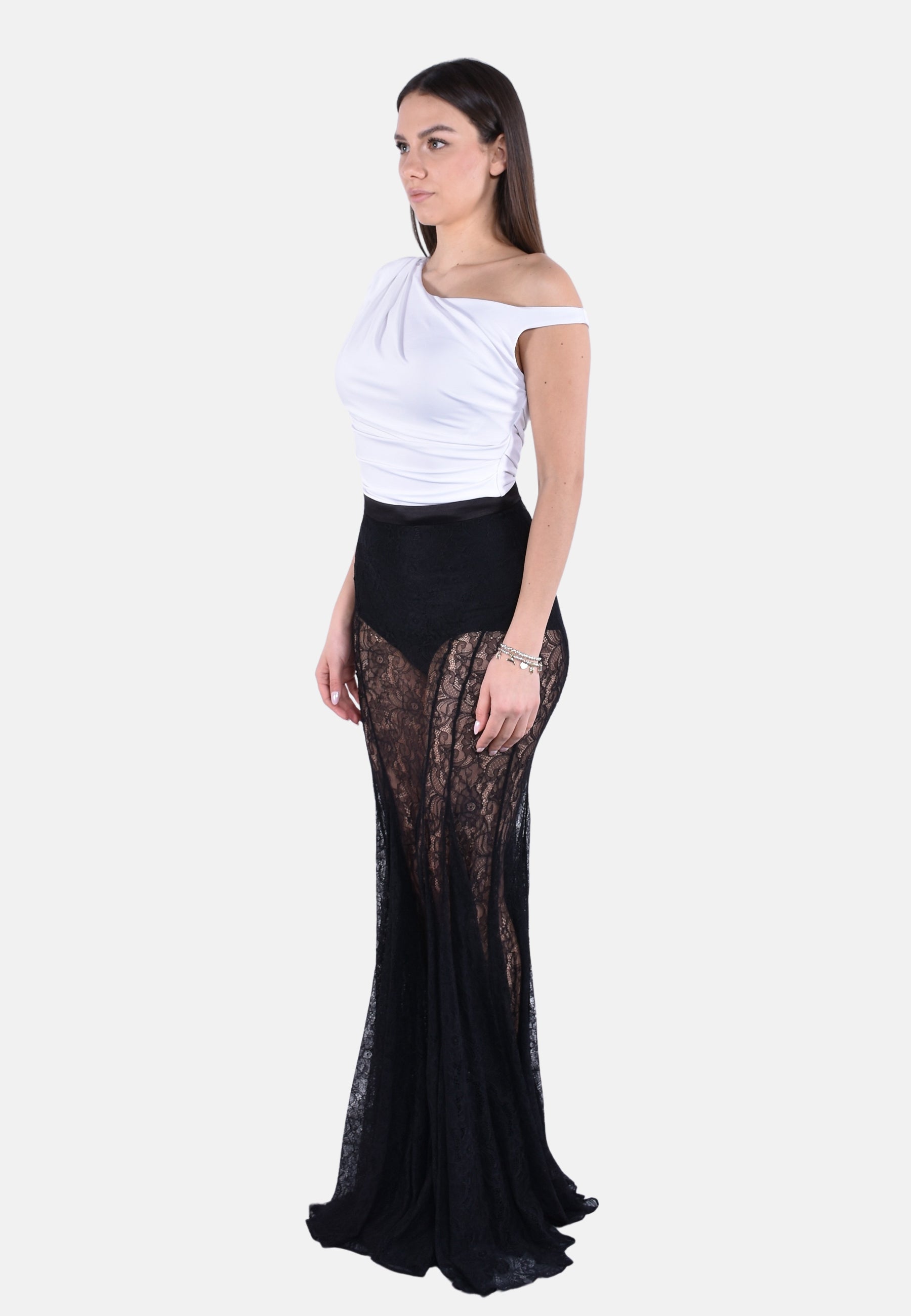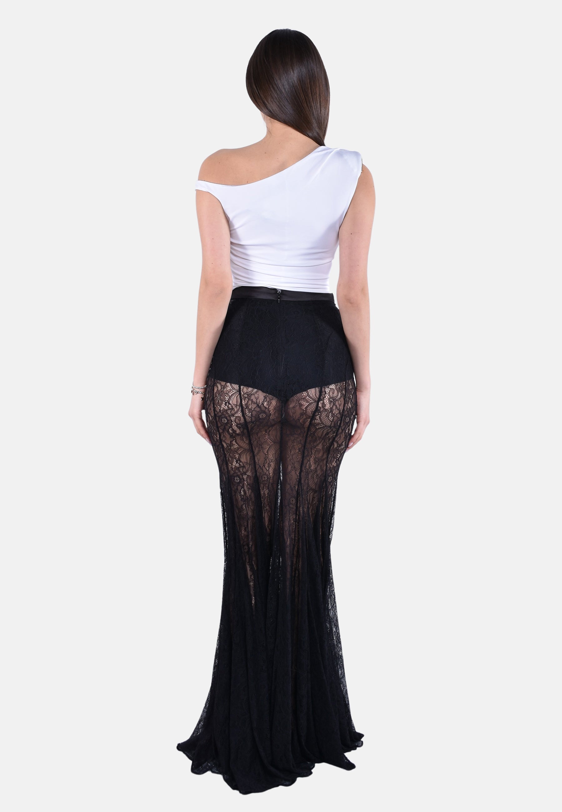 Gonna lunga in pizzo con fascione in raso stretch. Si distingue per i raffinati disegni floreali che regalano movimento alla trama. D'impatto la costruzione a sirena, con coda sul retro per una silhouette scenografica. Vestibilità regular.