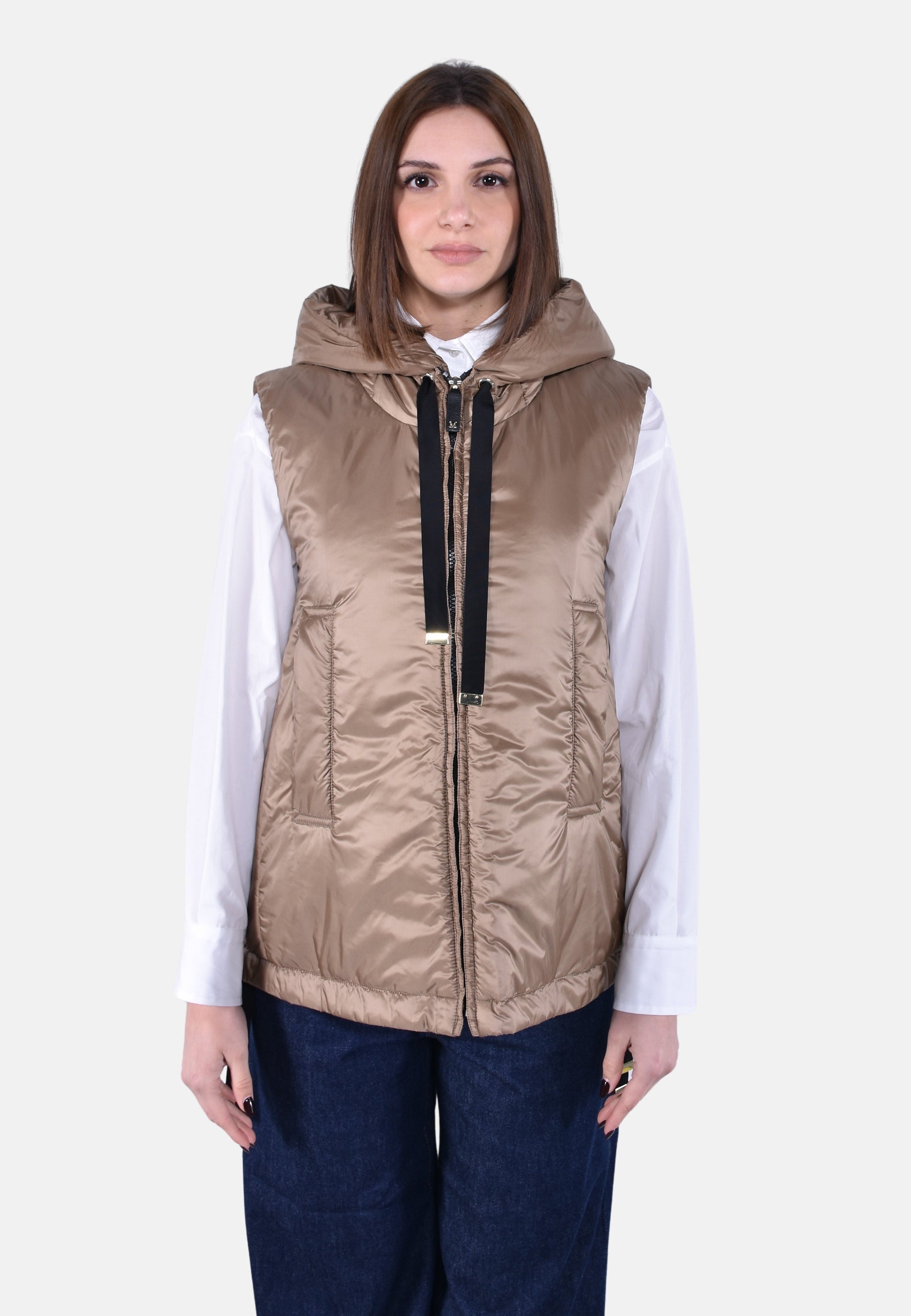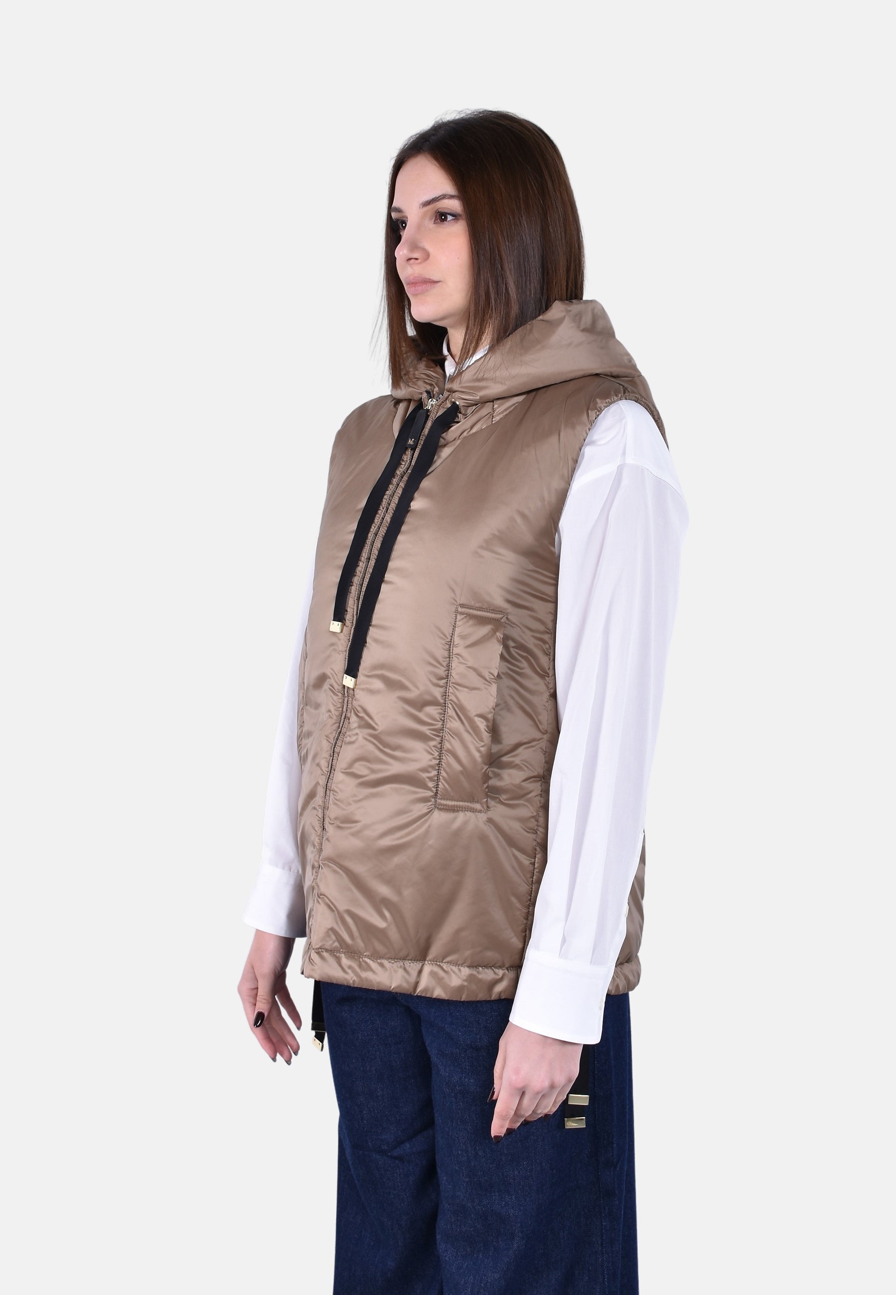 Gilet corto con cappuccio e bordo a coulisse.