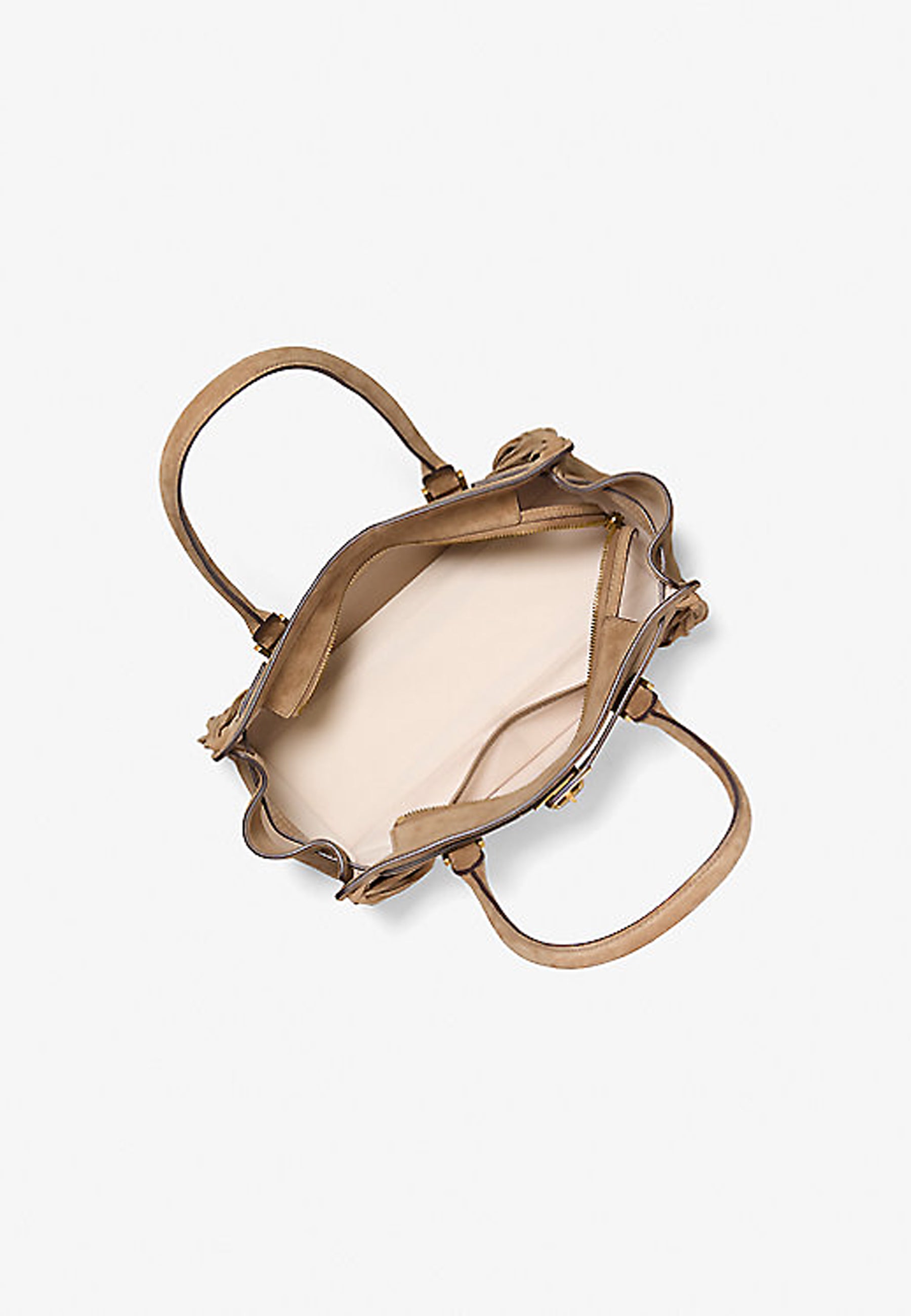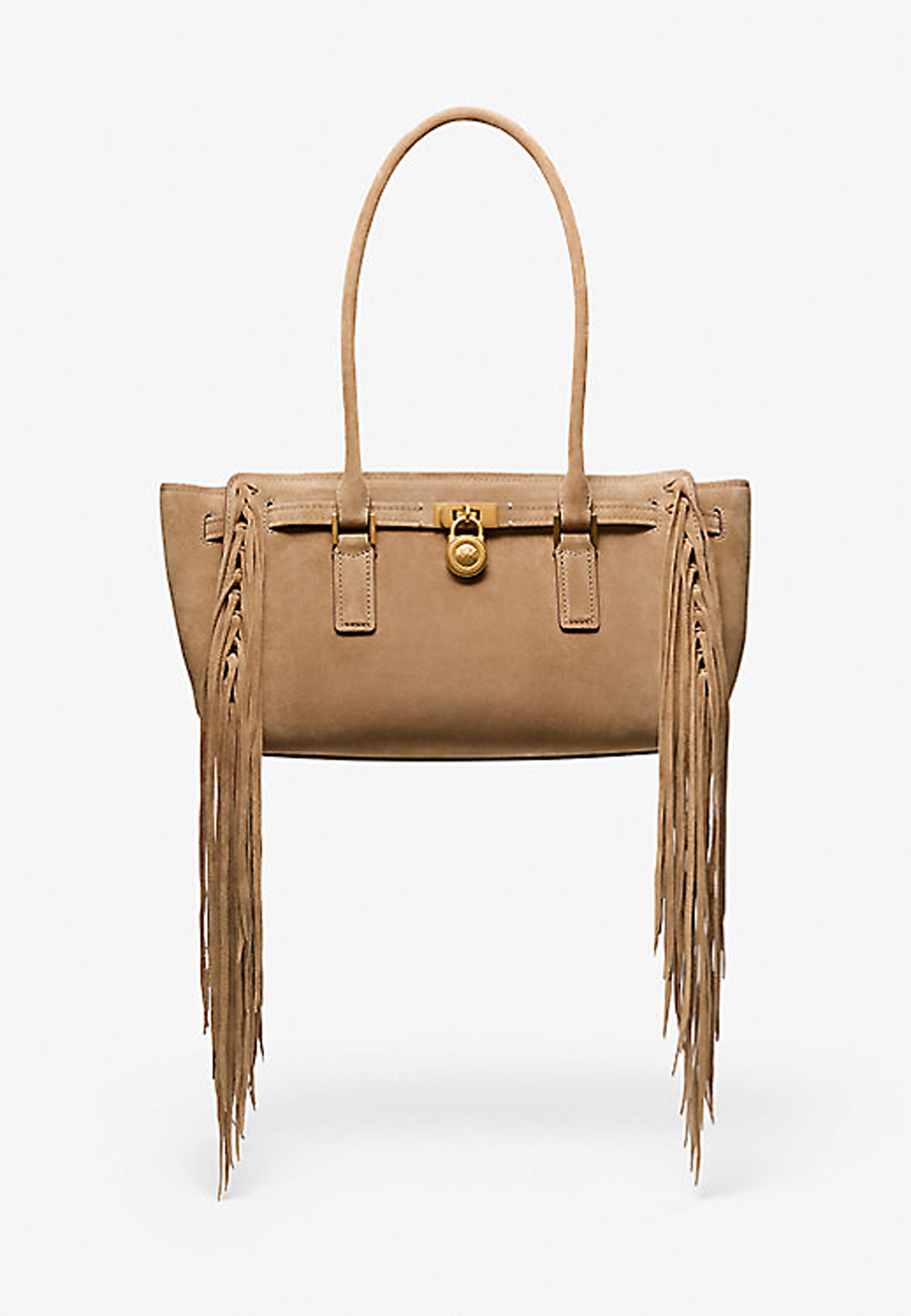 Per me un classico perfetto non passa mai di moda. La riedizione della nostra borsa Hamilton dimostra che il design di qualità è senza tempo", dichiara Michael Kors. Lo stile heritage-chic della Hamilton Moderne la rende un accessorio accattivante che amerai per sempre. Impreziosita da frange in pelle scamosciata che conferiscono un look bohémien di ispirazione vintage, questa borsa a mano presenta soffietti laterali e un design con cintura rifinito con un elegante ciondolo con catena per un tocco moderno. Portala con te tutto il giorno grazie ai manici extra lunghi.
