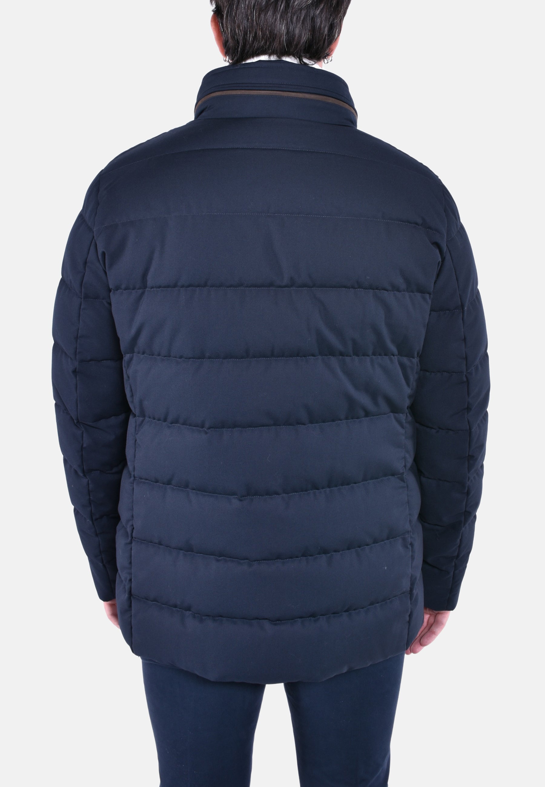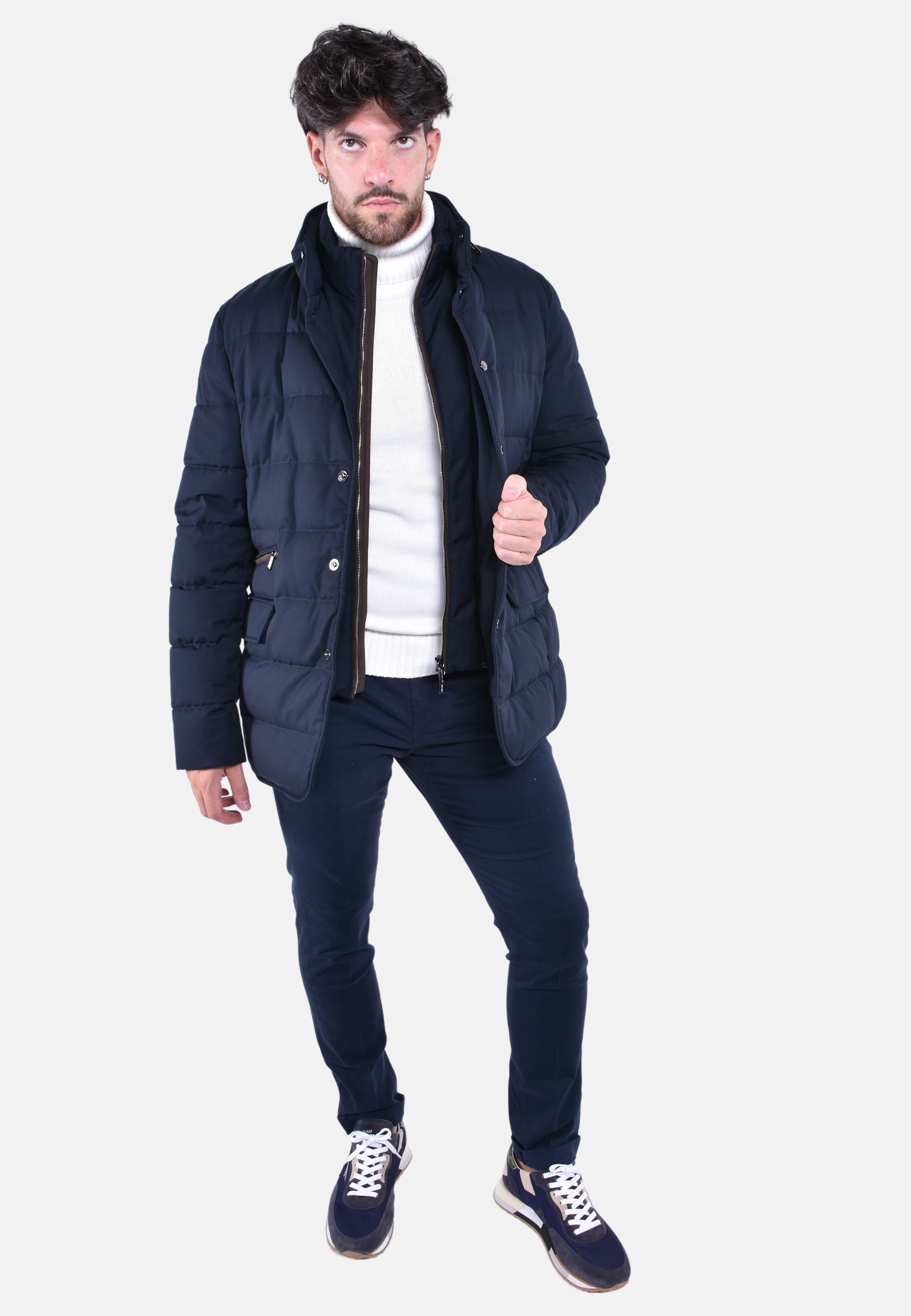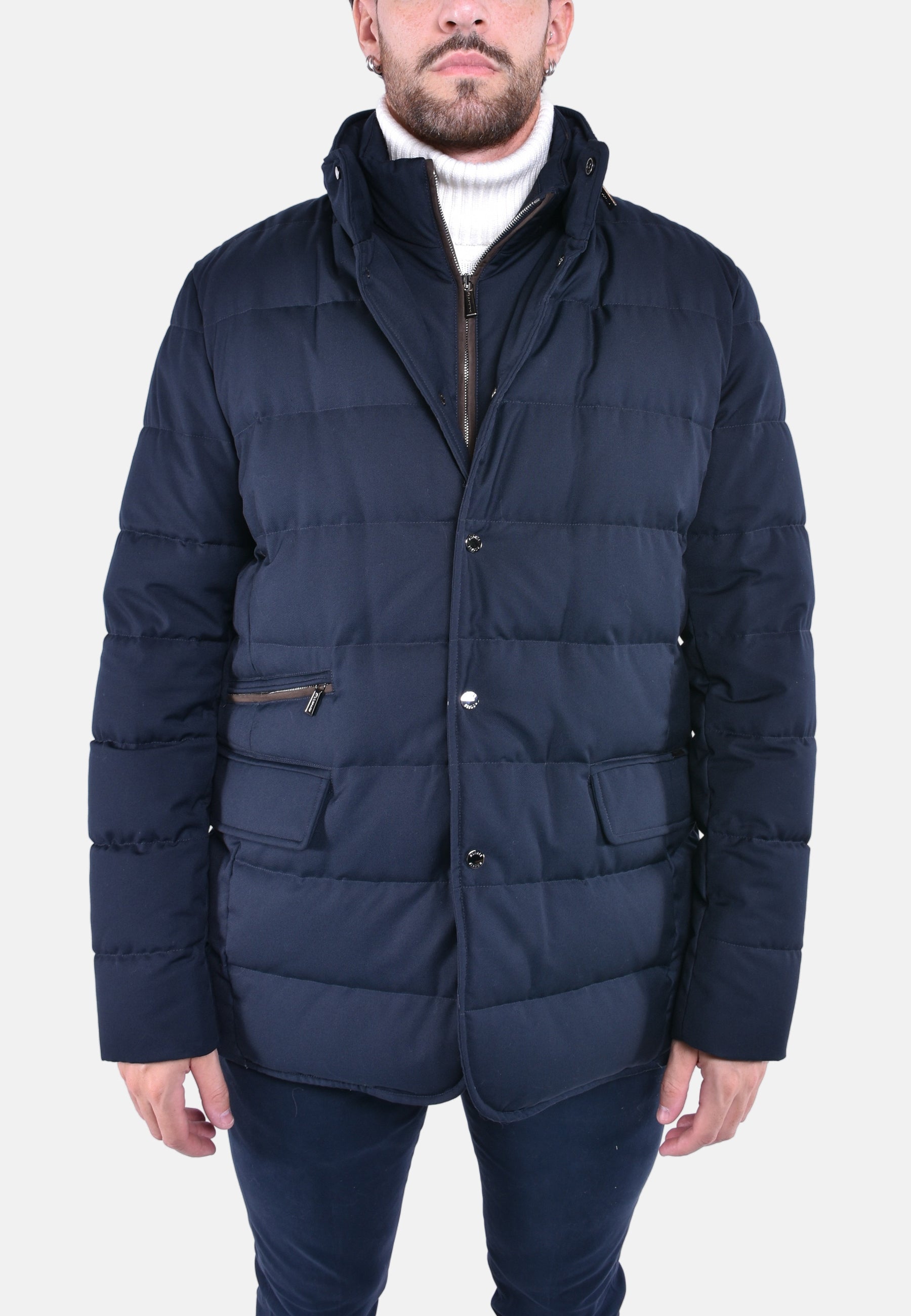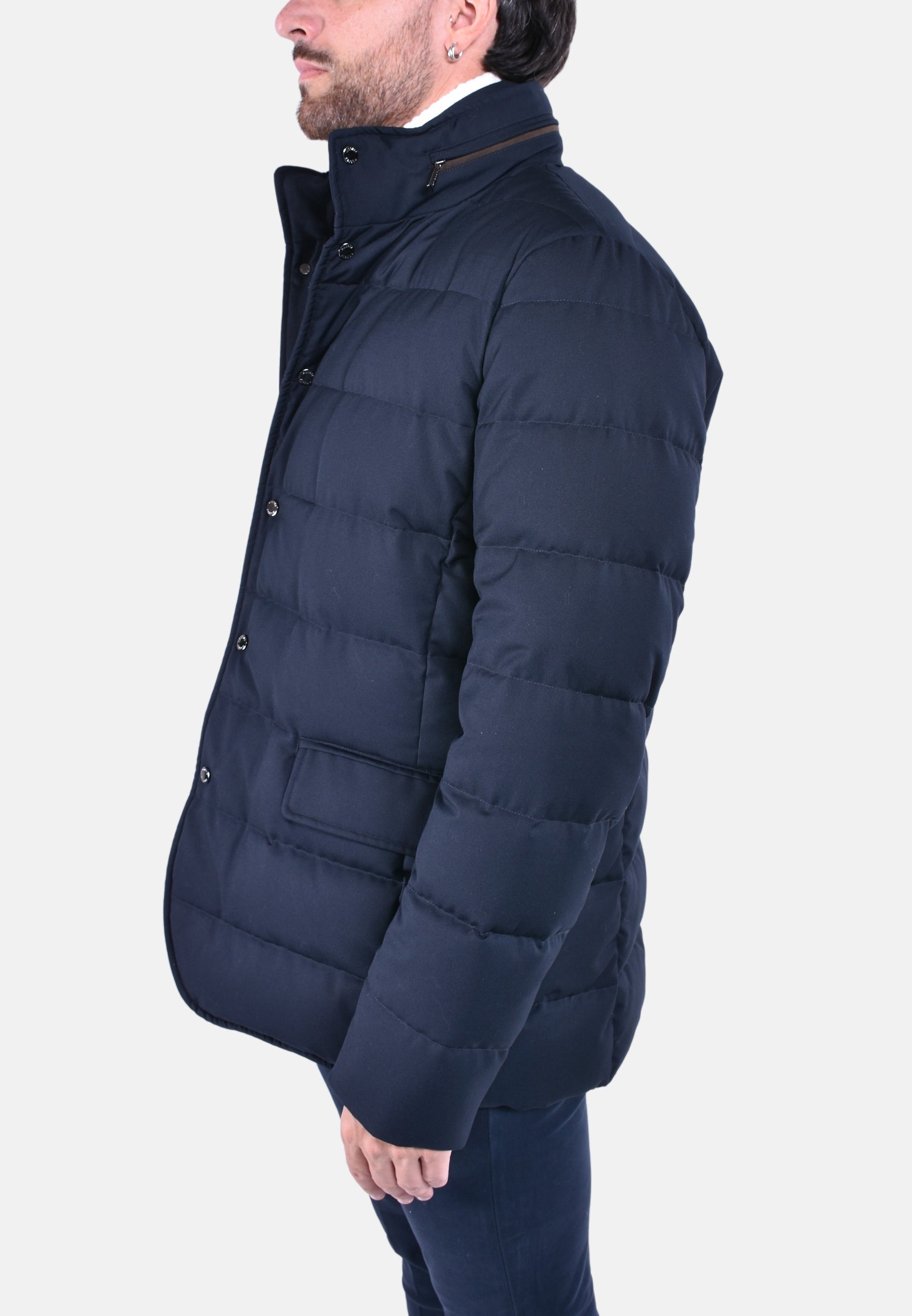 Capospalla in stile giacca 3 bottoni appartenente alla linea Acqua (2 ombrellini), imbottito in piuma d'oca e trapuntata a boudin.