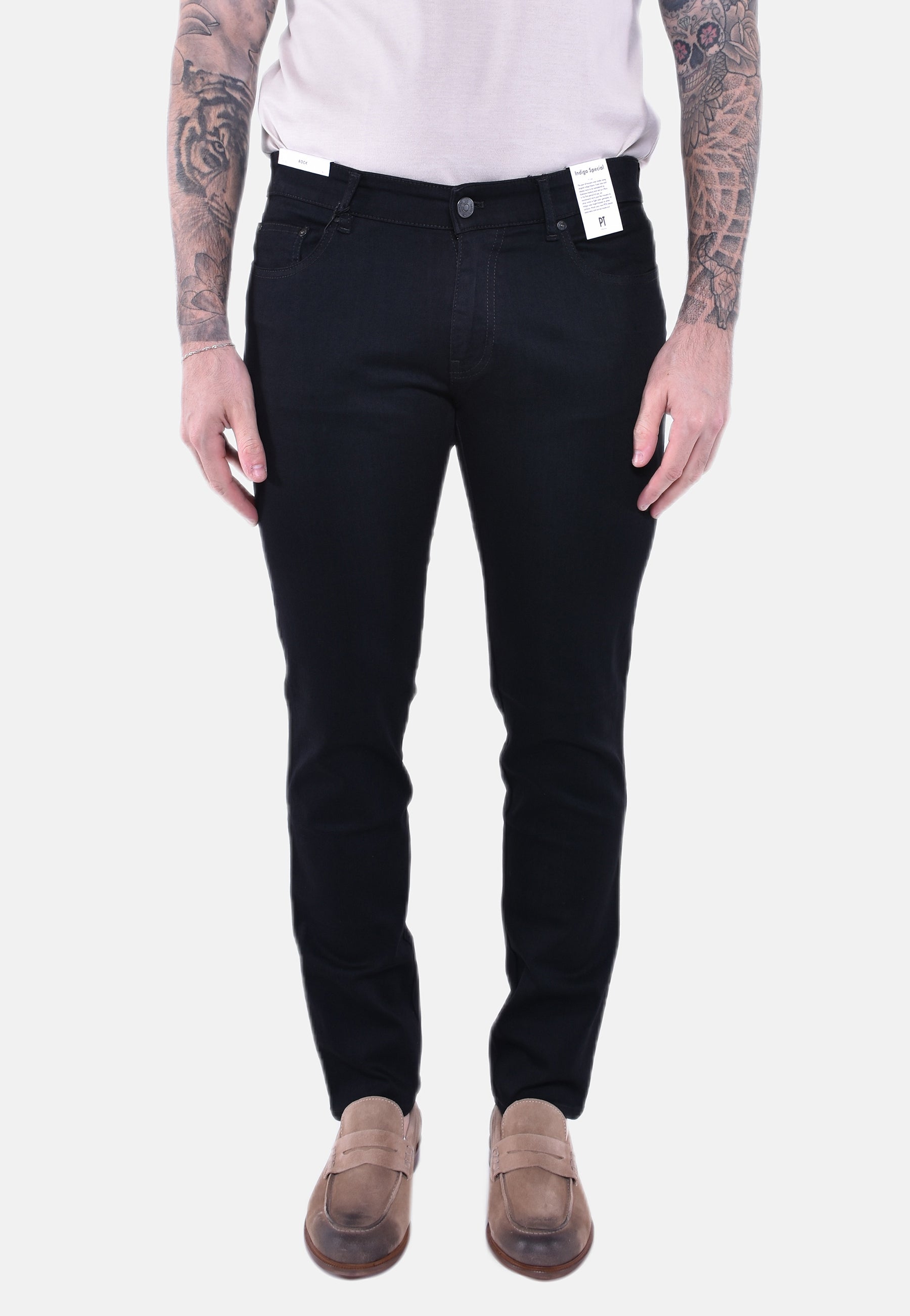 Jeans in denim stretch super black, una tela di alta qualità artigianale, strutturata e dall'aspetto uniforme. Ha un design cinque tasche e linea super slim perfetta anche in look eleganti e formali.
