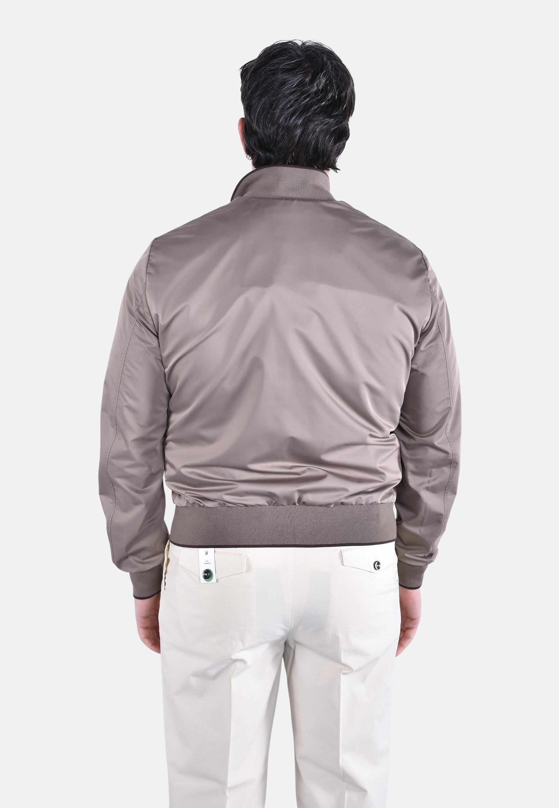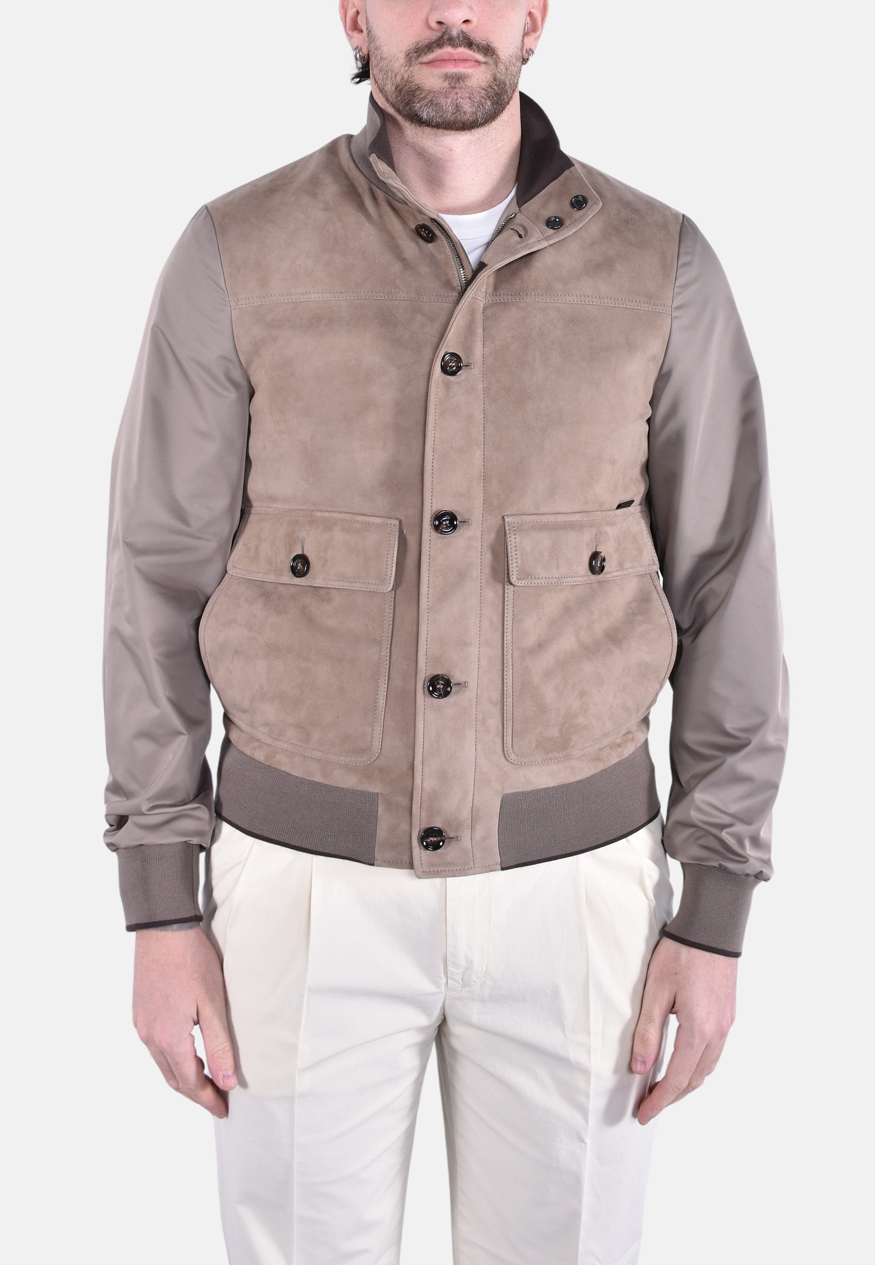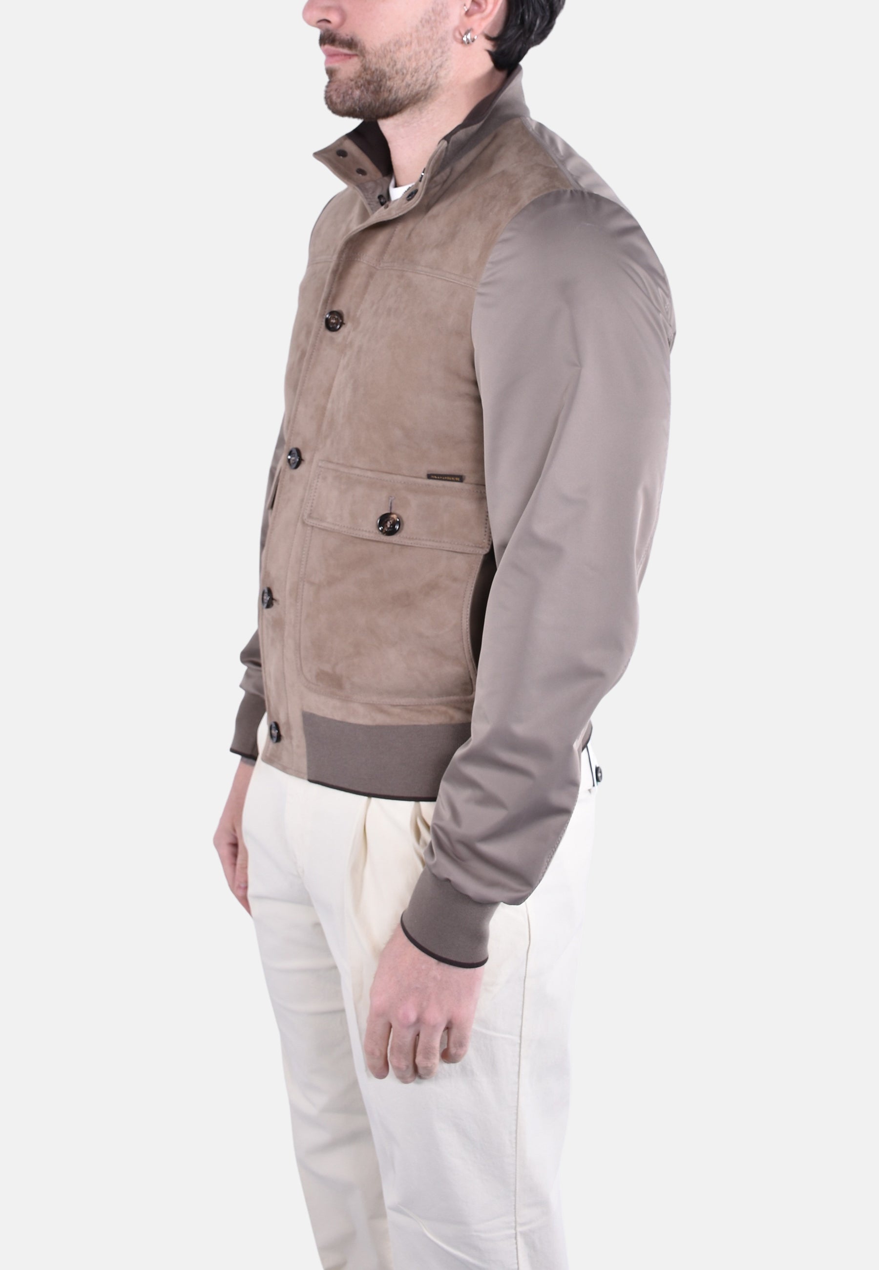 Bomber realizzato in pregiata pelle scamosciata d'agnello abbinata a parti in tessuto drill cangiante con doppia tintura.