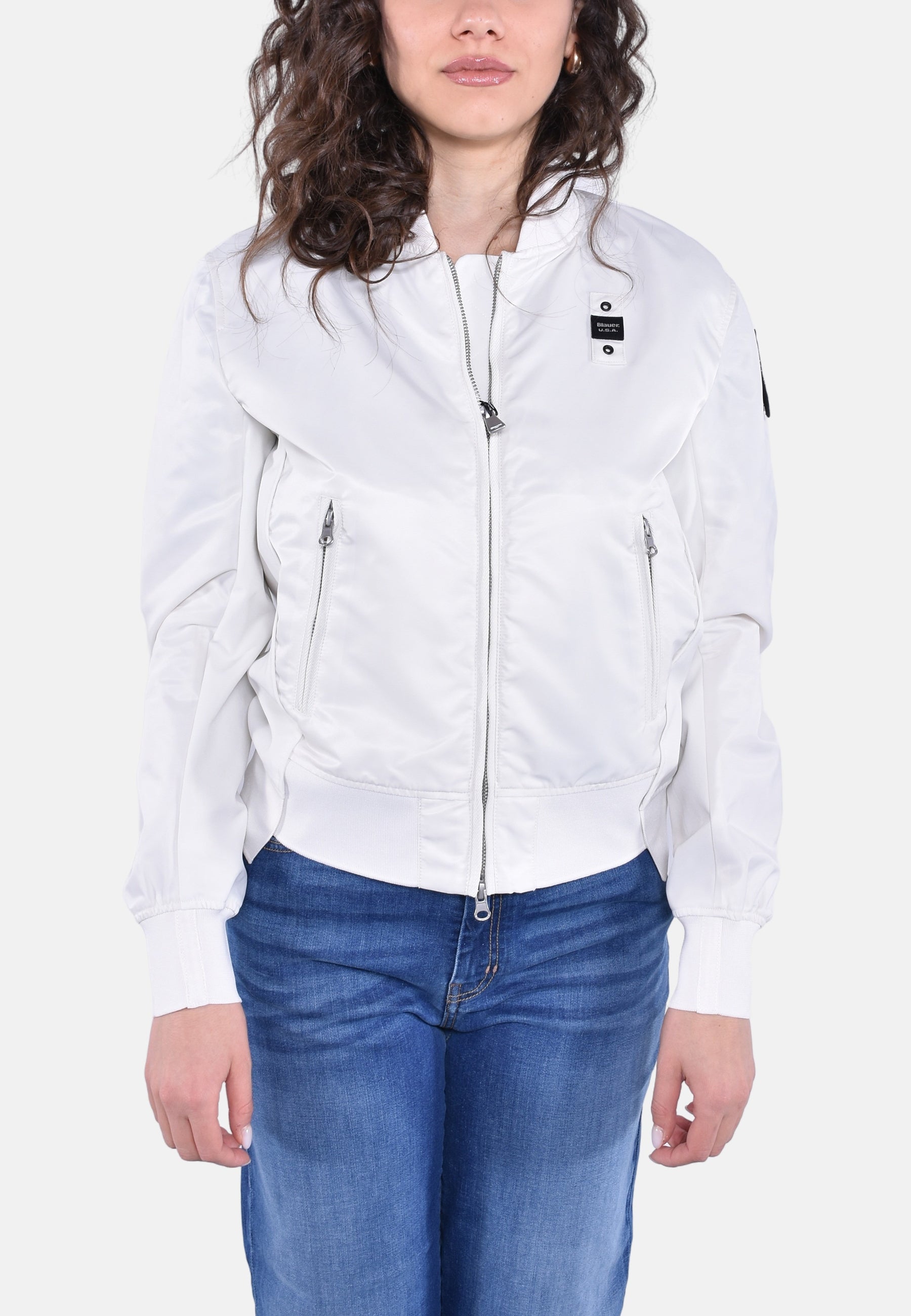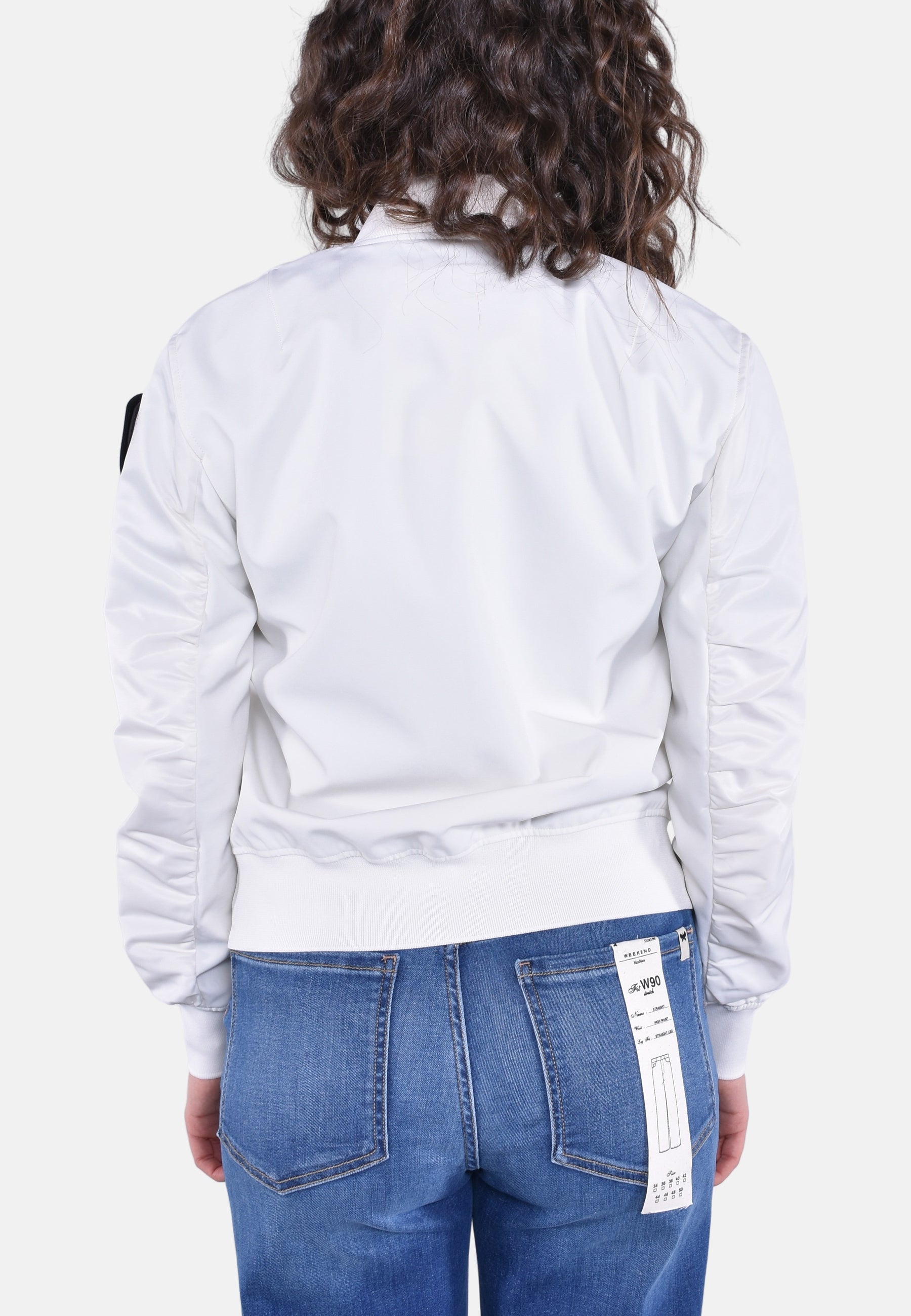 Bomber in nylon lucido e rasato sul davanti ed in neoprene in tono sul retro, sotto le maniche e nella para zip davanti. Capo leggermente più lungo dietro per dare movimento.