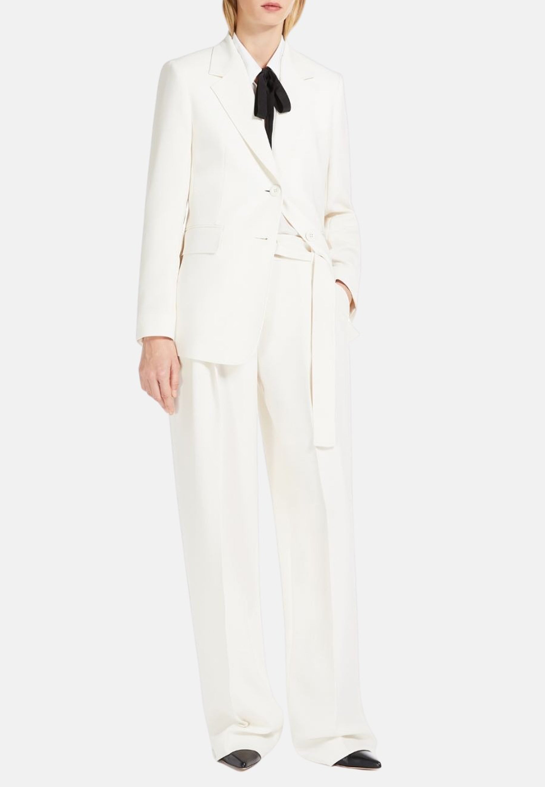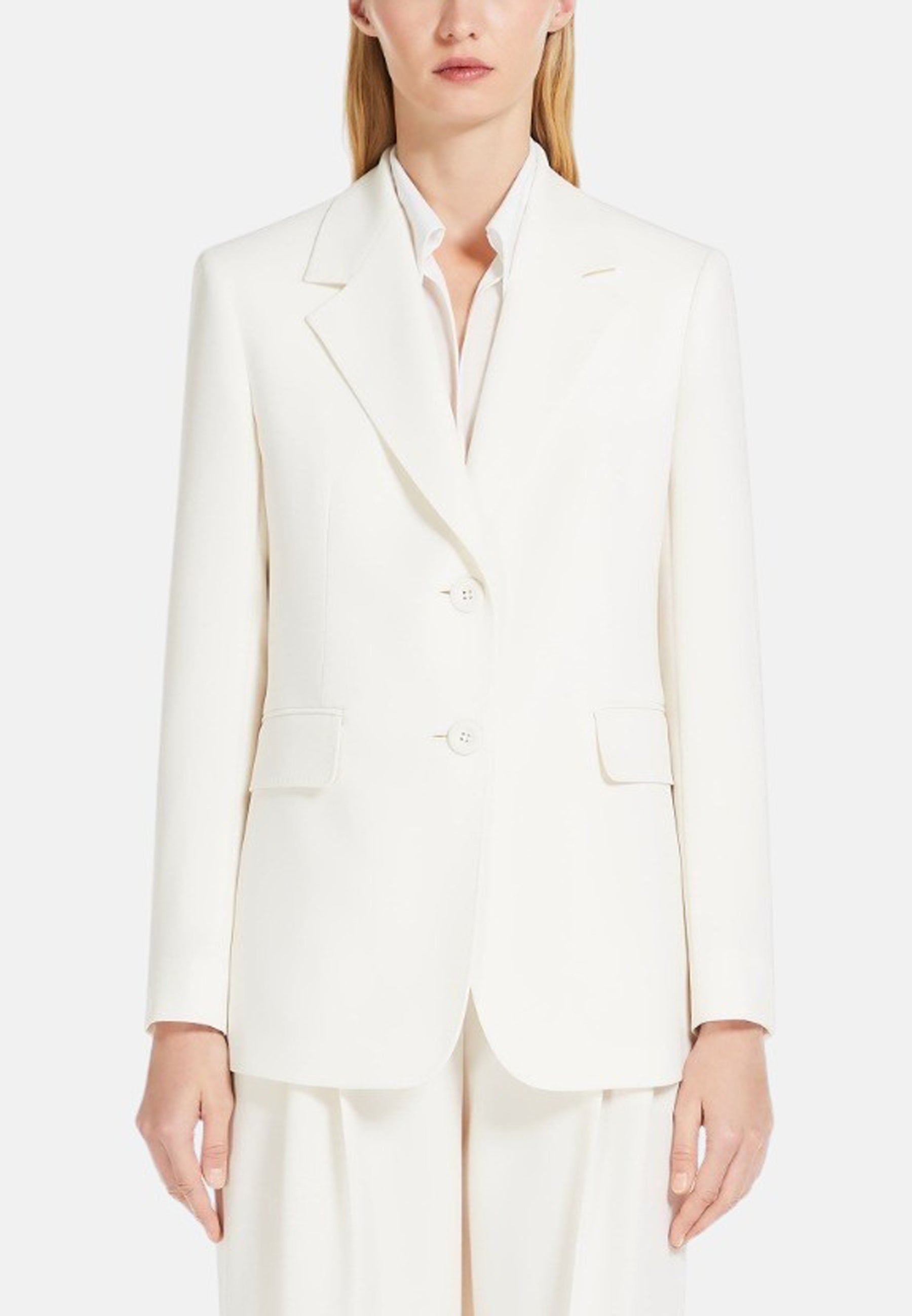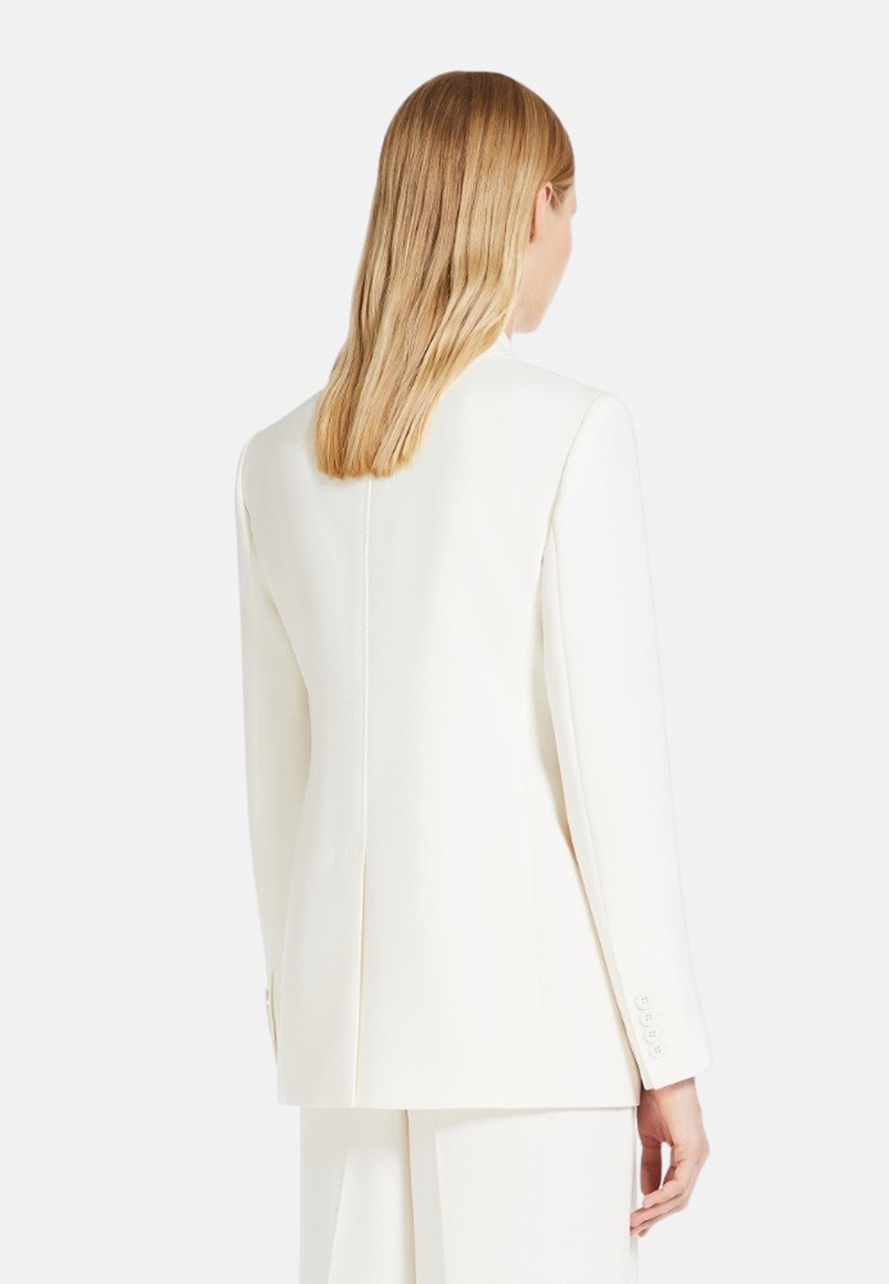 Blazer monopetto in cady, caratterizzato da una silhouette leggermente sfiancata con collo a rever, maniche lunghe a giro e tasche con patta applicate sul davanti. Modello foderato, rifinito con spacco centrale sul retro. Chiusura frontale con due bottoni.