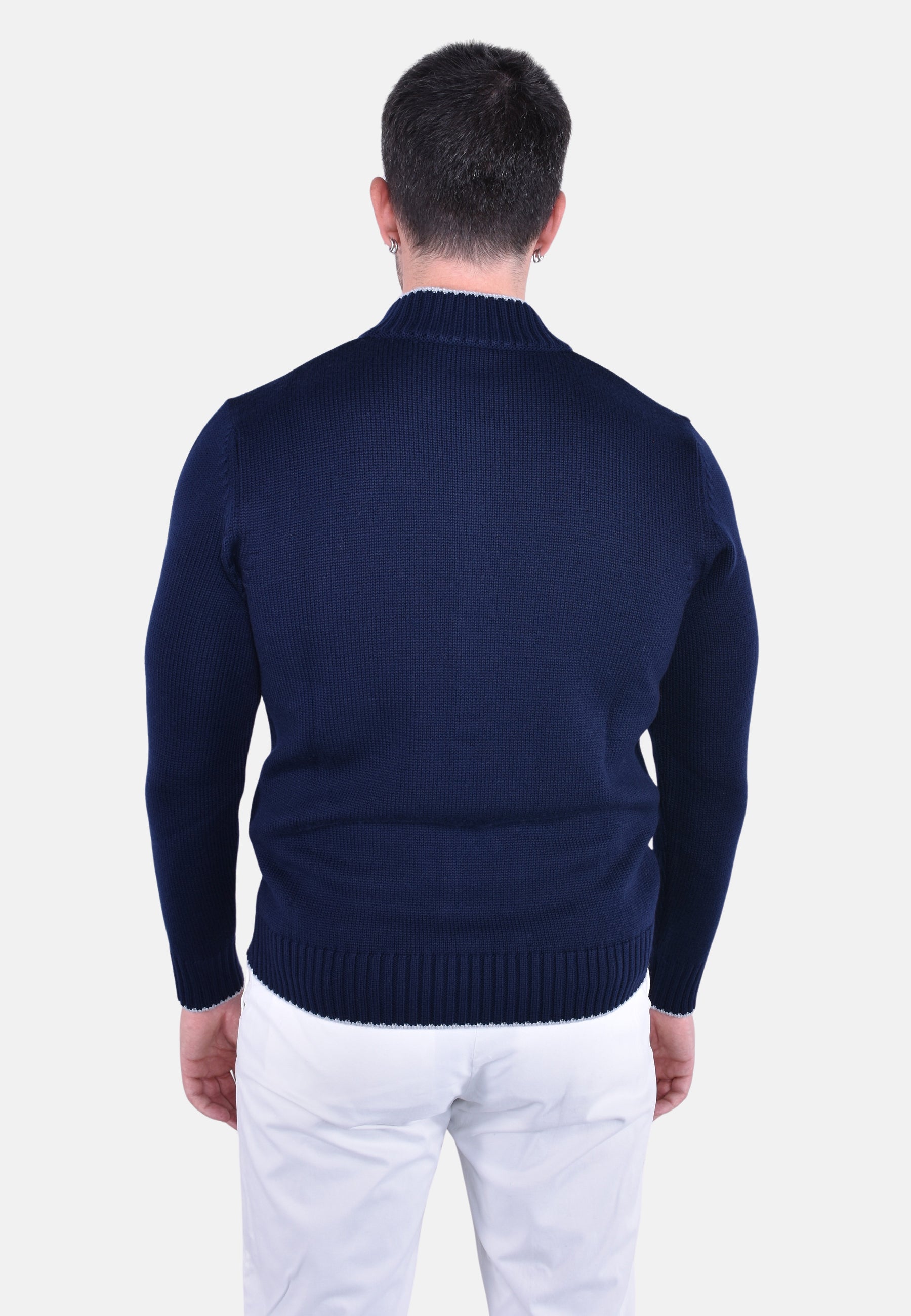 Cardigan collo in piedi in calda lana, finezza 5. Bottoni in corno moro e tipping sul collo, fondo e polsi per un capo dal sapore sportivo. Vestibilità regolare.