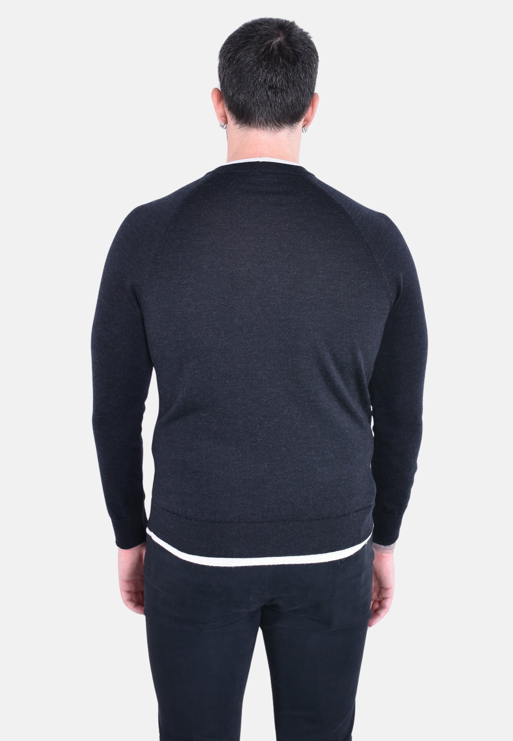 Maglia girocollo in calda lana, finezza 5. Doppio collo, manica raglan e vestibilità regolare, per un capo dal sapore sportivo.