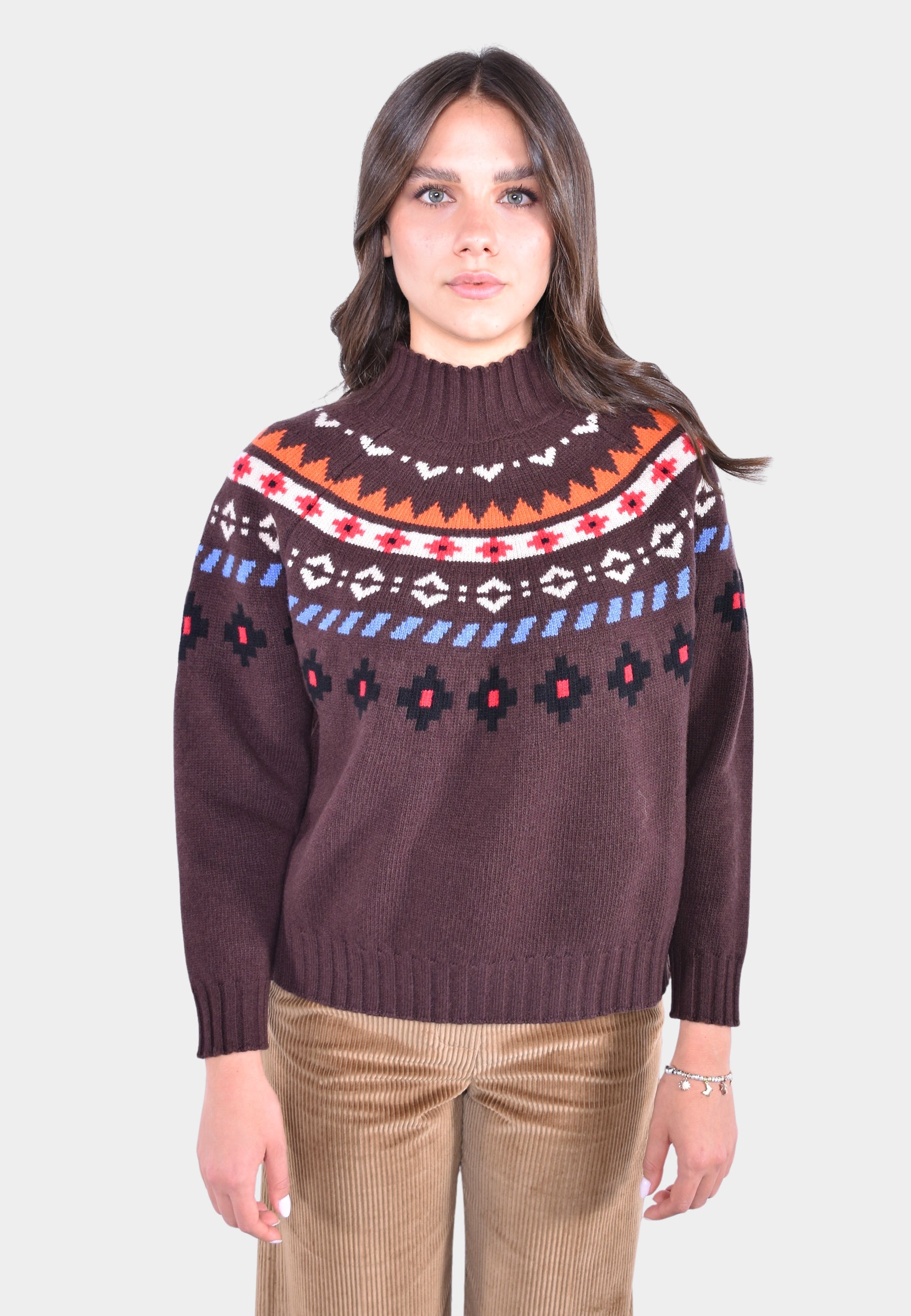 Maglia pullover caratterizzata da una lavorazione jacquard che disegna su tutto lo sprone una fantasia a contrasto.