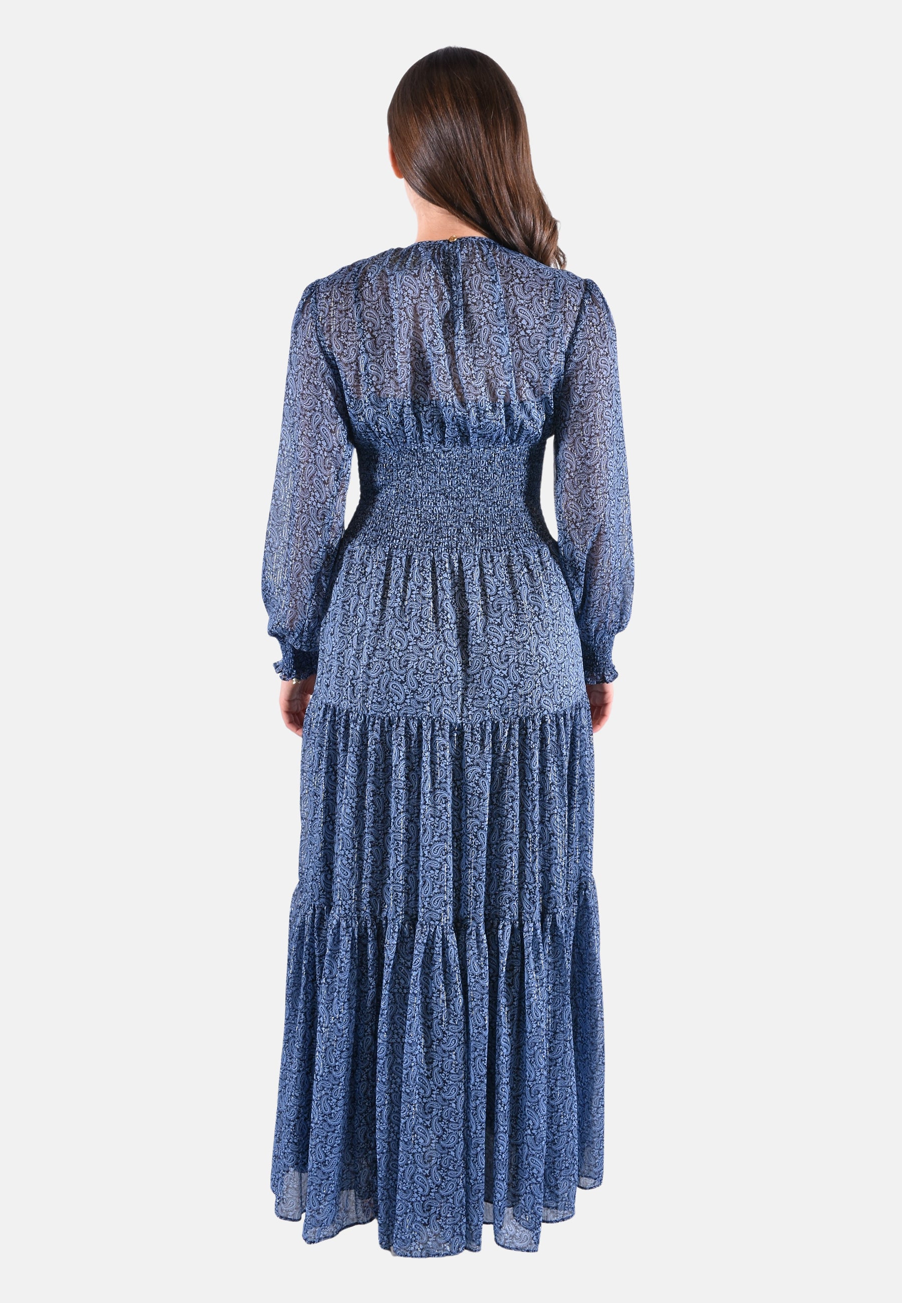 Il motivo paisley valorizza questo maxi abito in georgette. L'arricciatura in vita e sulle maniche definisce la silhouette casual, mentre la gonna a balze conferisce un movimento morbido. Completa il look con una borsa con frange e scarpe con tacco per un fascino bohémien.