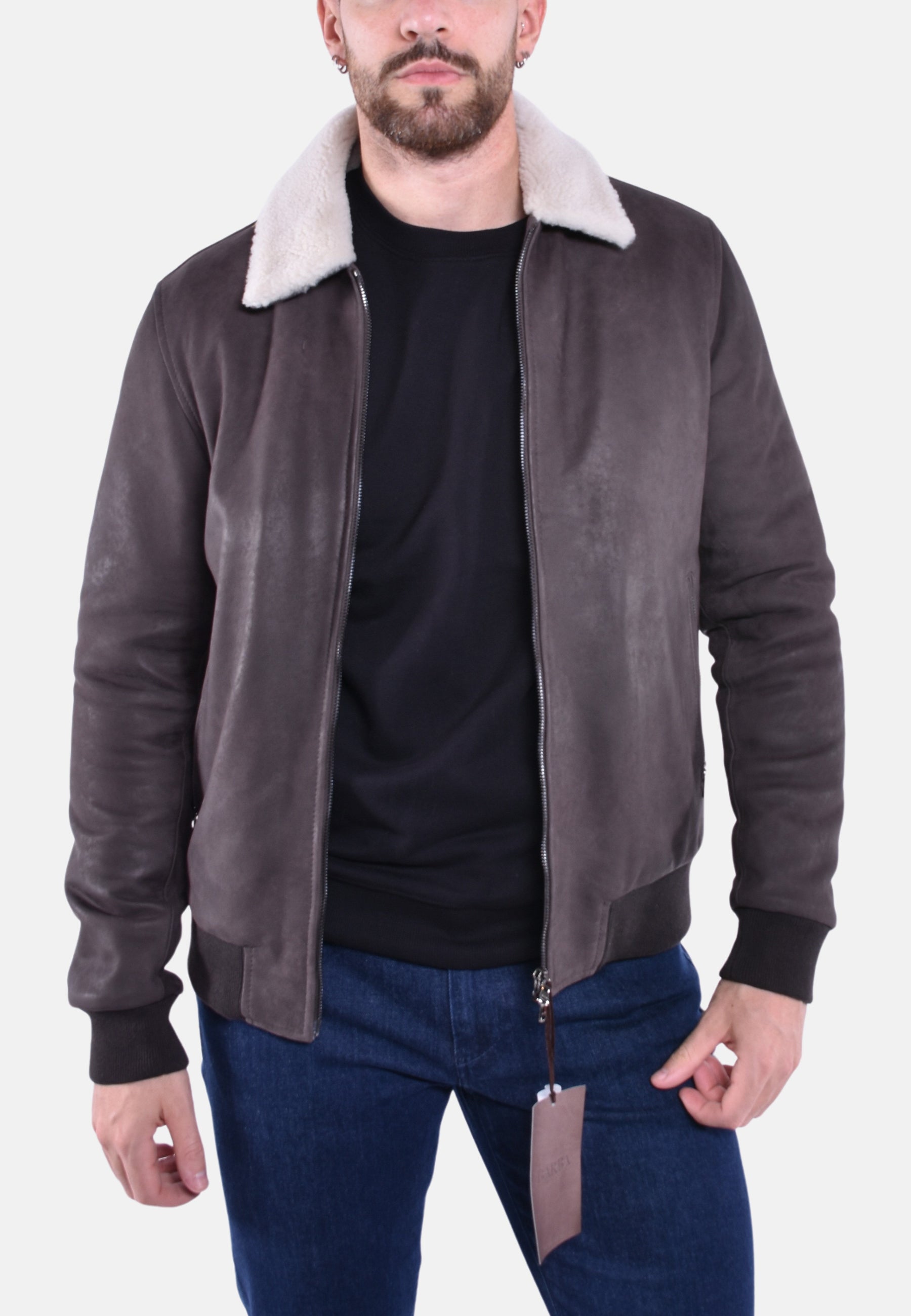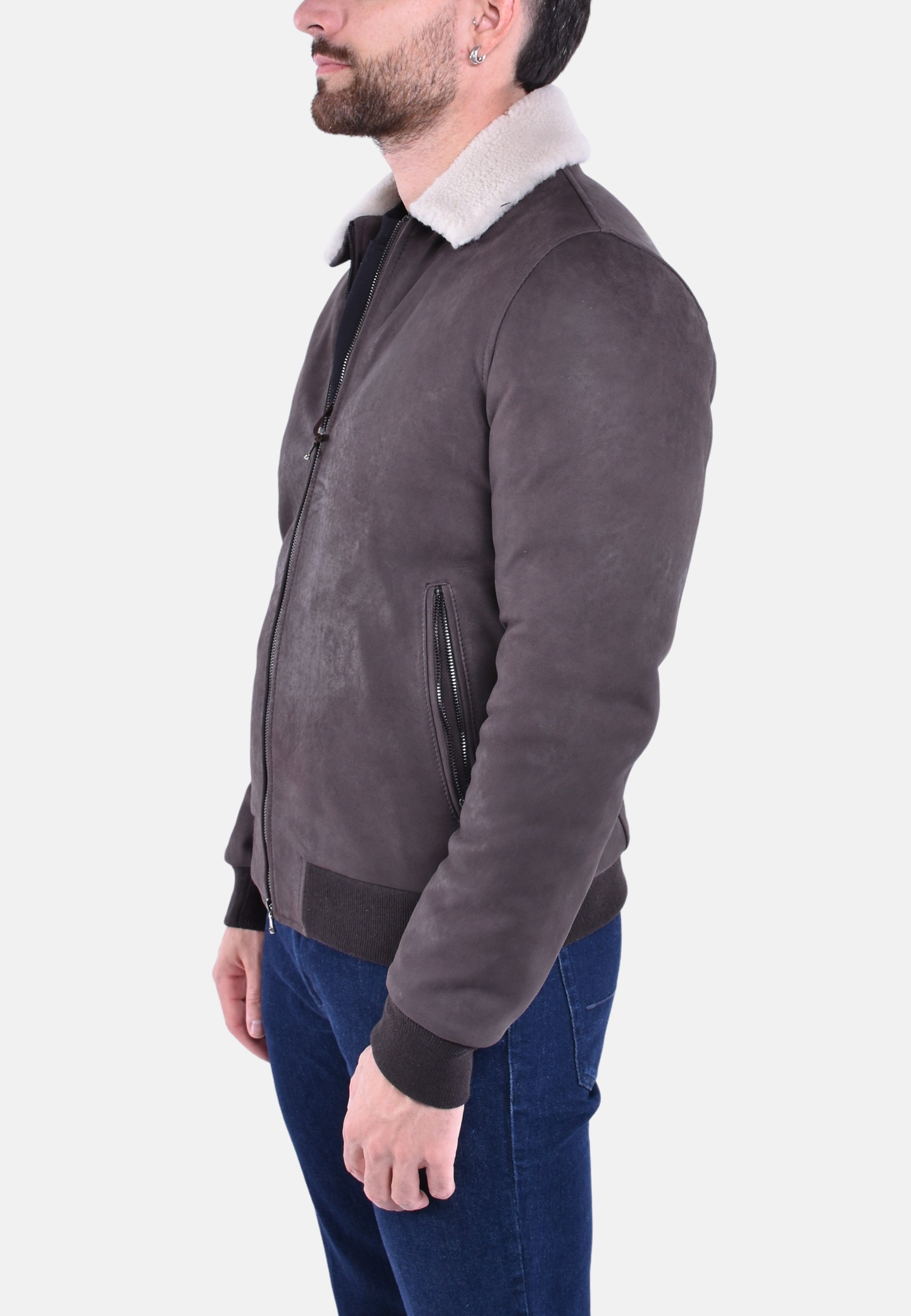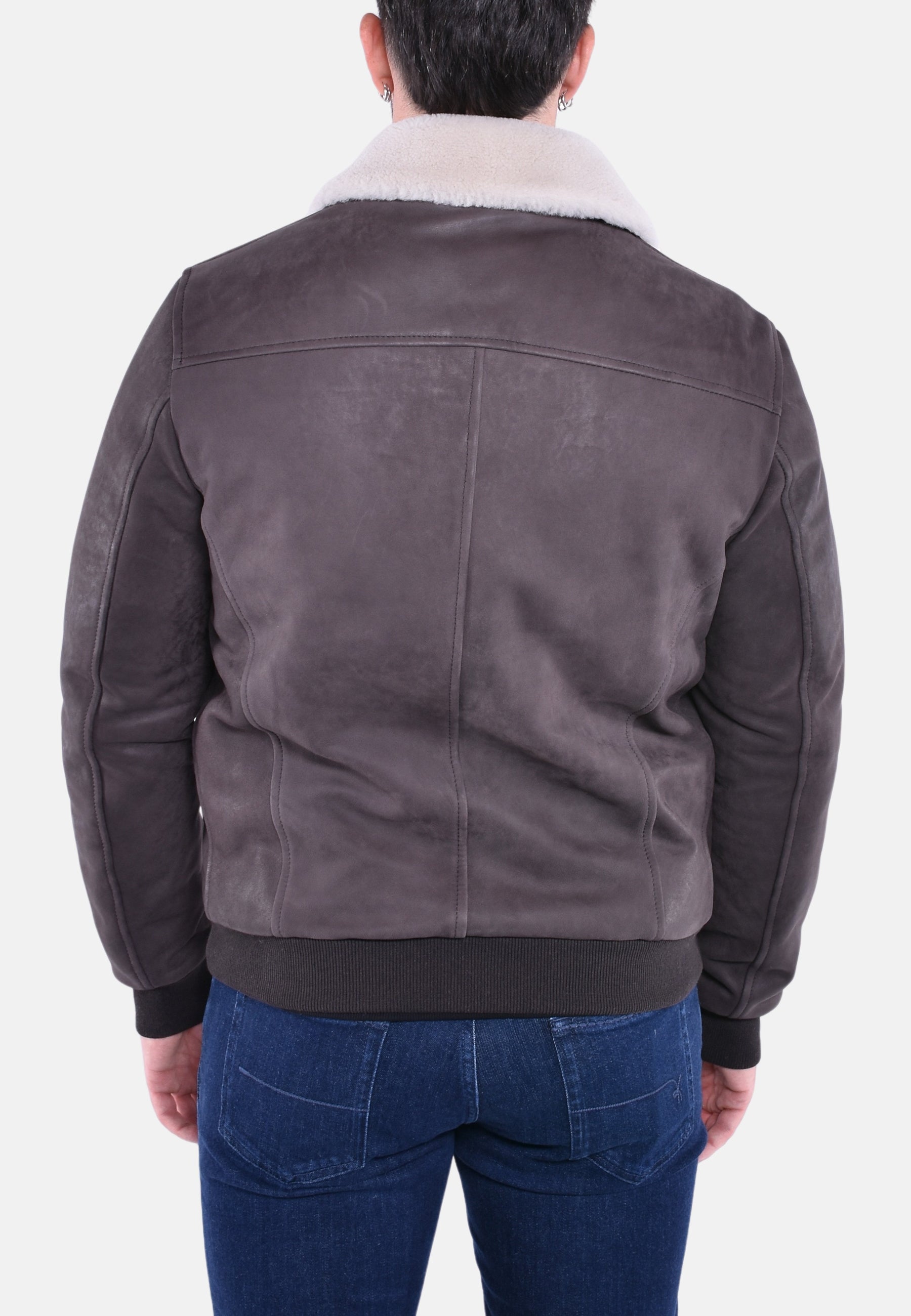Giubbotto montone in vera pelle con polsini e fondo elasticizzati, colletto in vero montone ed interno trapuntato con tasca, chiusura a zip.