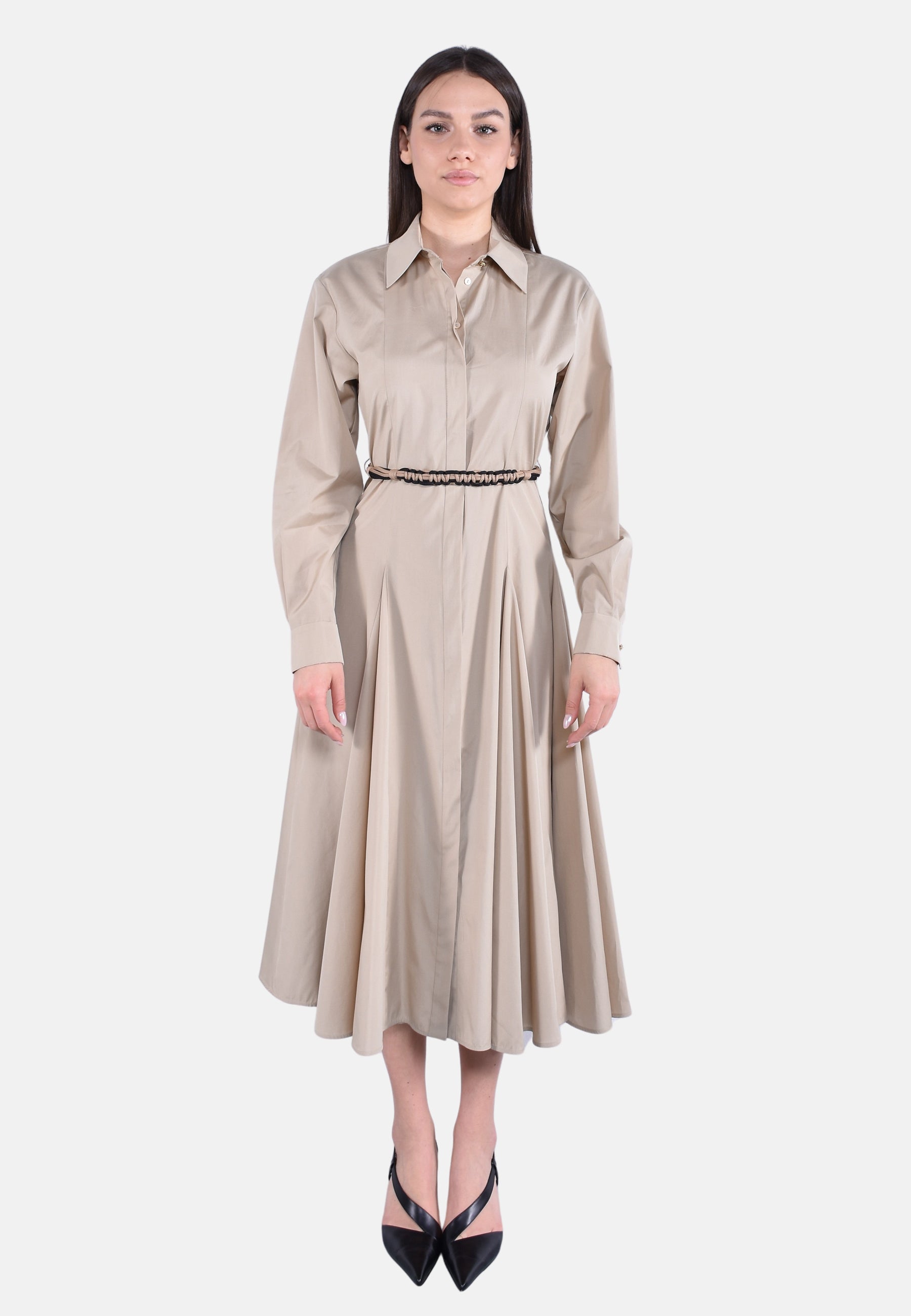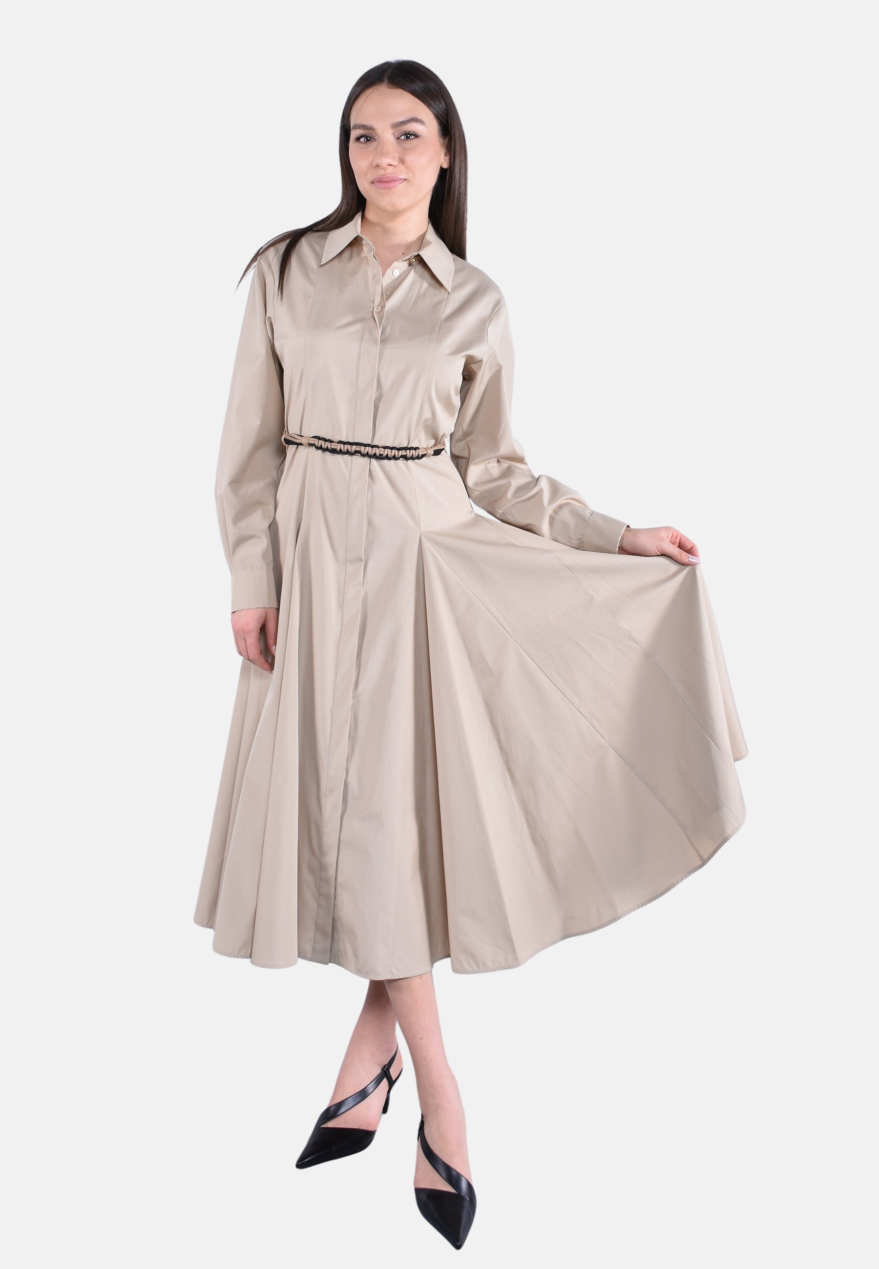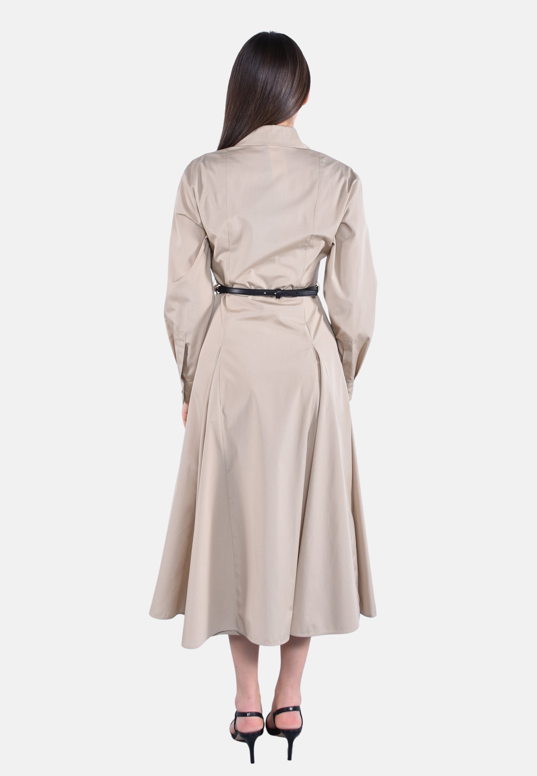 Abito lungo chemisier, caratterizzato da motivo di tagli a bretella e spicchi inseriti nella gonna per dare volume e struttura al capo.