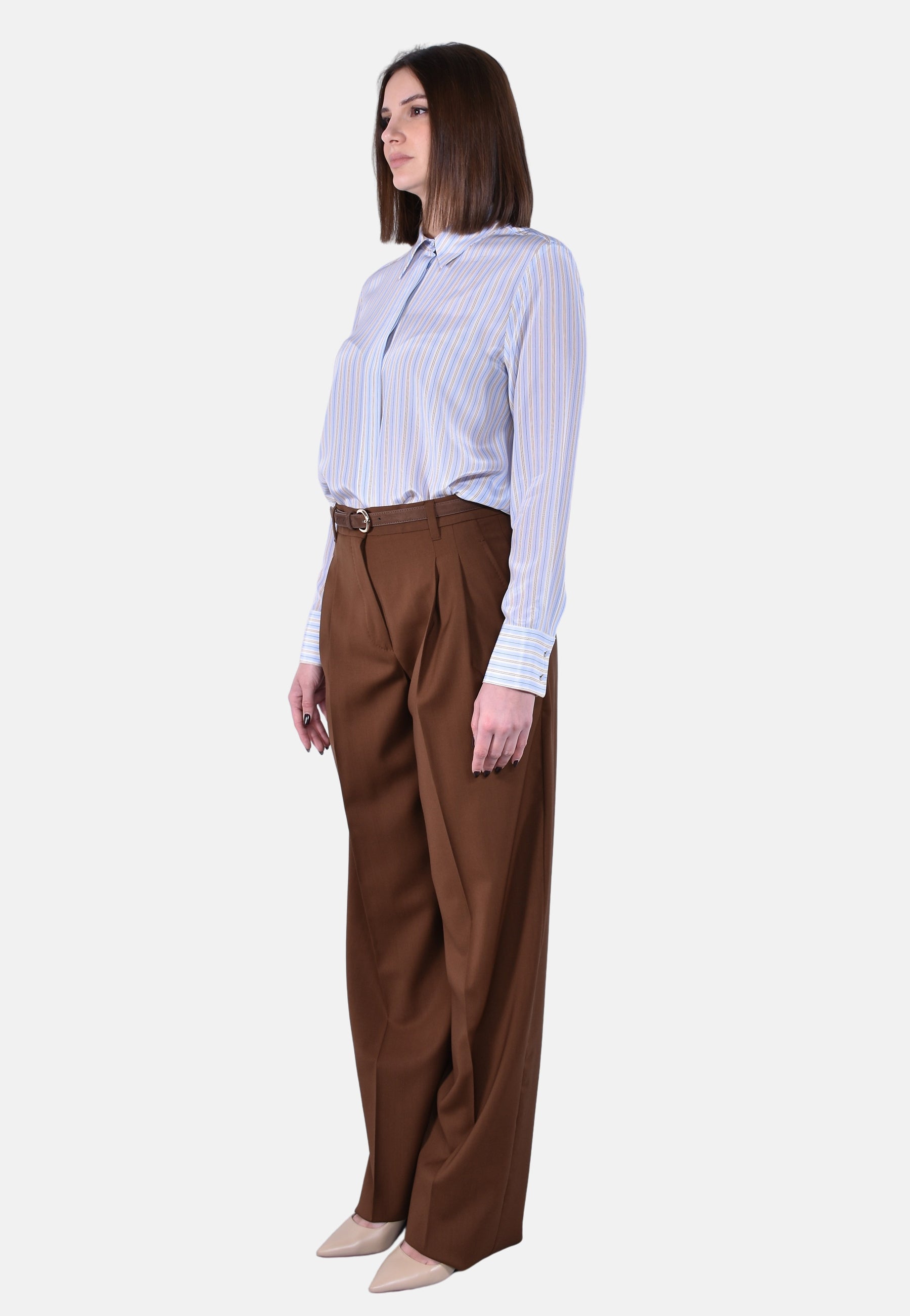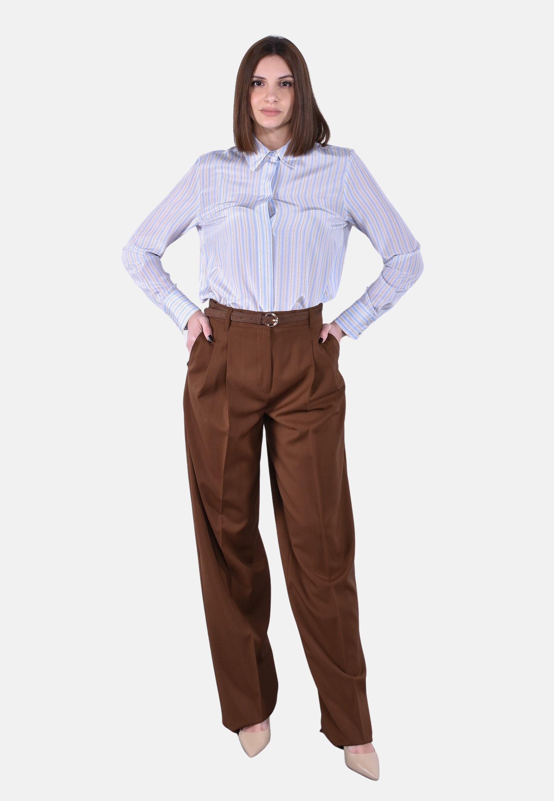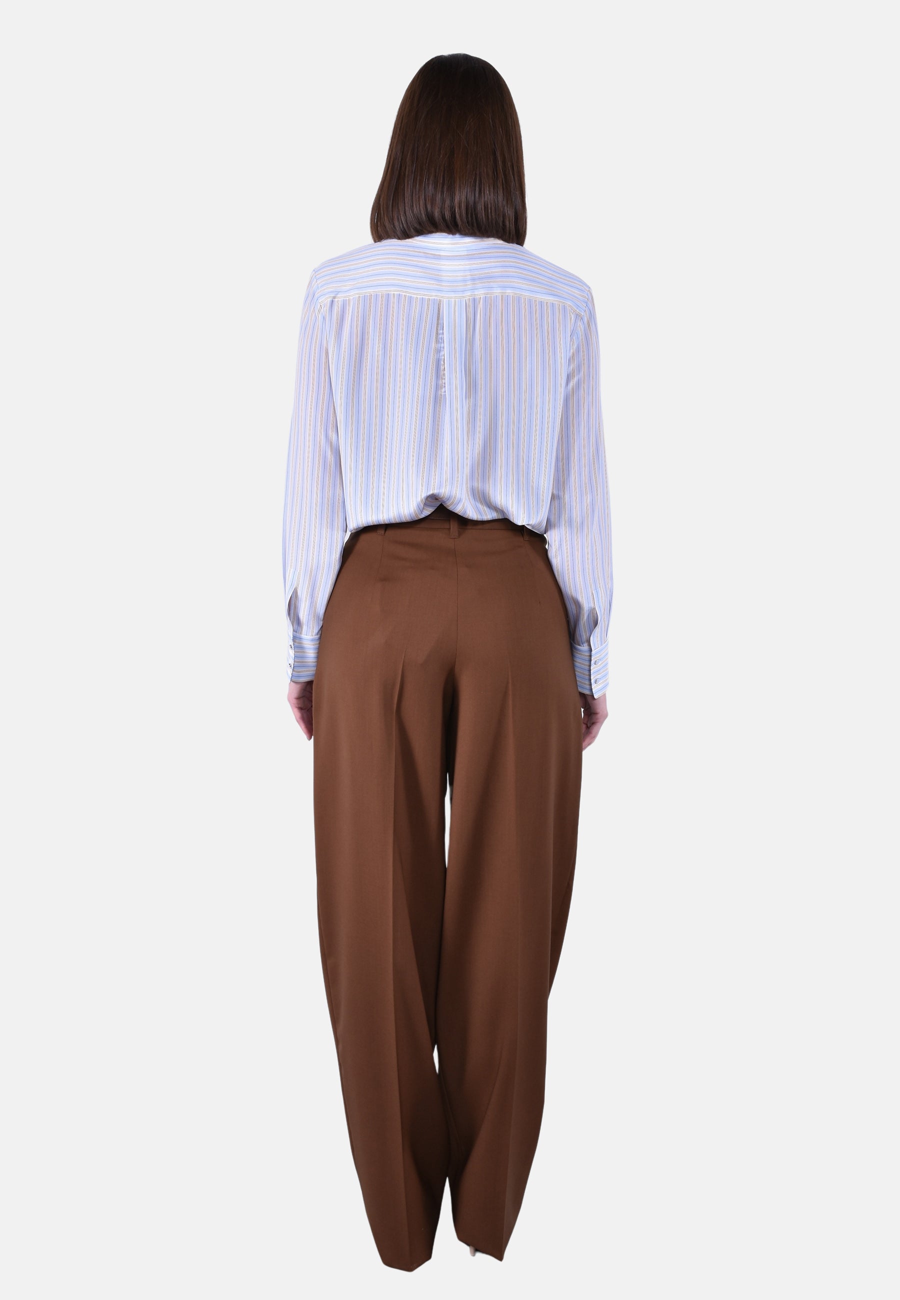 Pantalone lungo con doppia pinces in vita sul davanti, una sfumata e una fino al fondo effetto piega.