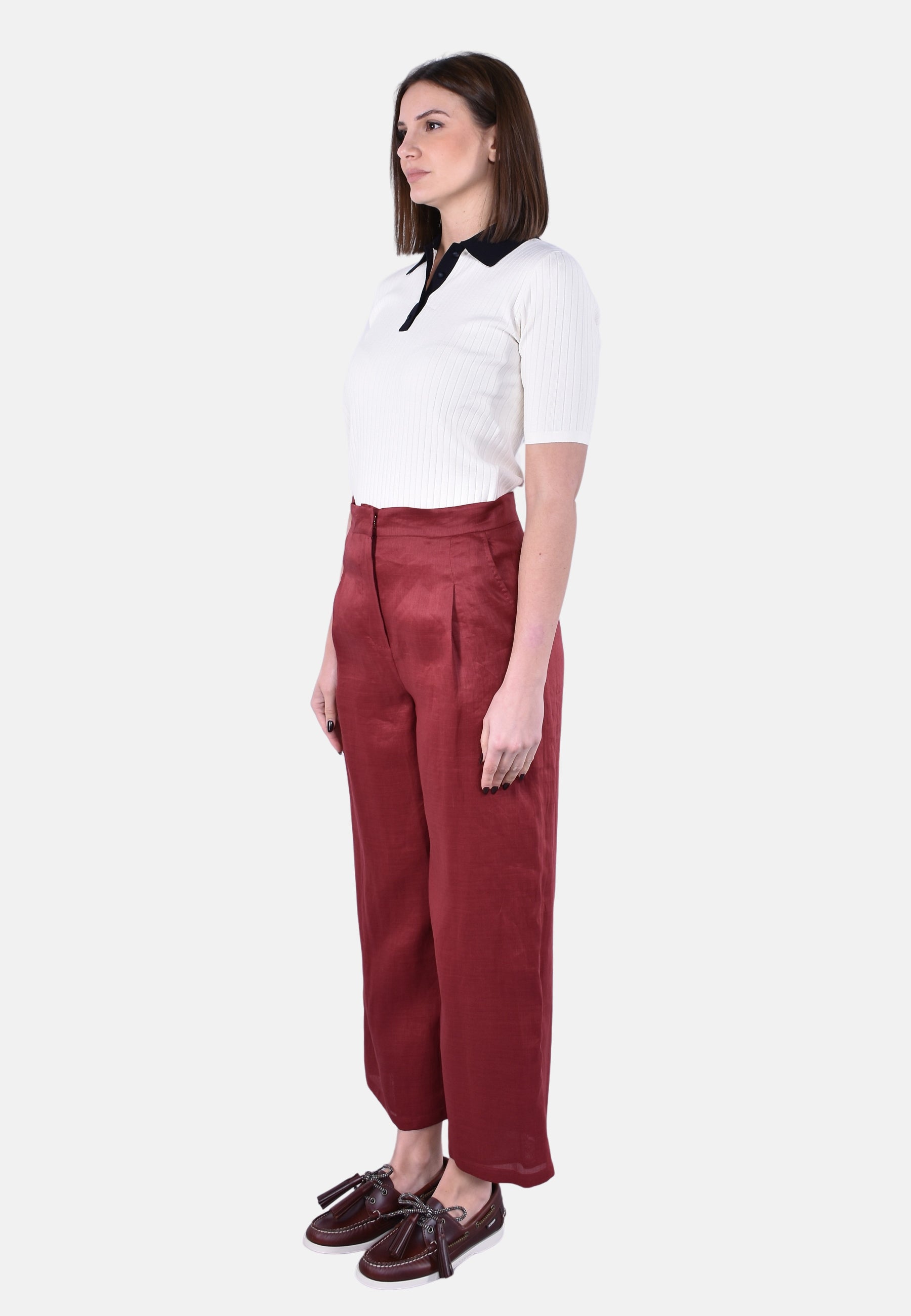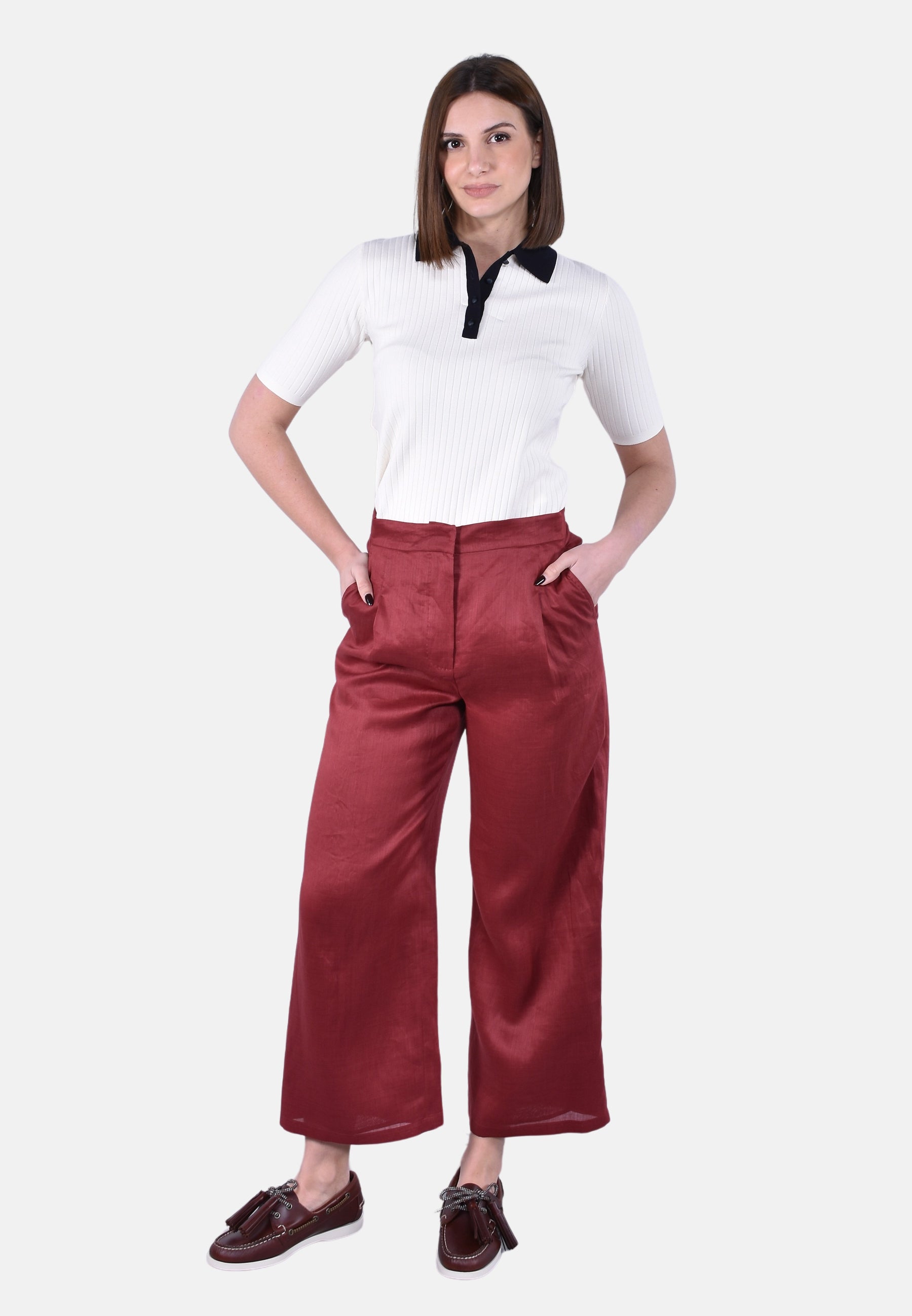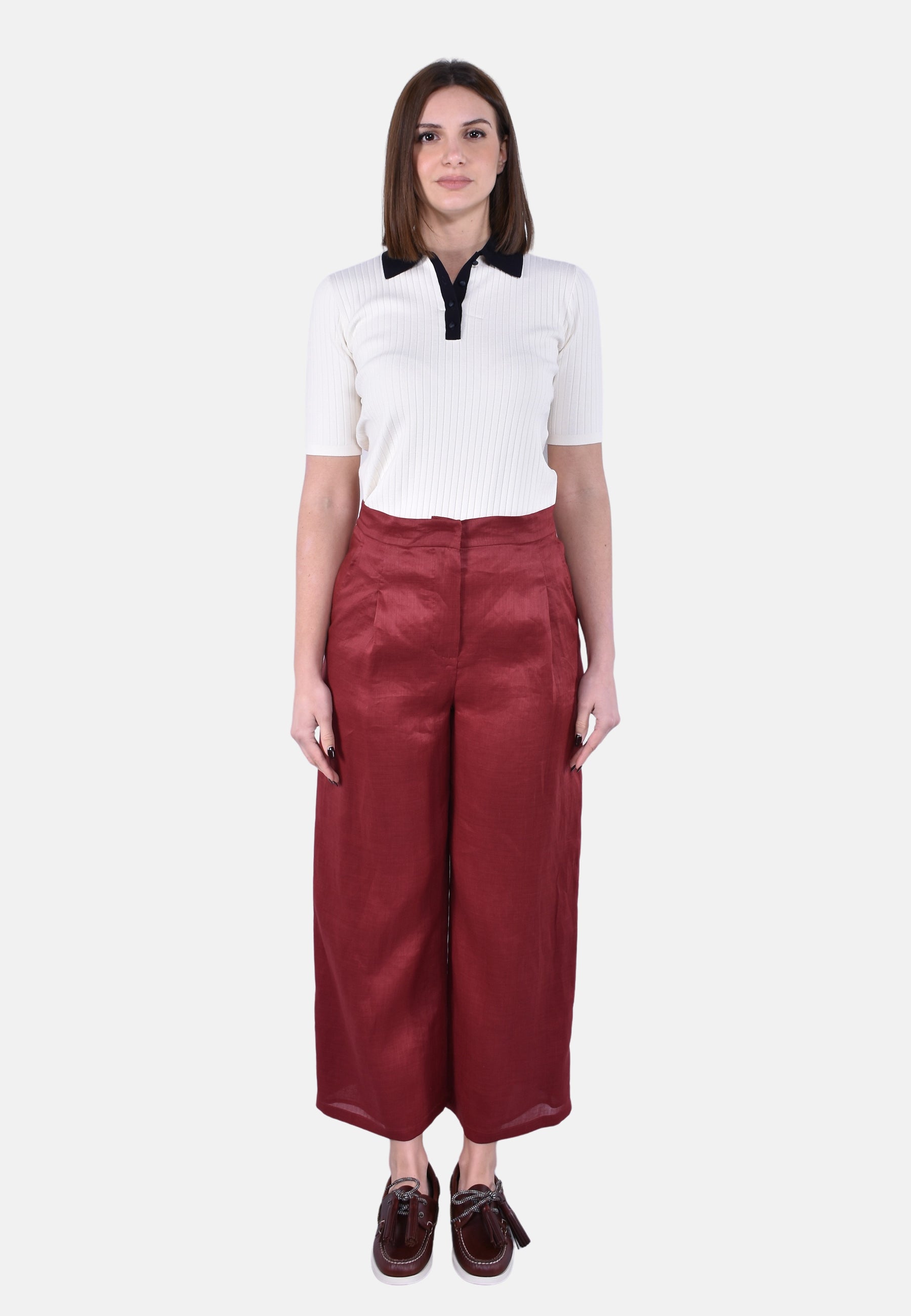 Pantalone straight leg con taglio cropped sopra la caviglia.