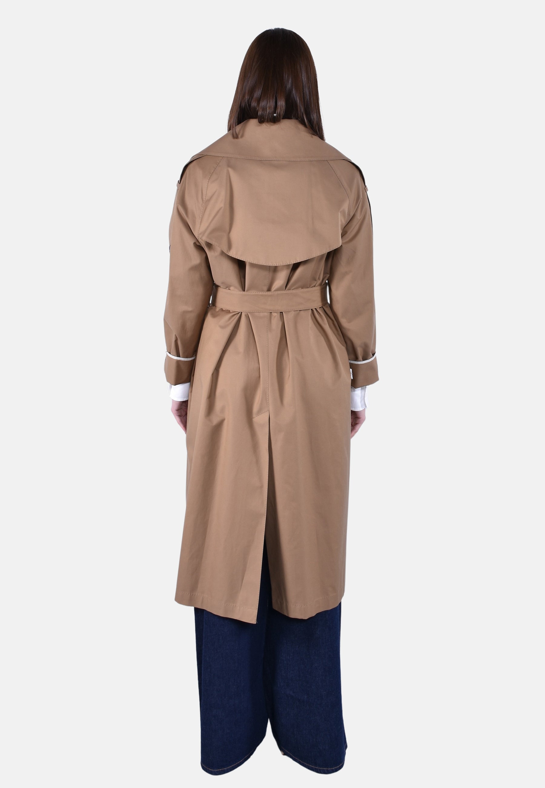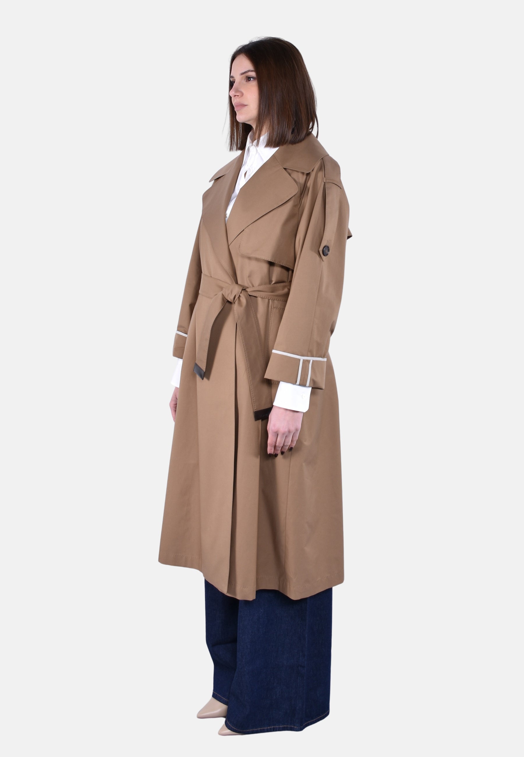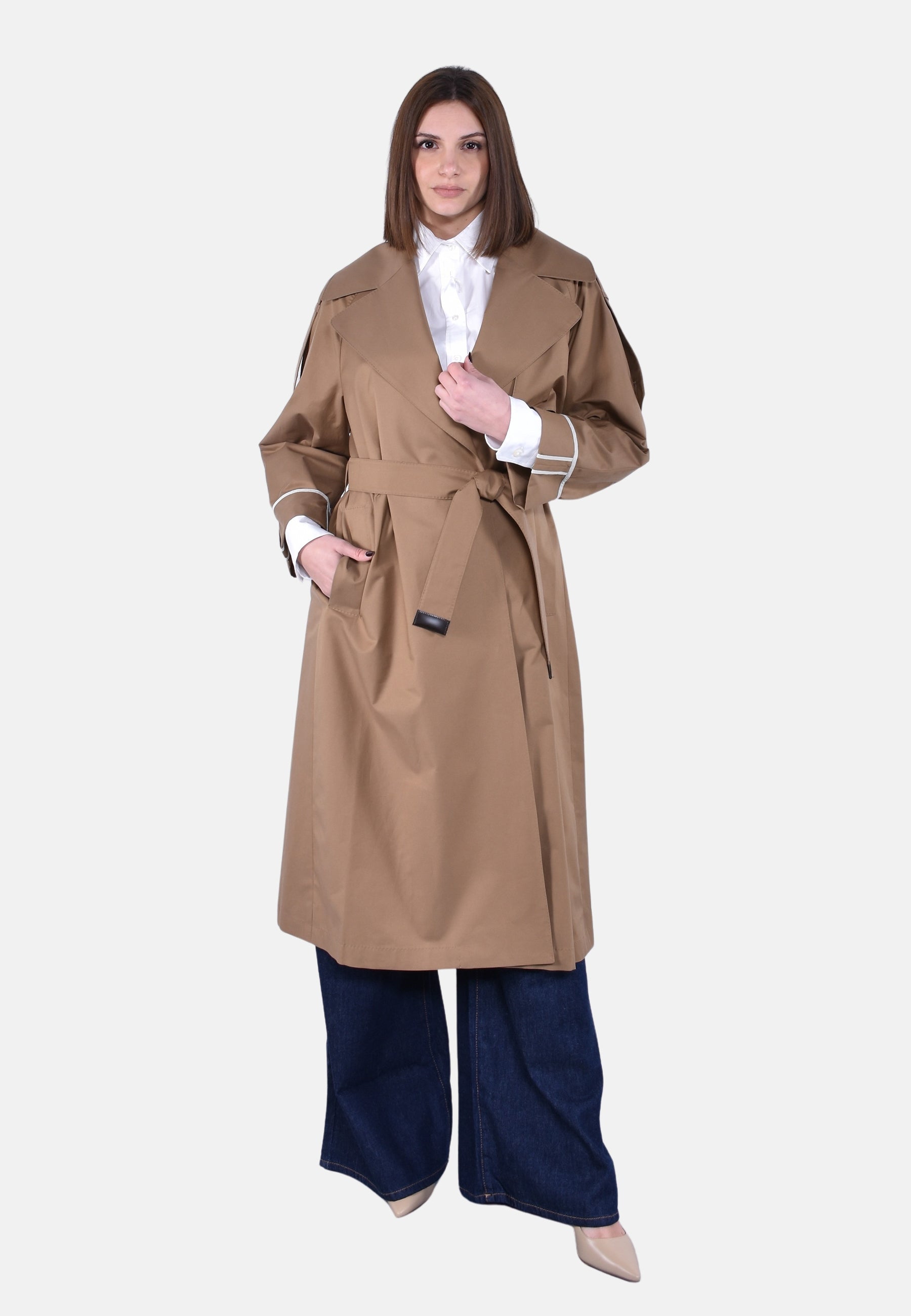 Trench lungo a vestaglia con cintura abbinata personalizzata, puntino sartoriale e bavolet frontale sul lato sinistro.