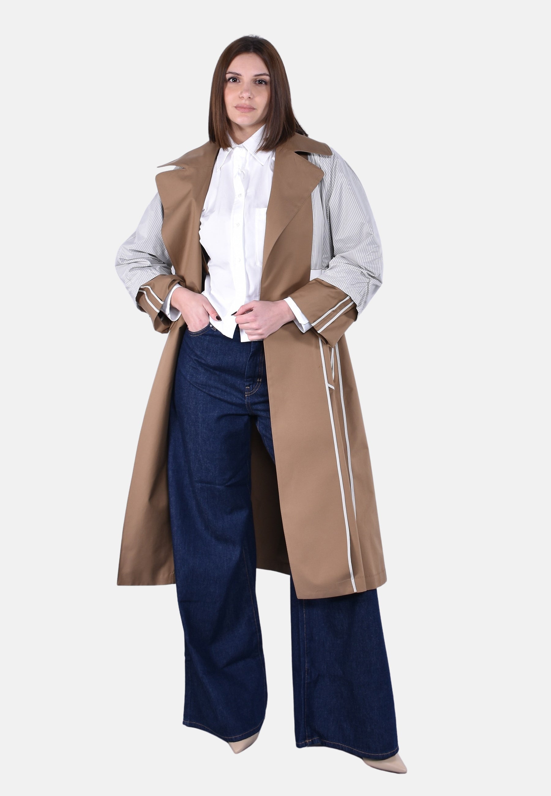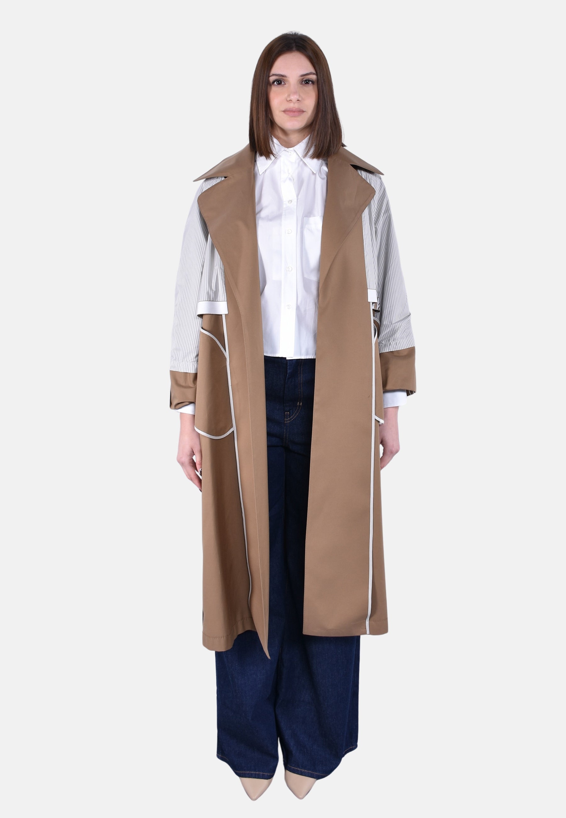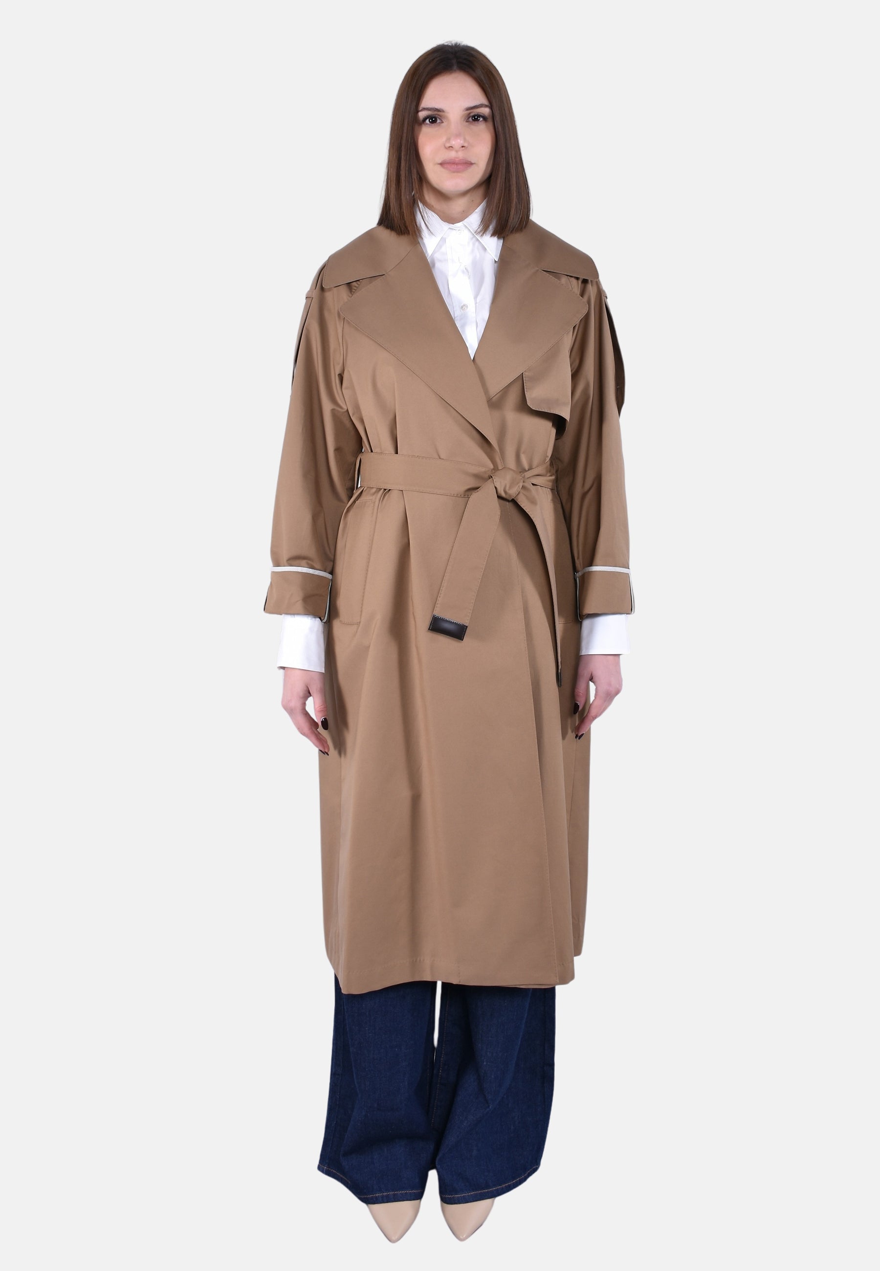 Trench lungo a vestaglia con cintura abbinata personalizzata, puntino sartoriale e bavolet frontale sul lato sinistro.