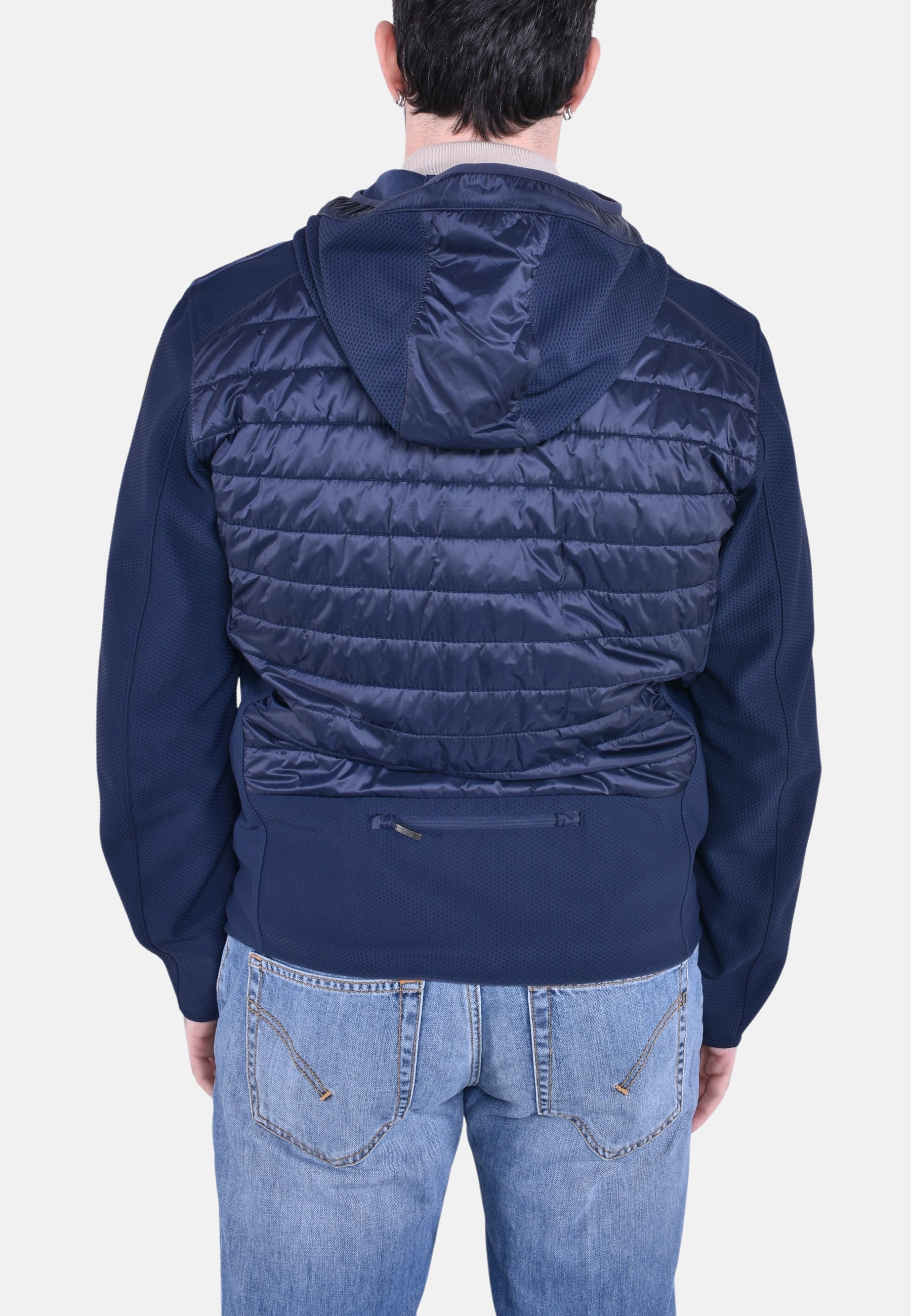 Nolan è un capo ibrido con cappuccio, appartenente all'iconica famiglia Warm Up, che abbina un nido d'ape elasticizzato di poliestere a un taffetà di nylon semi lucido, imbottito in poliestere.